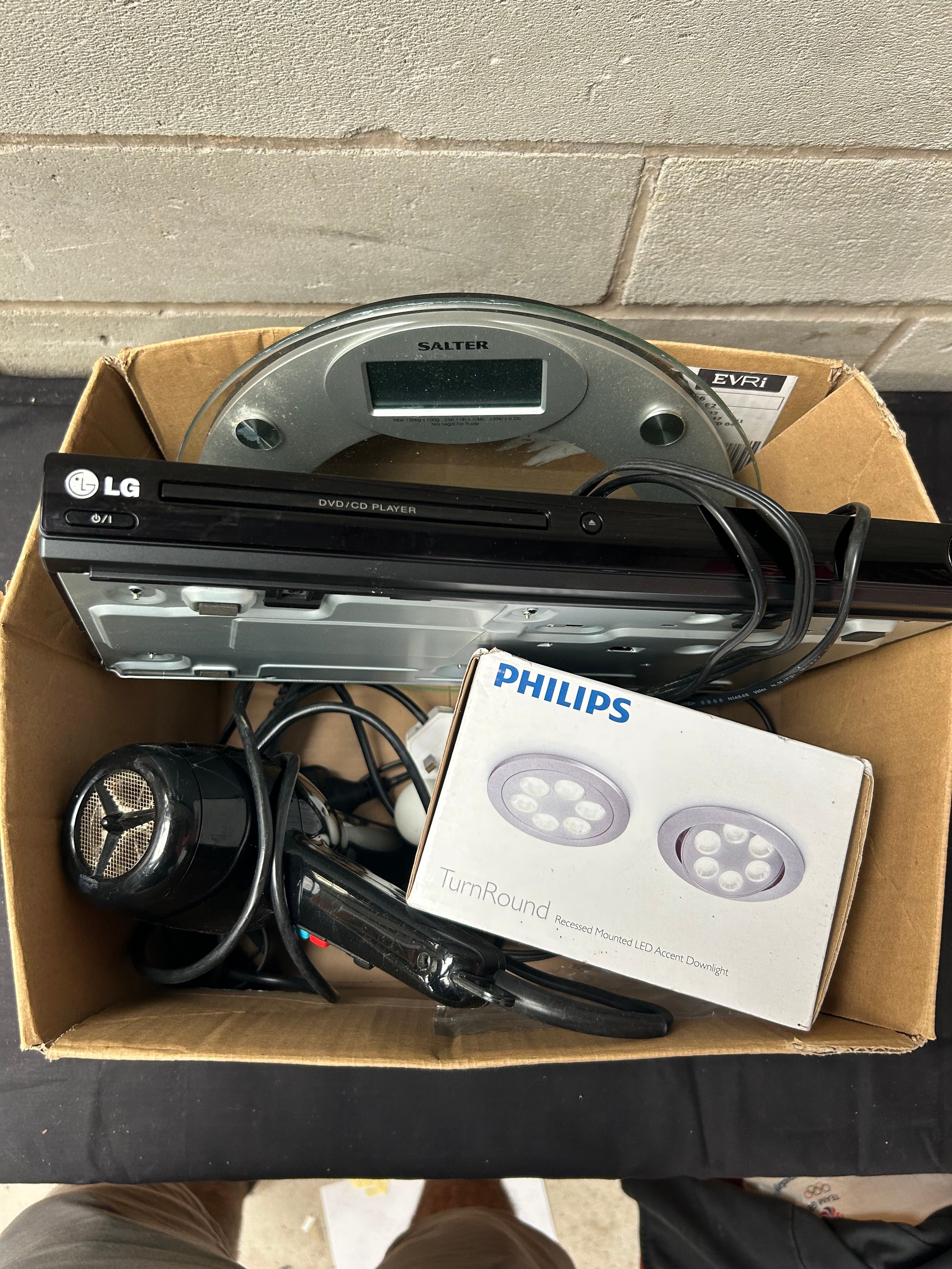 Box Of Homeware Items Etc, Including Scales, Hairdryer.