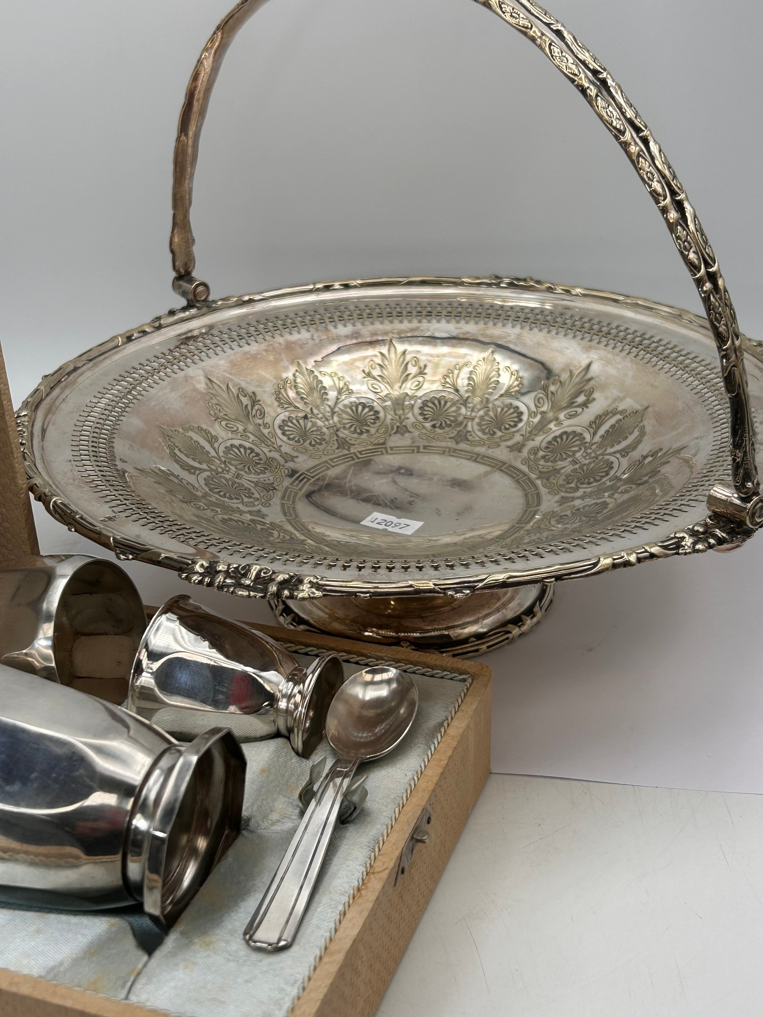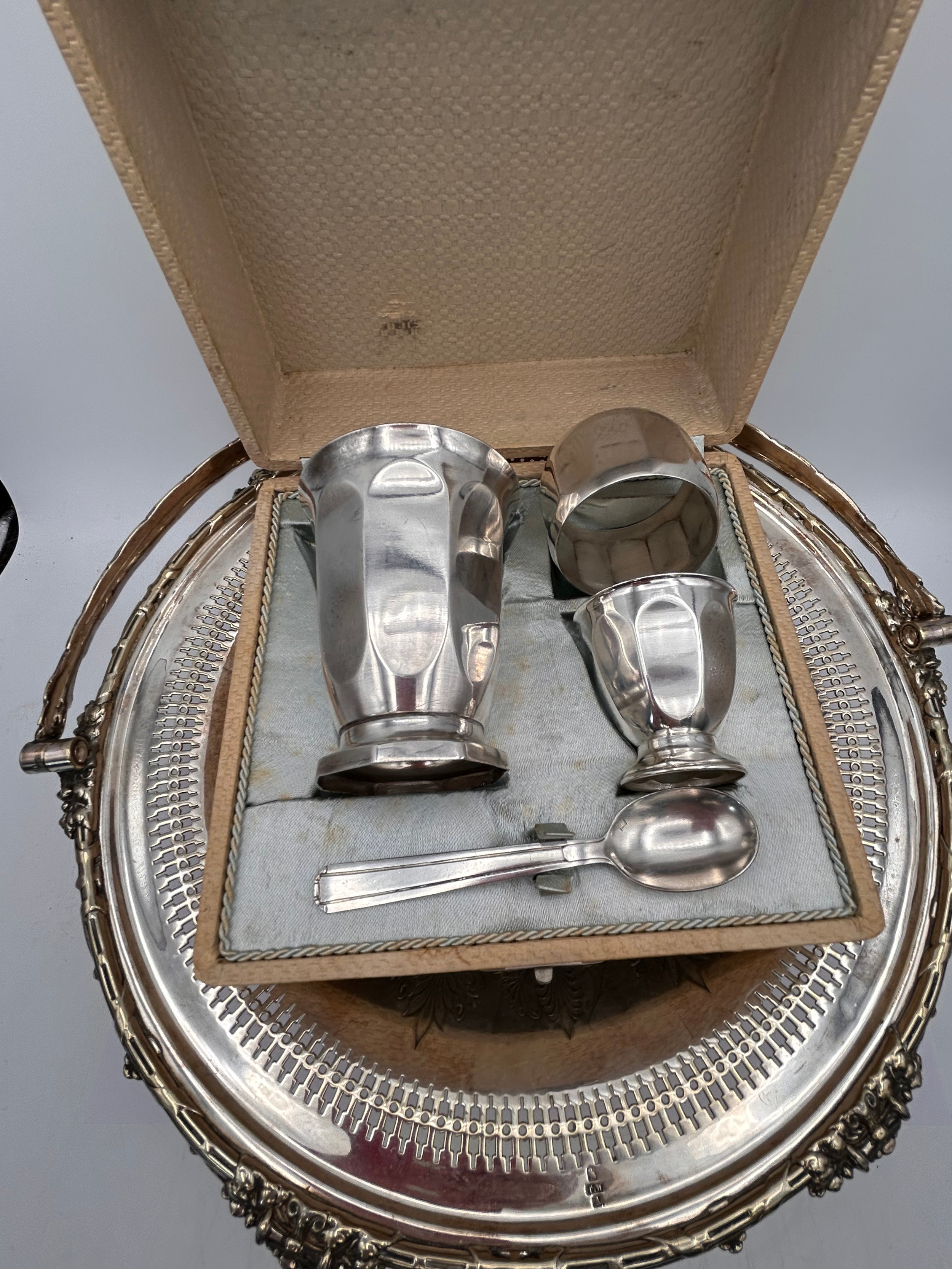 Boxed White Metal Christening Set Along With Plated Dish.