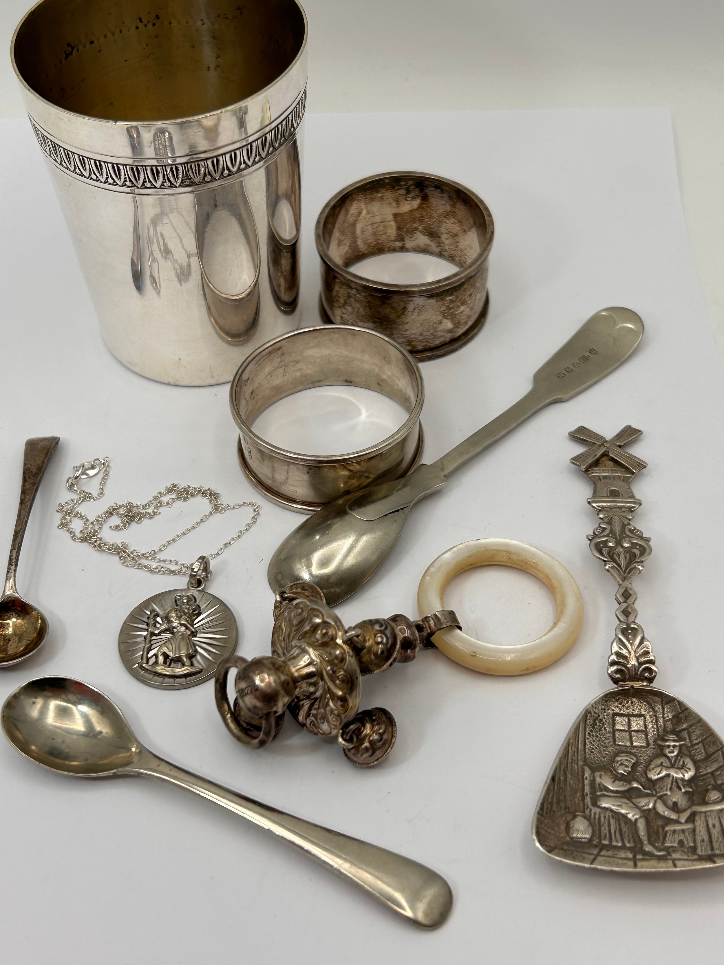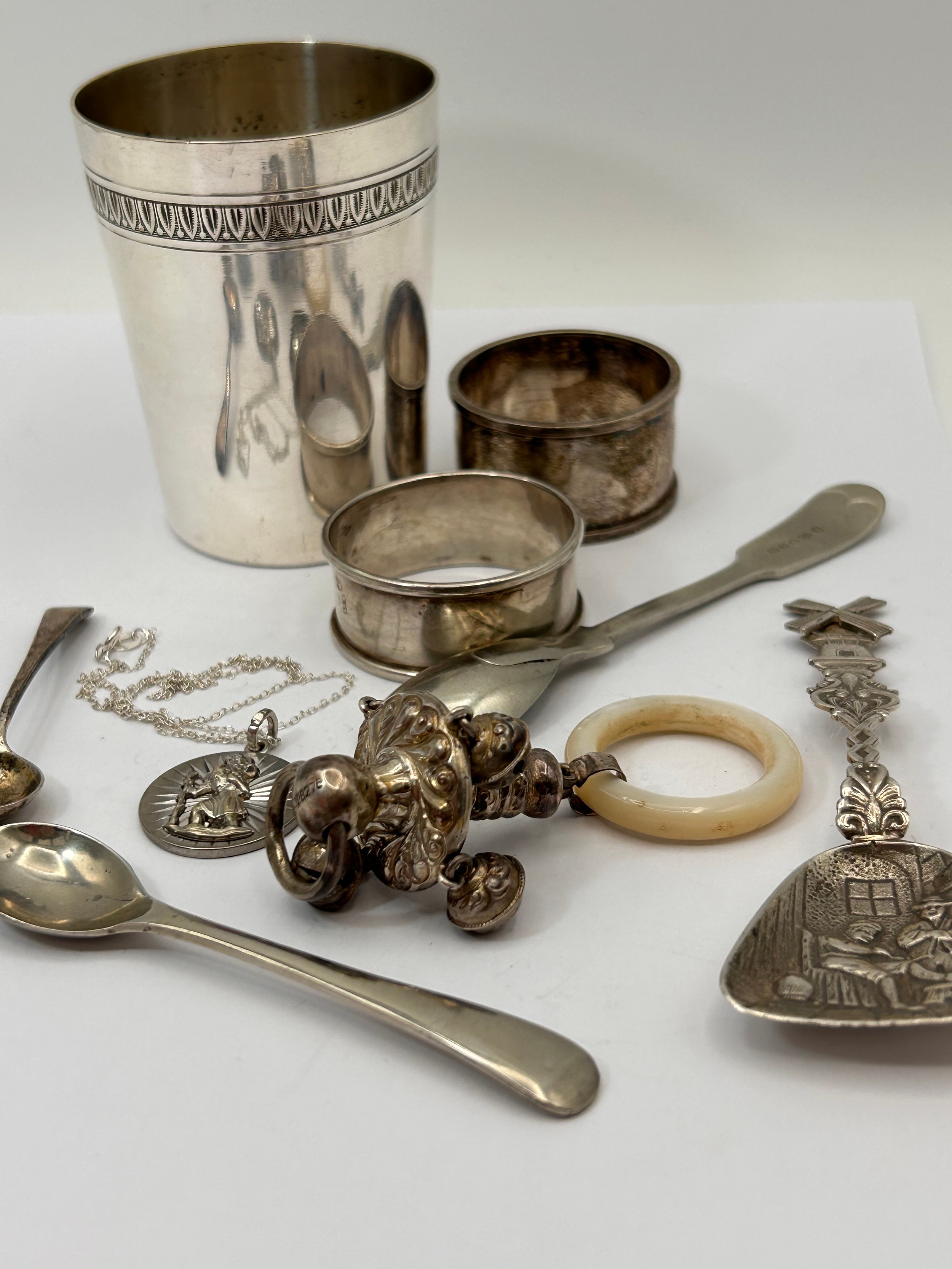Collection Of White Metal Items Including Baby’s Rattle.