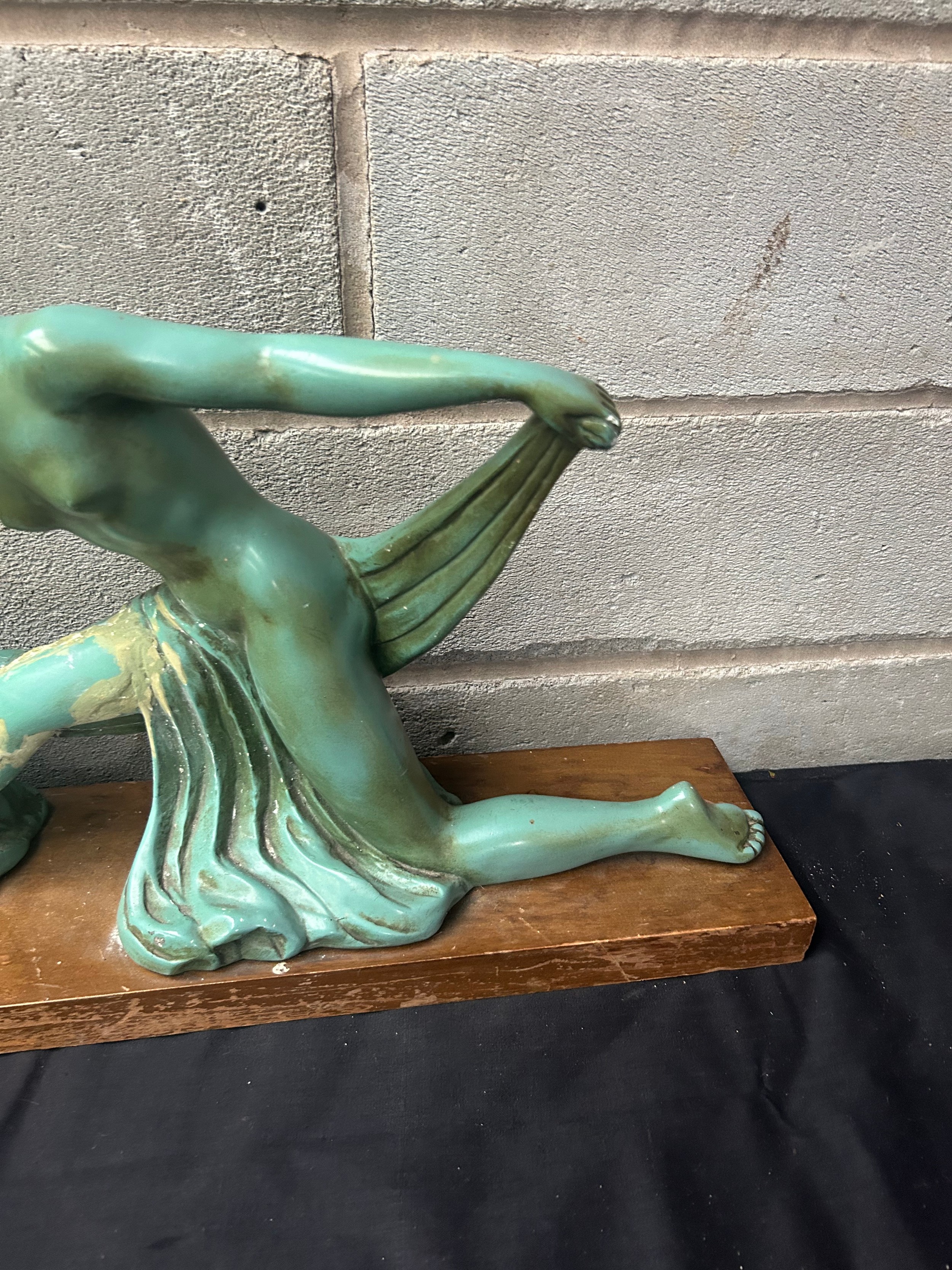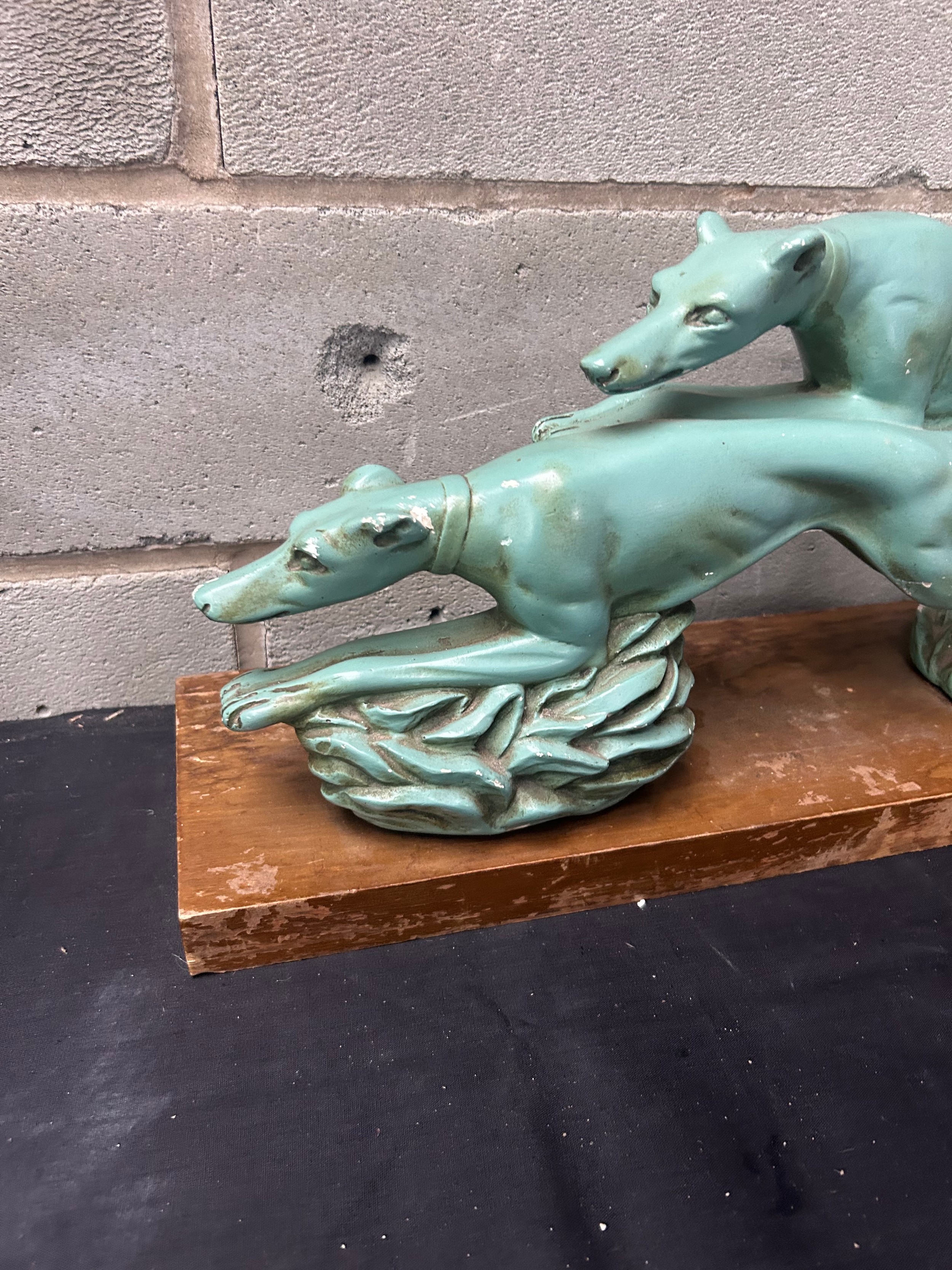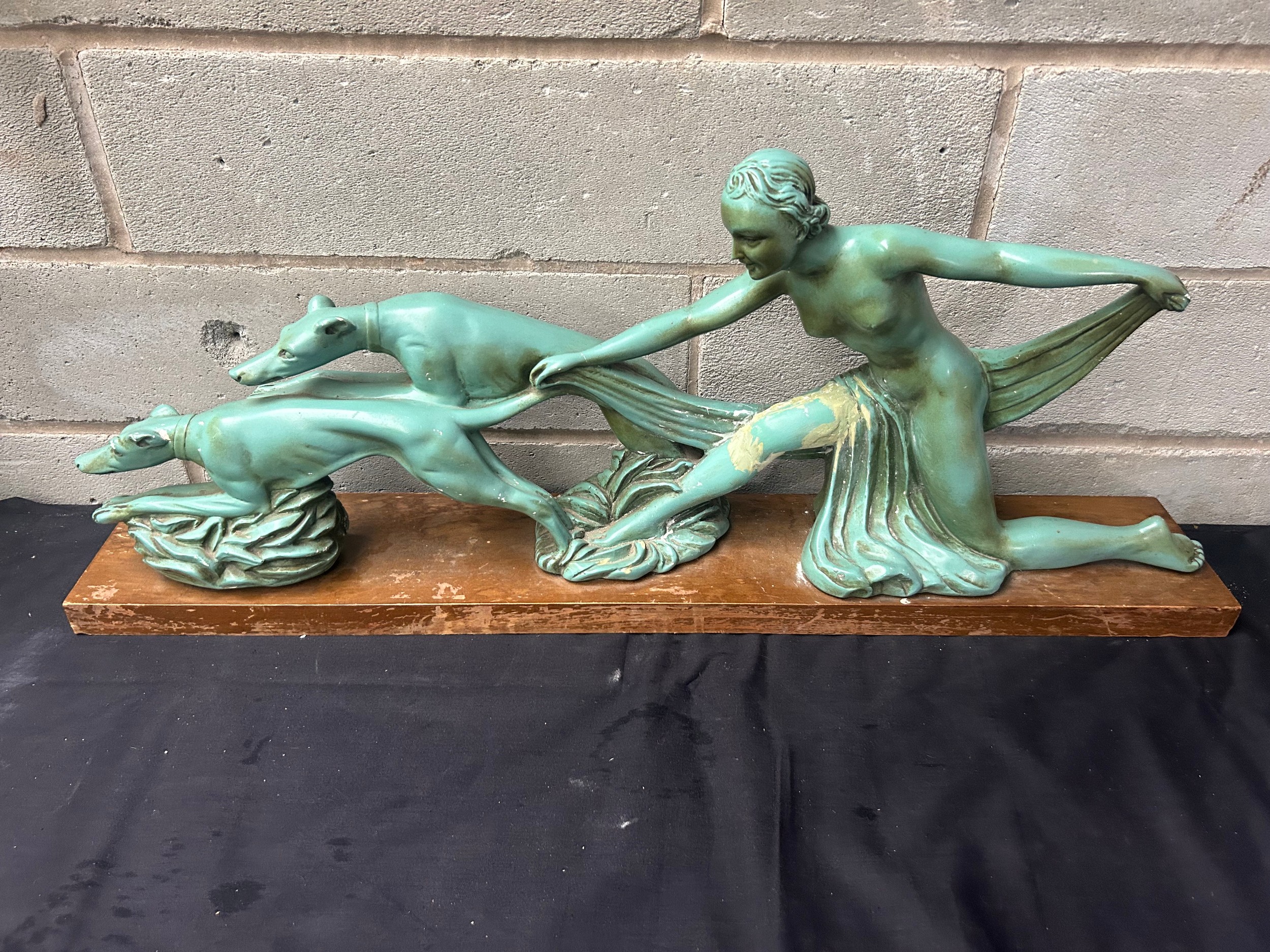 Art Deco Large Lady And Greyhound’s Ceramic Figure 32" x 14".