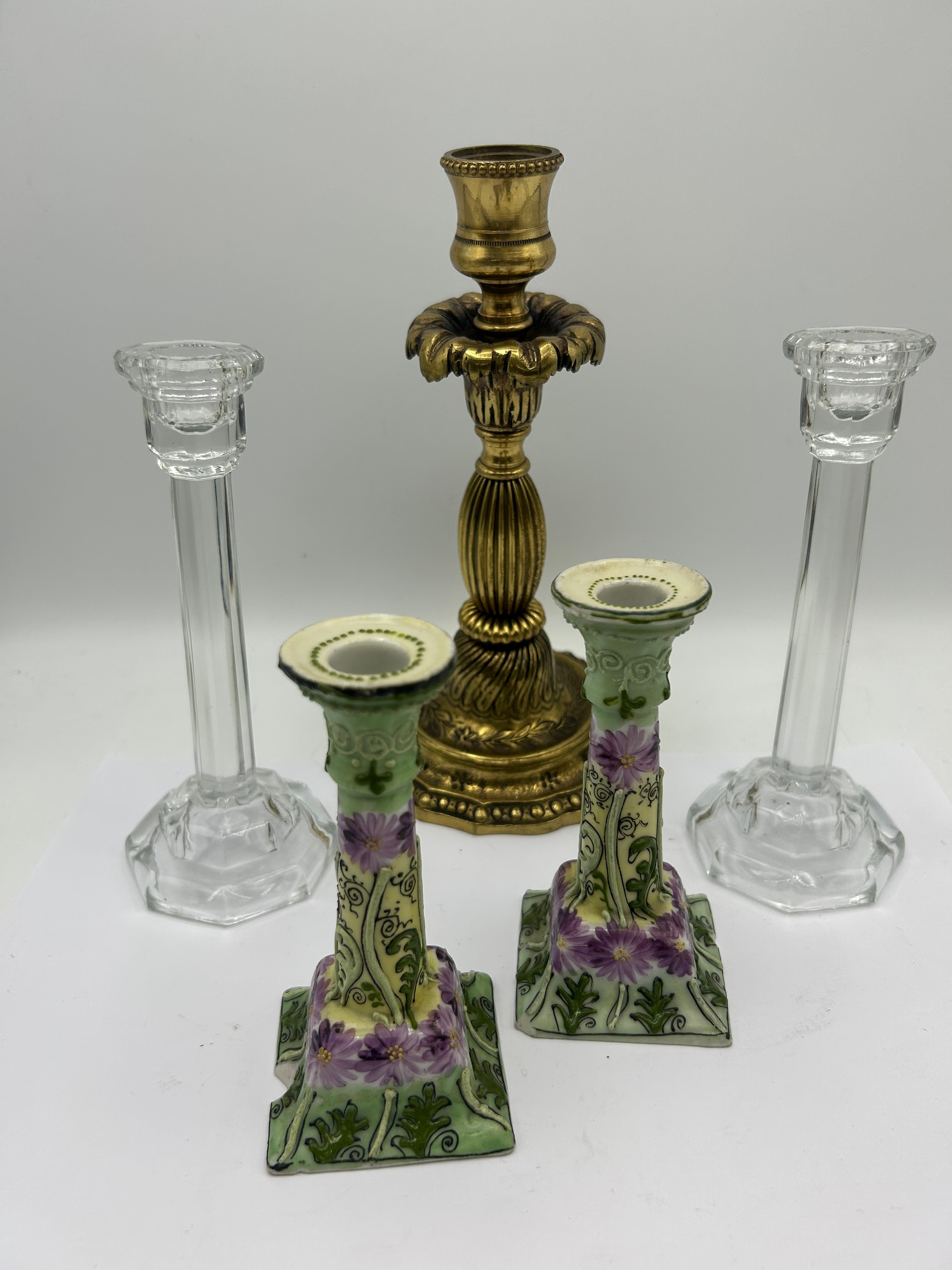 Variety Of Candlesticks Including Brass, Floral Design, Tallest Standing 8".