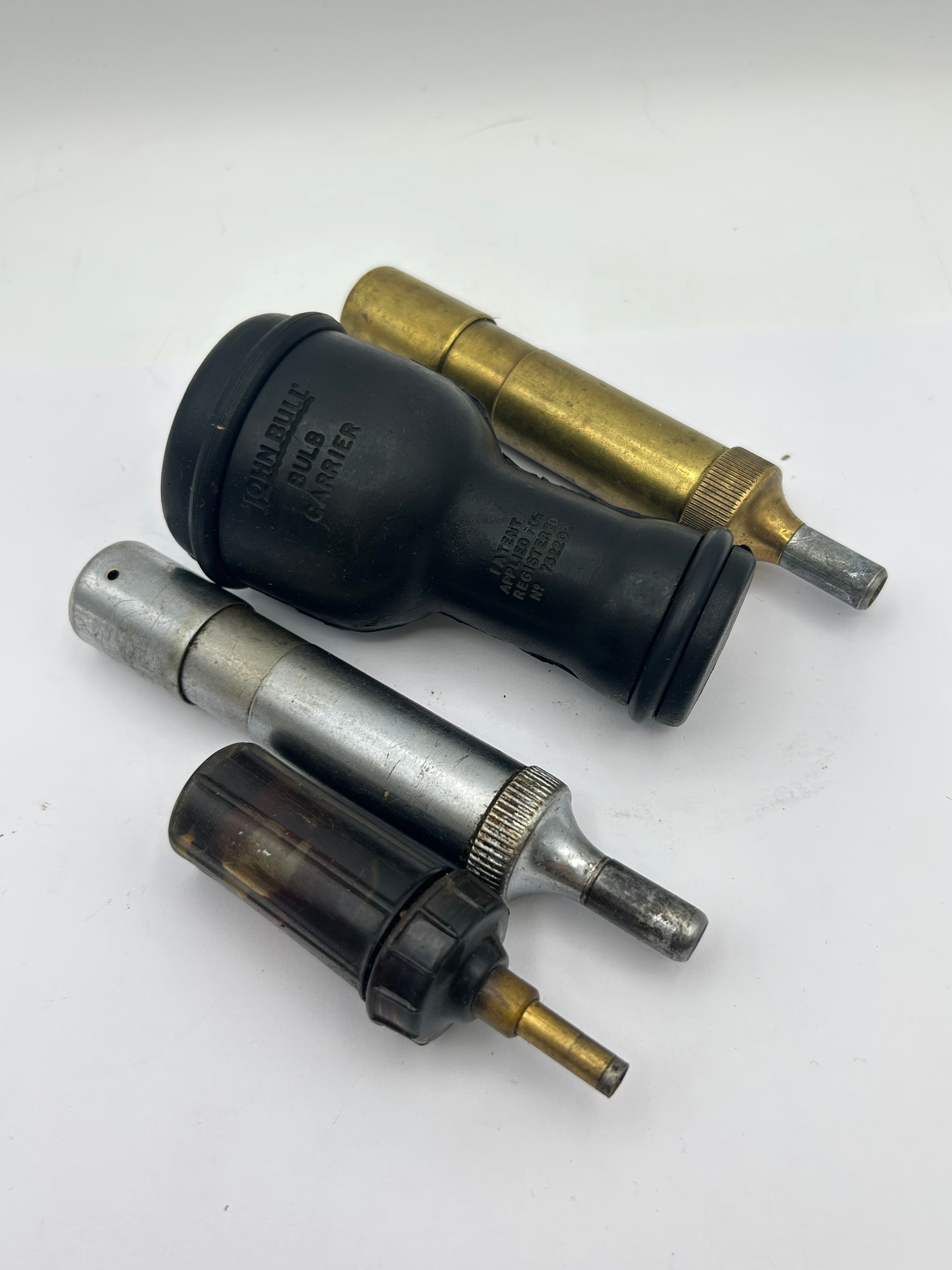 Three Vintage Automobile Grease Guns and One John Bull Light Bulb Carrier