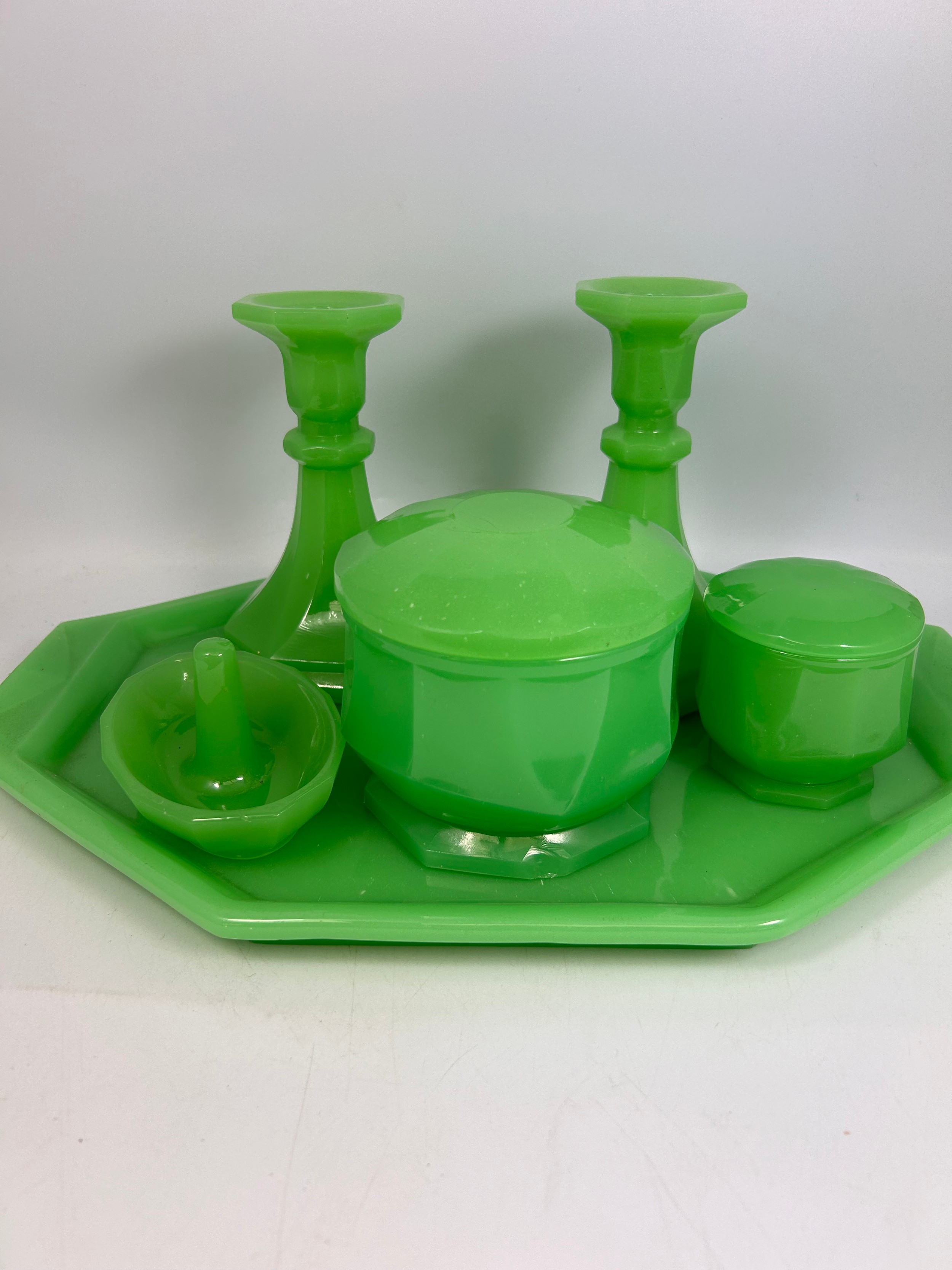 Stunning Uranium Milk Glass Dressing Table Set.