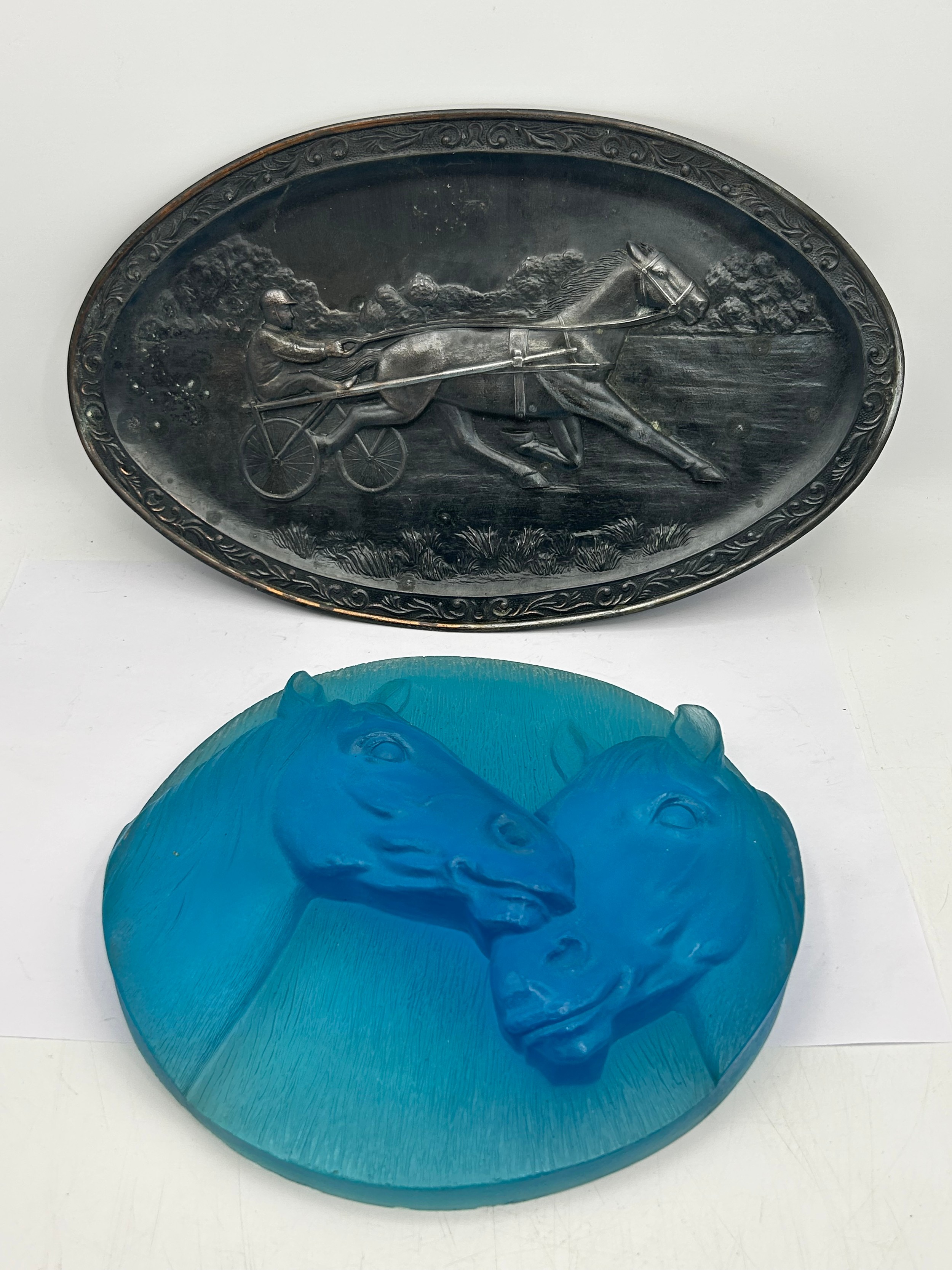 Two Plaques Relating To Horses One White Metal 11" x 7".
