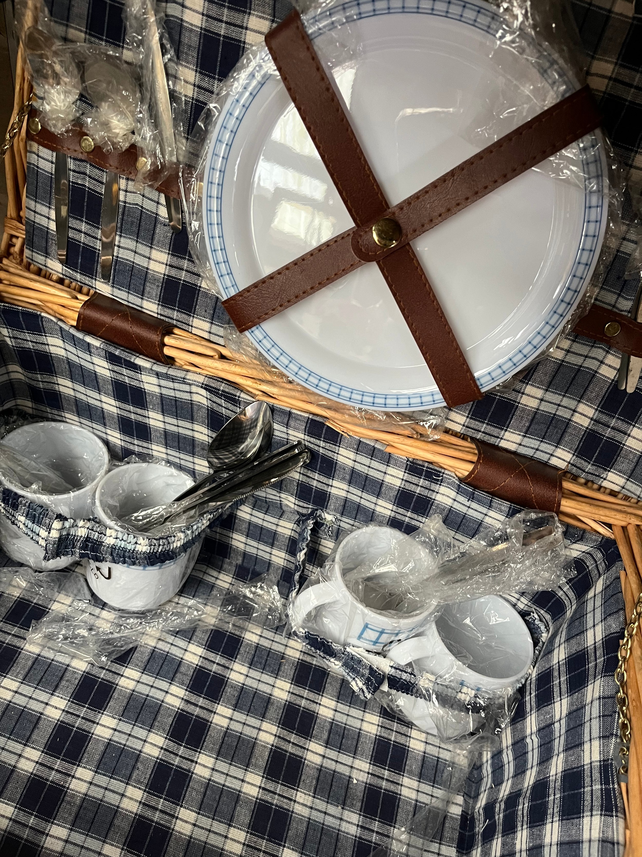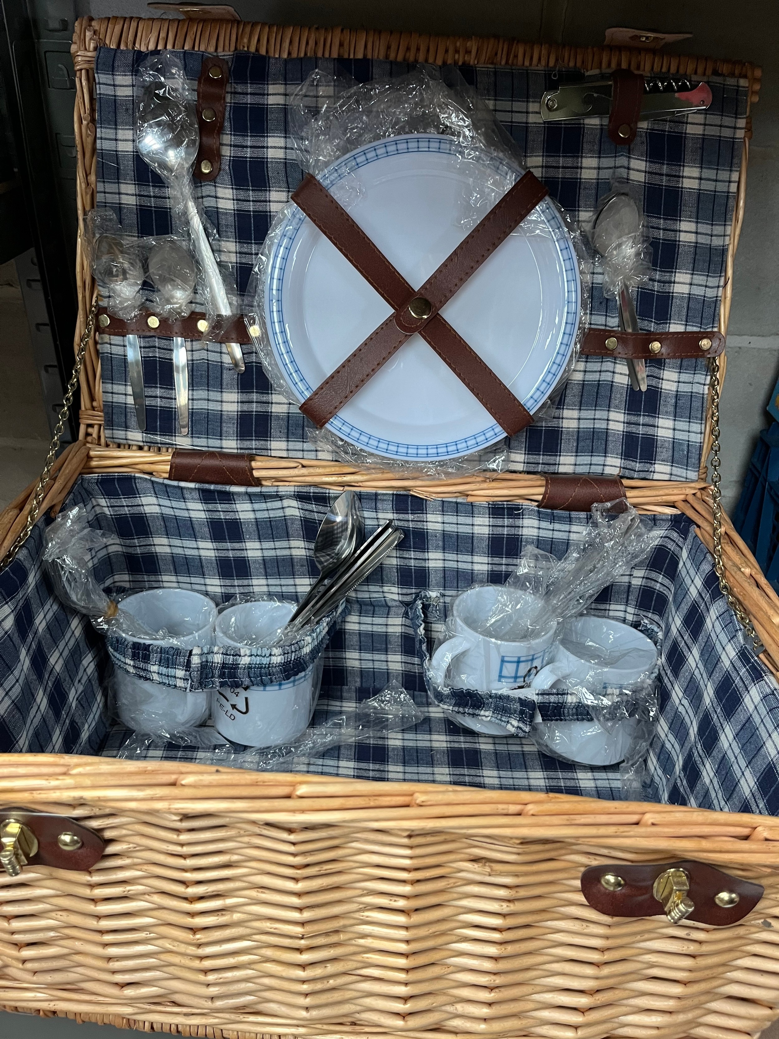 Wicker Picnic Basket With Contents Appears Unused.