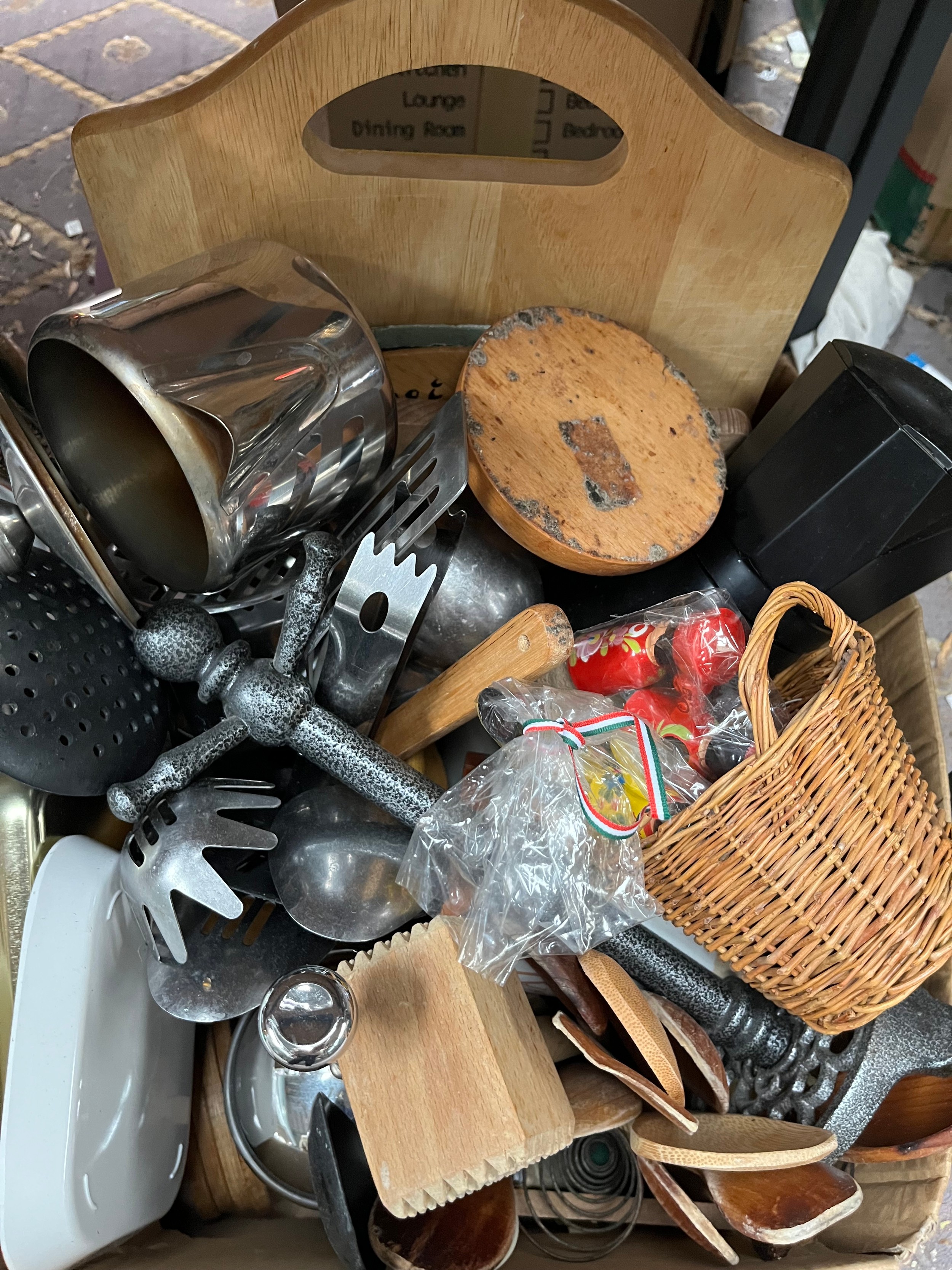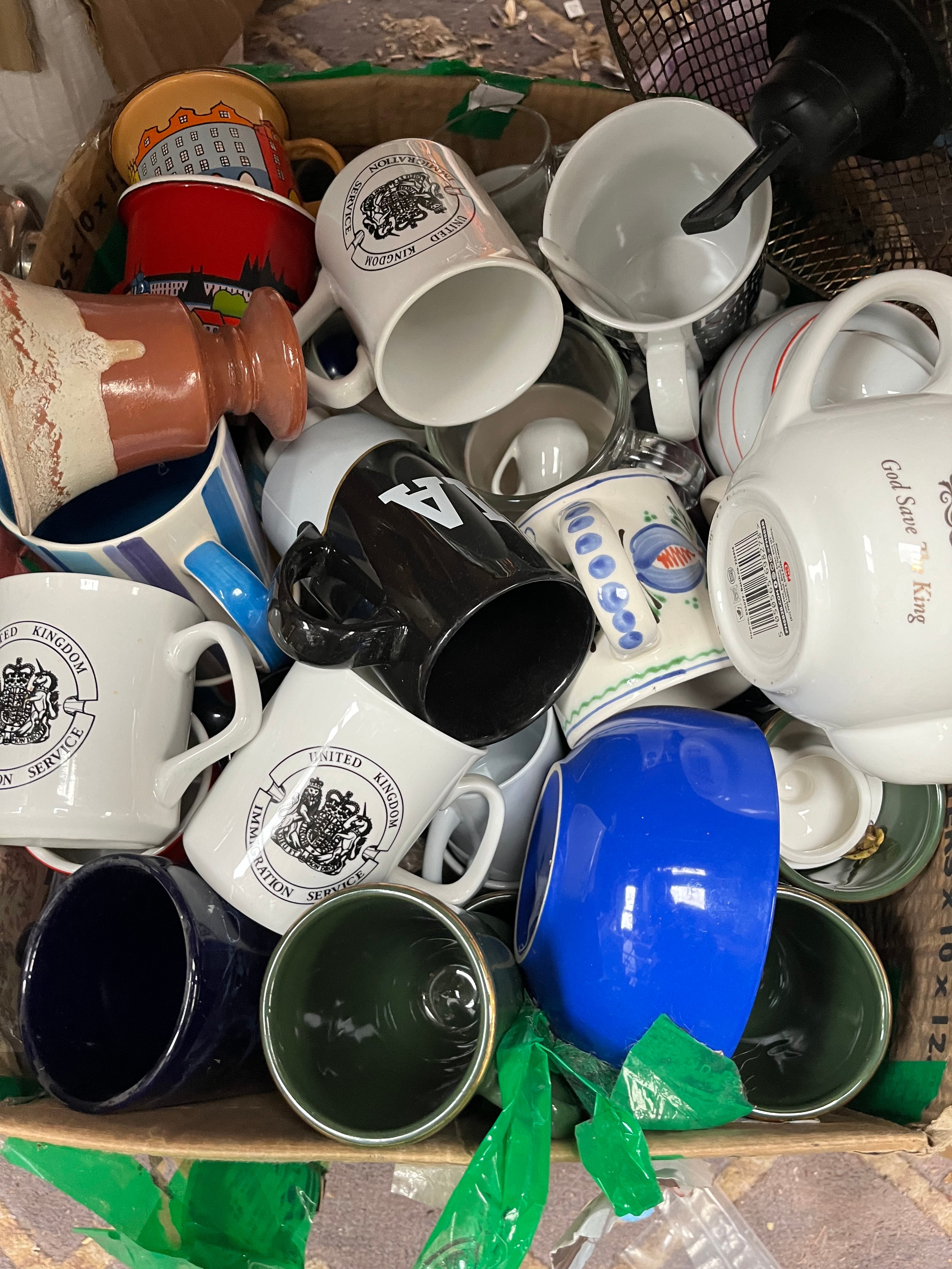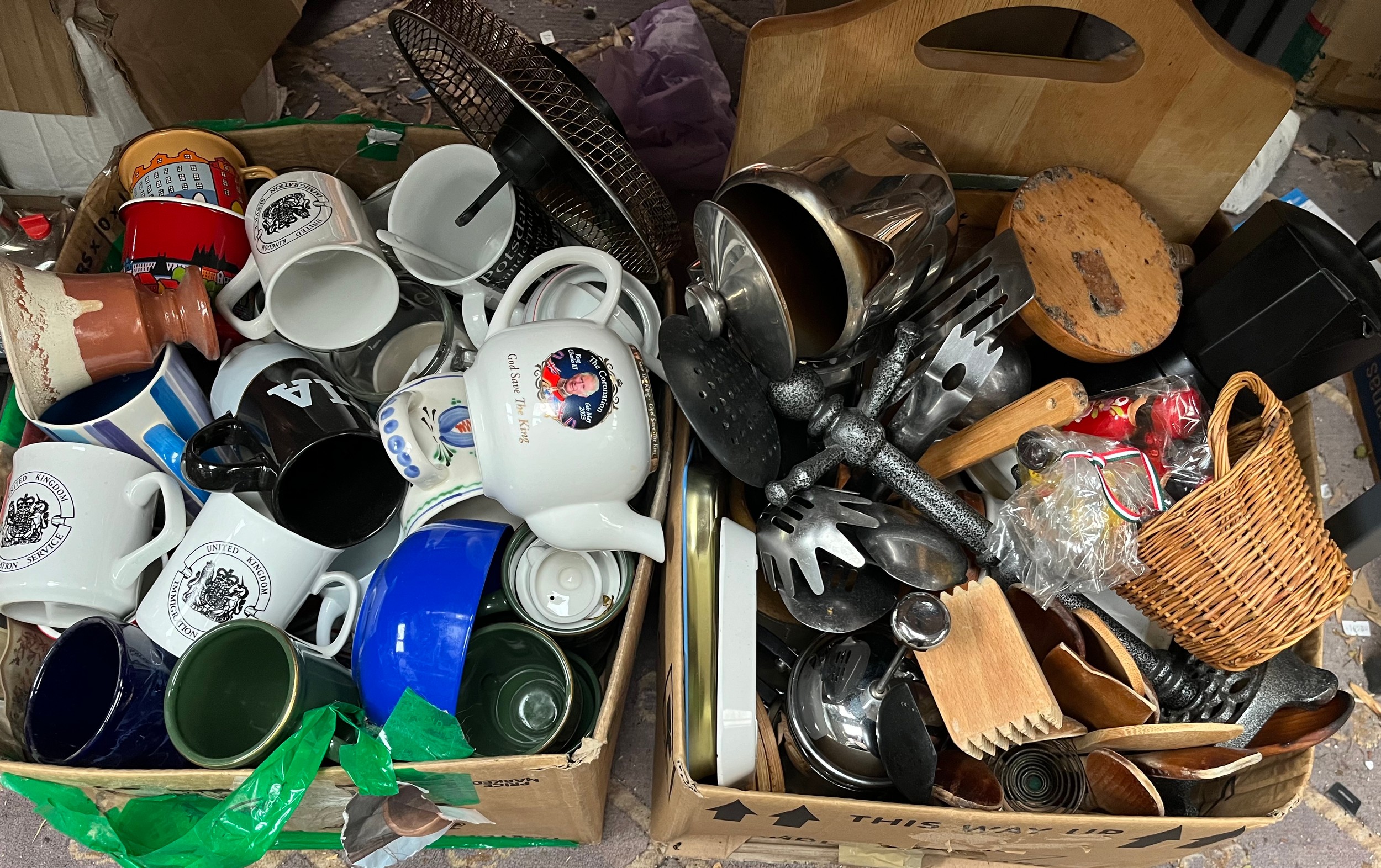 Two Boxes Of Kitchenware Including Utensils, Mugs, Tea Pots Etc.