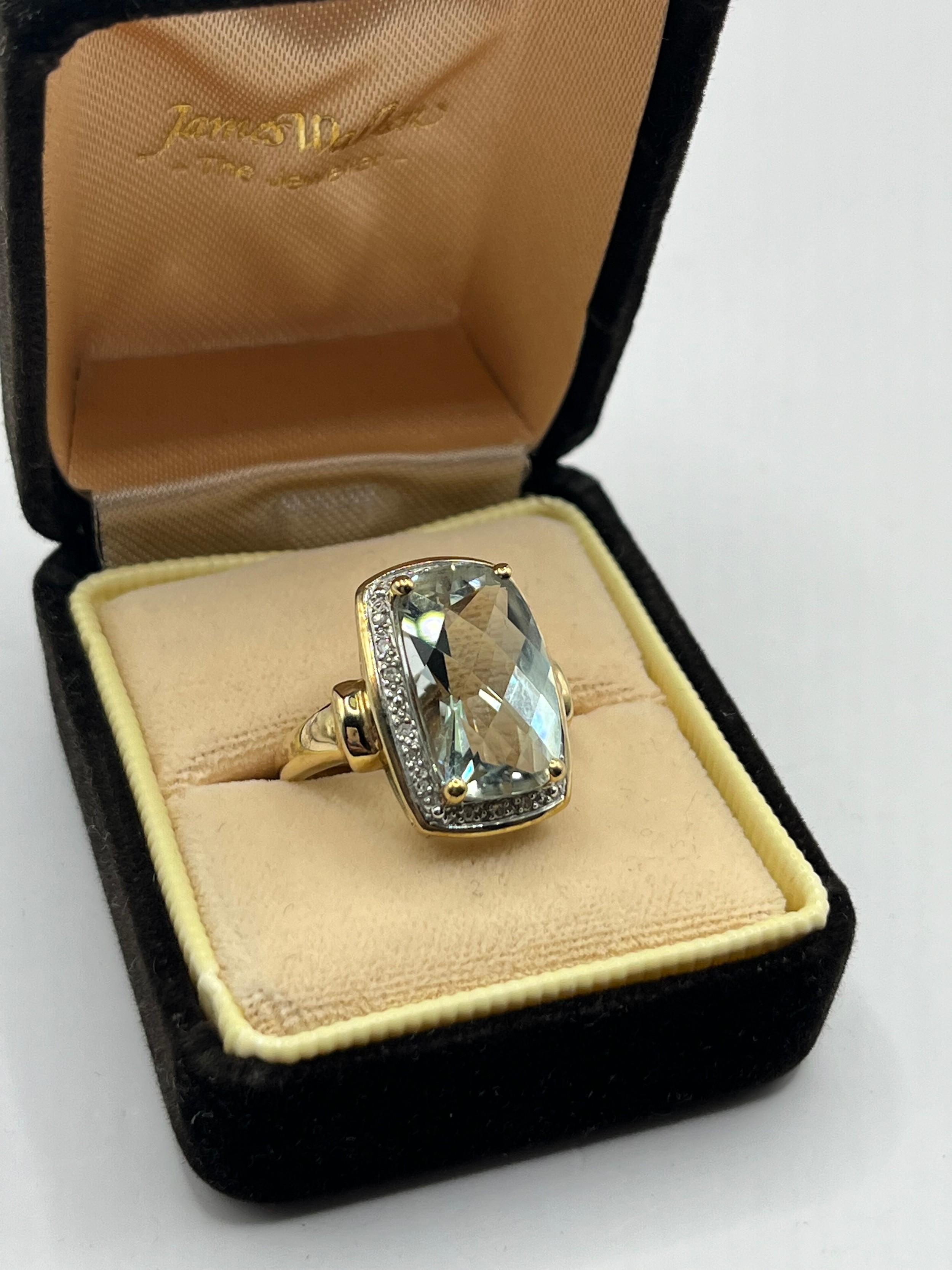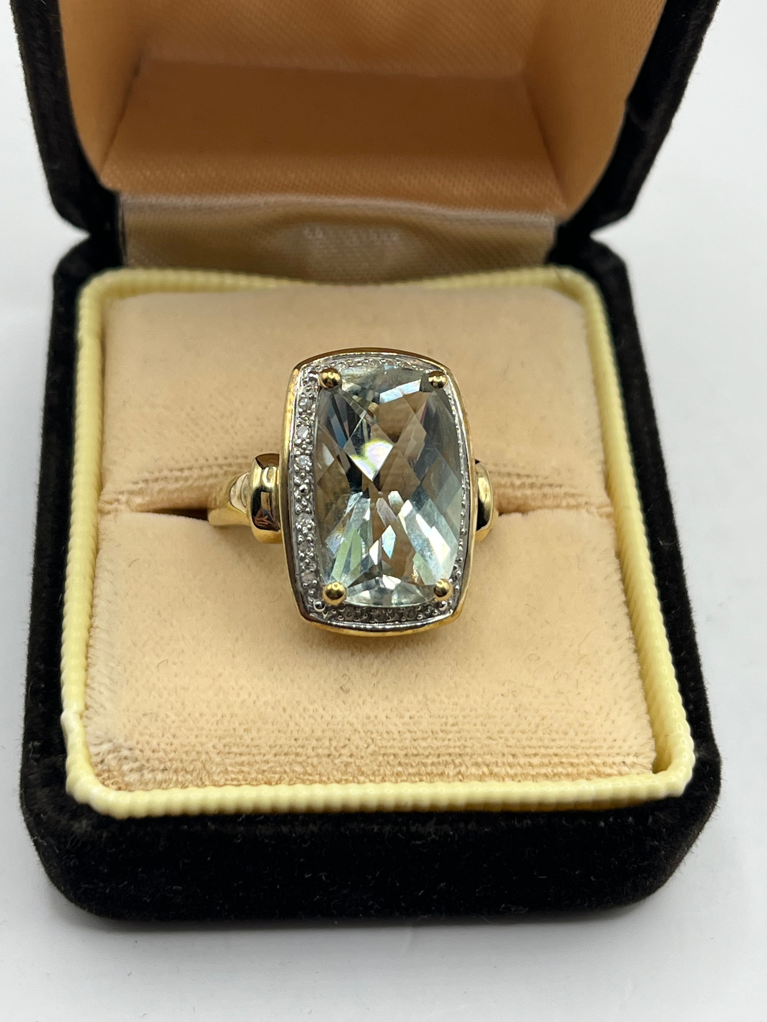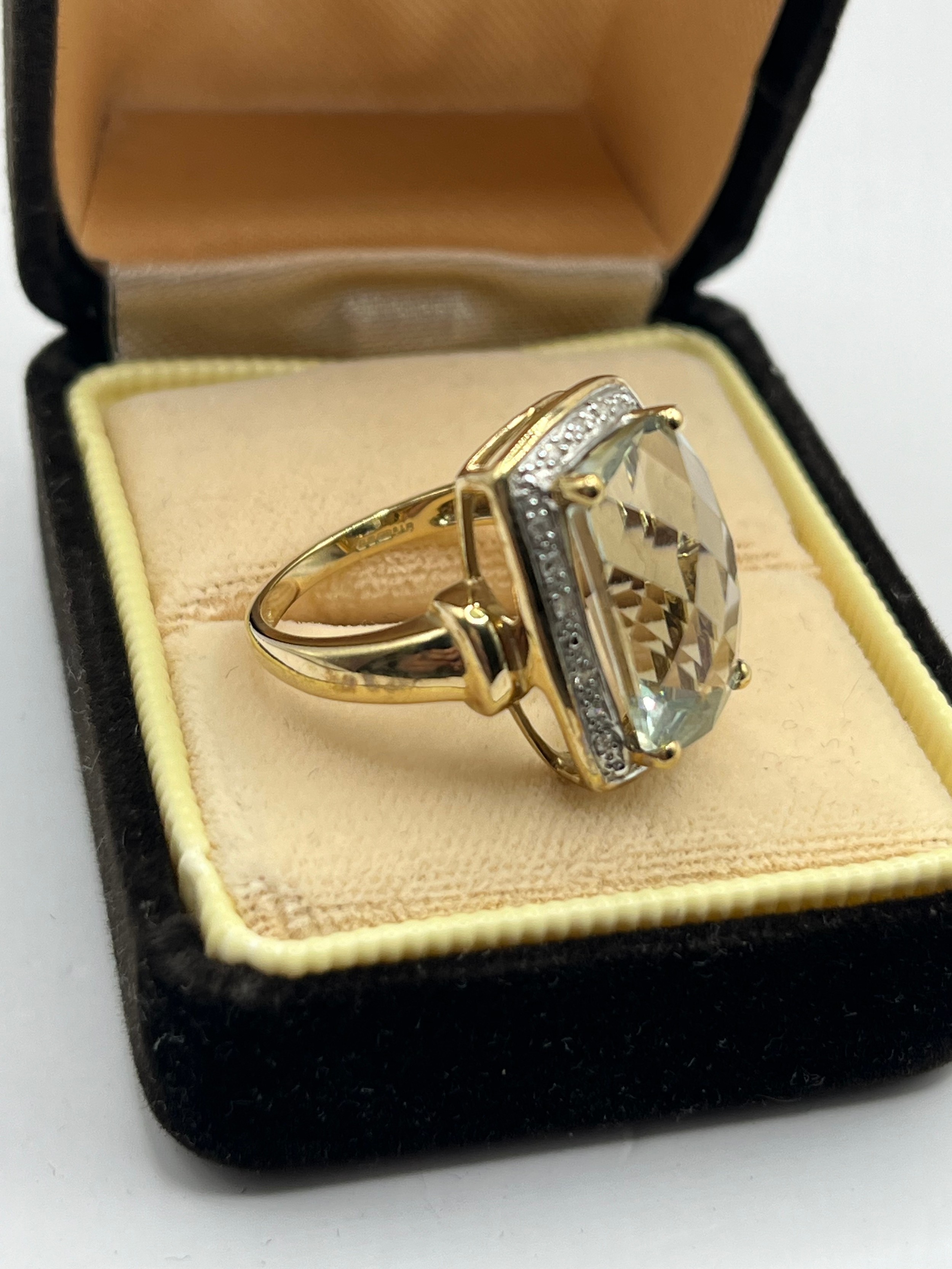 9ct Large Cushion Green Quartz And Diamond Ring Size N, 4.97g.