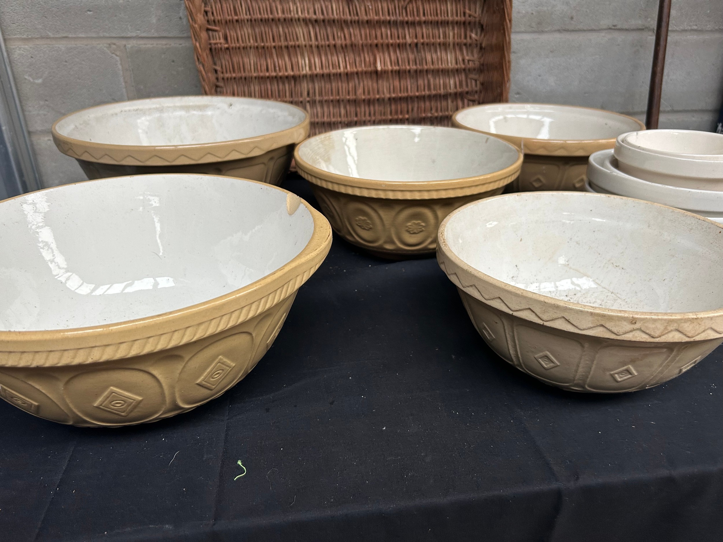 Wicker Basket Containing Dishes Including Mason Cash.