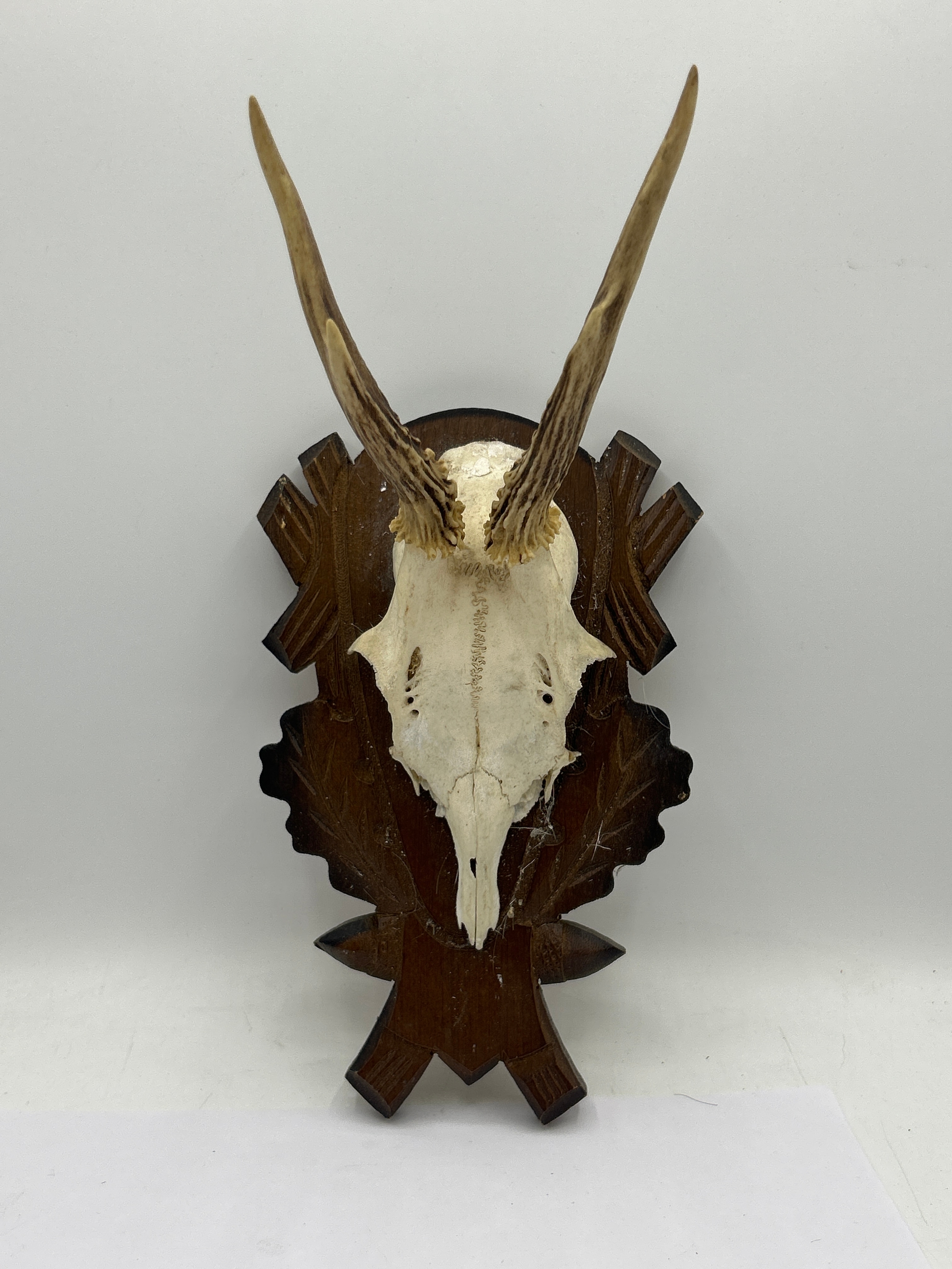 Taxidermy Antlers Mounted On Wooden Carved Shield