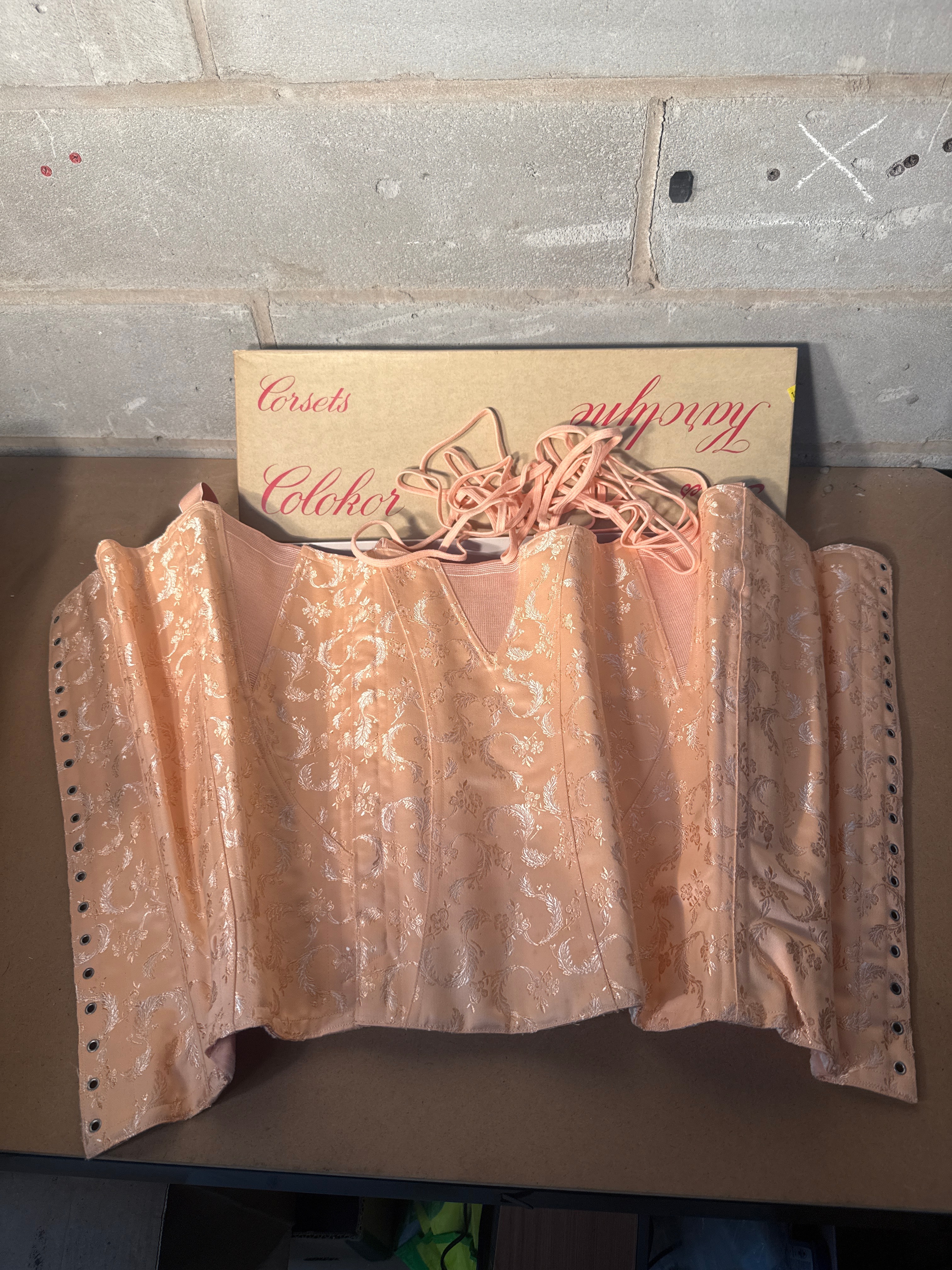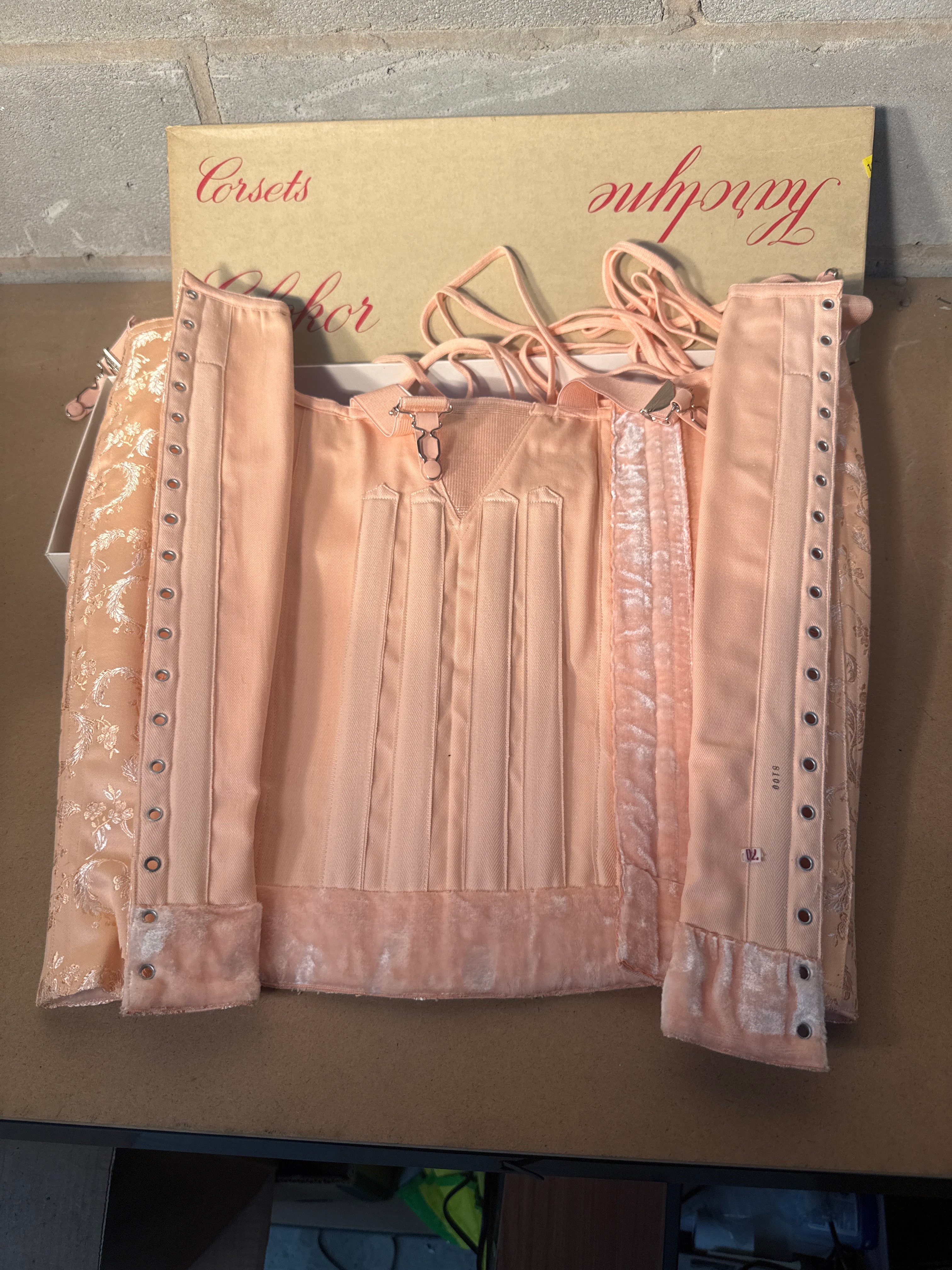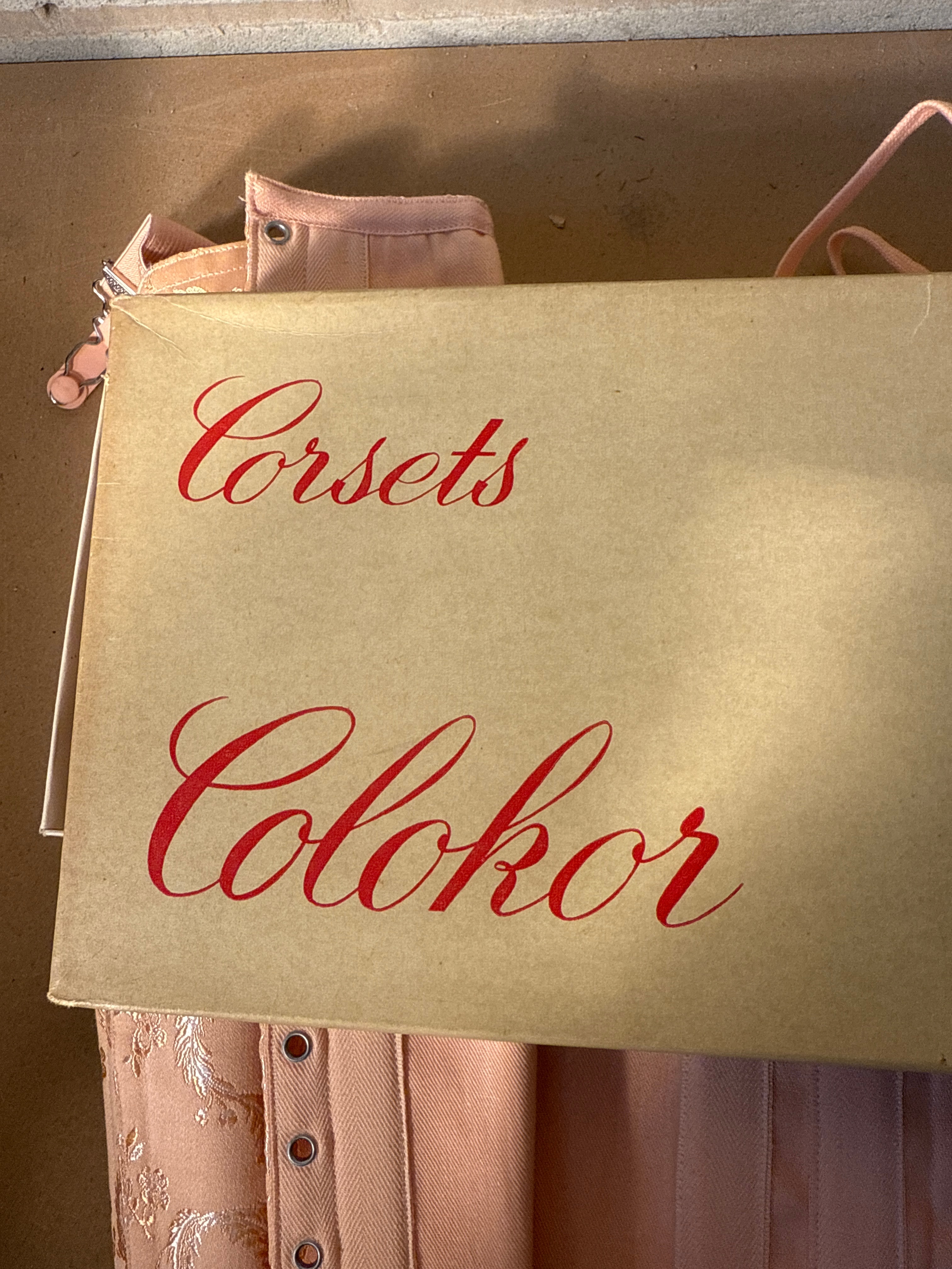 A vintage peach-toned boned corset, likely dating from the 1940s-1960s, presented new in its original beige cardboard box. The box is marked with red script text reading “Corsets,” “Colchor,” “Gaines,” and “Karolyne.” The garment is a peach-colored or light pink corset or waist cincher, featuring patterned fabric with a floral or scroll motif on the outer panels. These panels contrast with plain woven fabric, possibly satin, and elasticized mesh or ribbed panels. The interior reveals vertical boning channels, and the bottom edge is finished with a velour-like trim. Multiple metal eyelets are present on either side for lacing, and a peach-toned lacing cord is included. An internal tag on the garment displays the number “8710.”