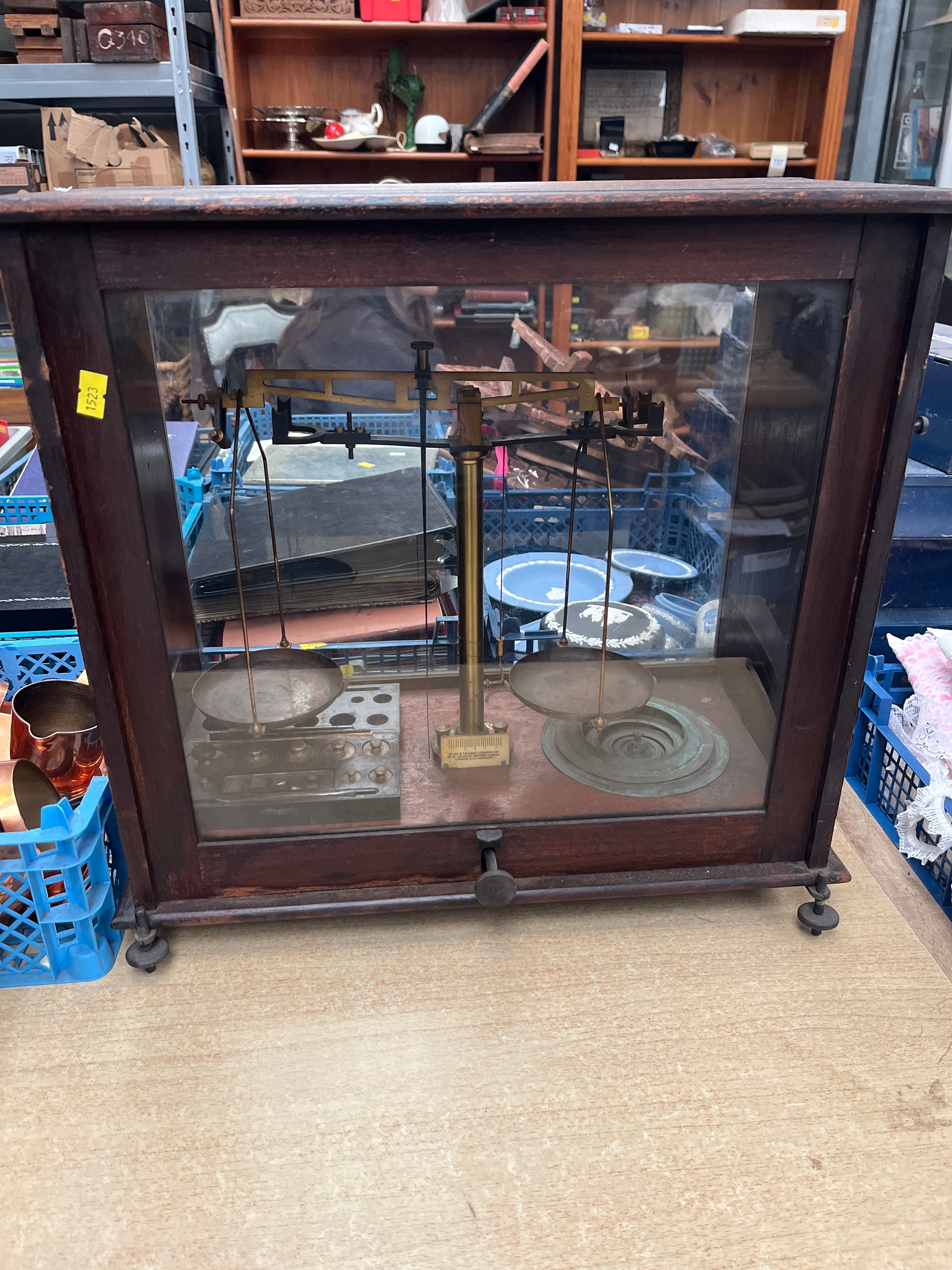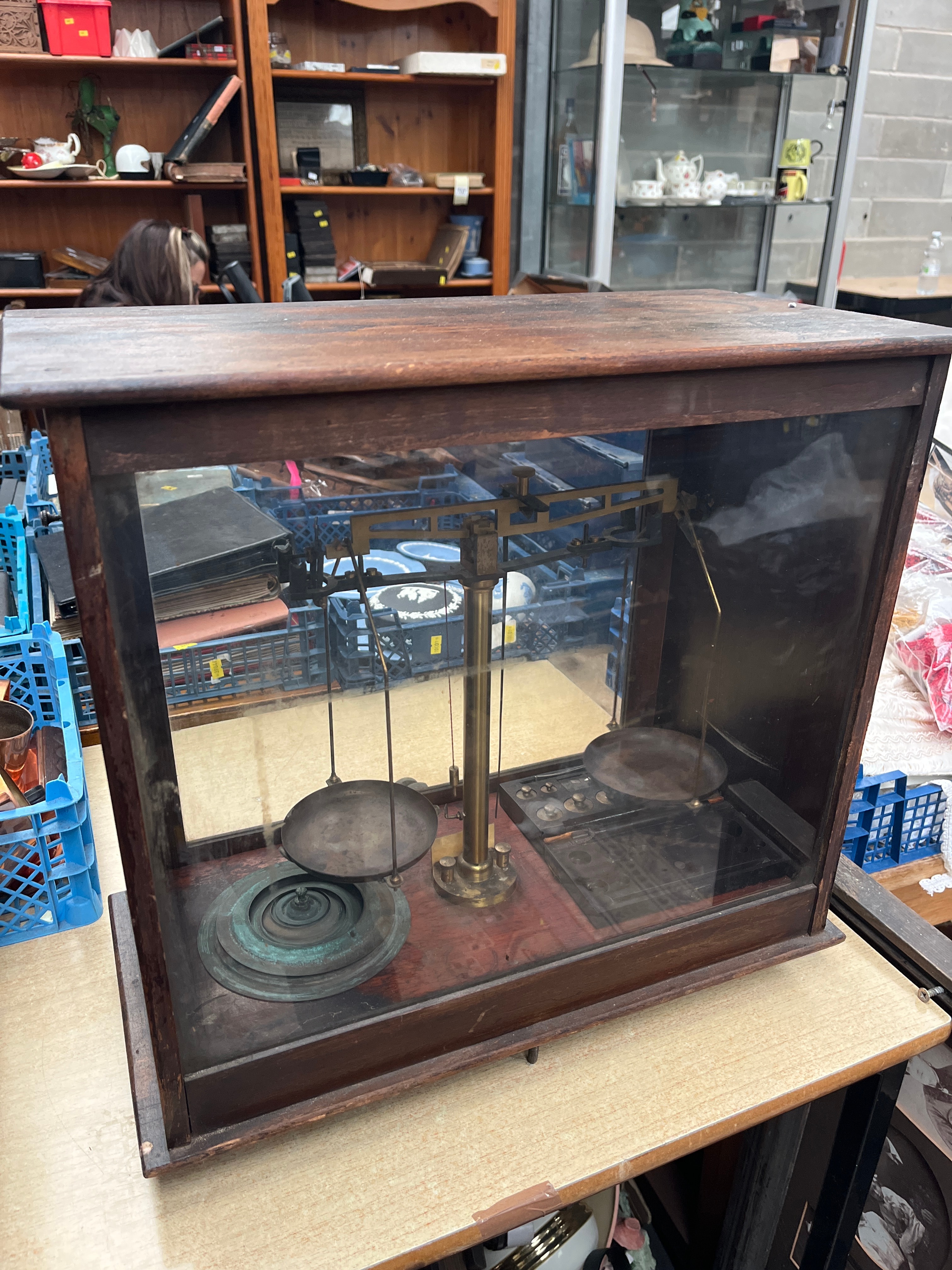 An antique precision balance scale by W. J. George & Co., Manchester & Birmingham. This instrument is presented within a rectangular dark-stained wooden case featuring glass panels on all visible sides. The scale mechanism, crafted from brass, displays a rich, aged patina, comprising a central pillar, beam, and two circular weighing pans suspended by brass hangers. A collection of assorted weights, varying in size and material (some brass, others with darker patination), are arranged on the wooden base inside the case. The wooden case exhibits expected wear, minor scratches, and a small wooden pull knob on the lower front.