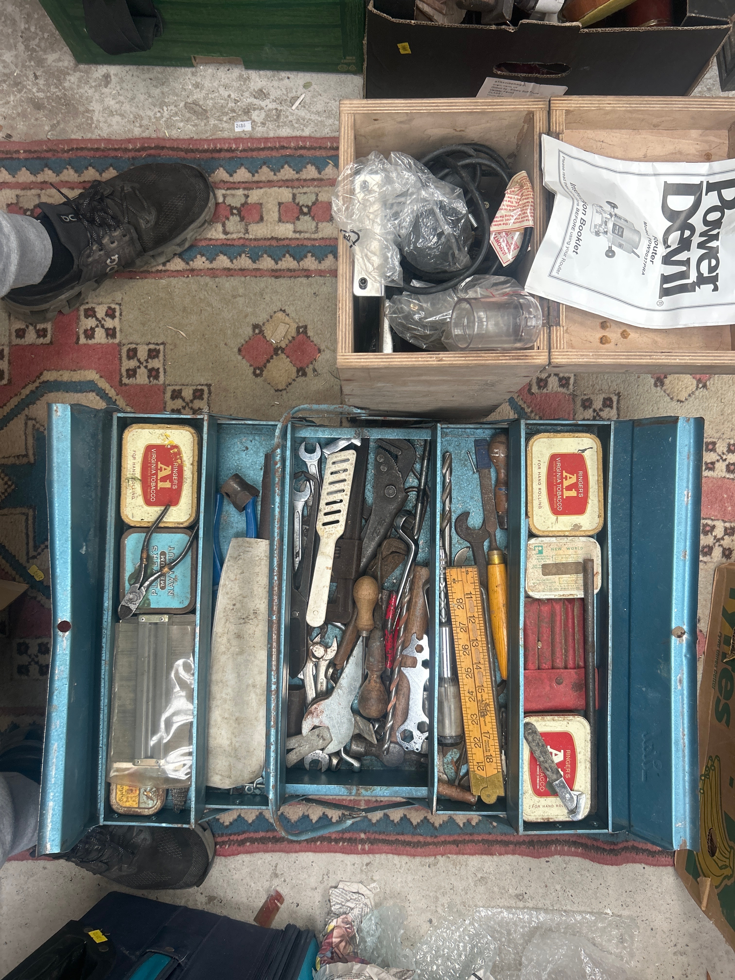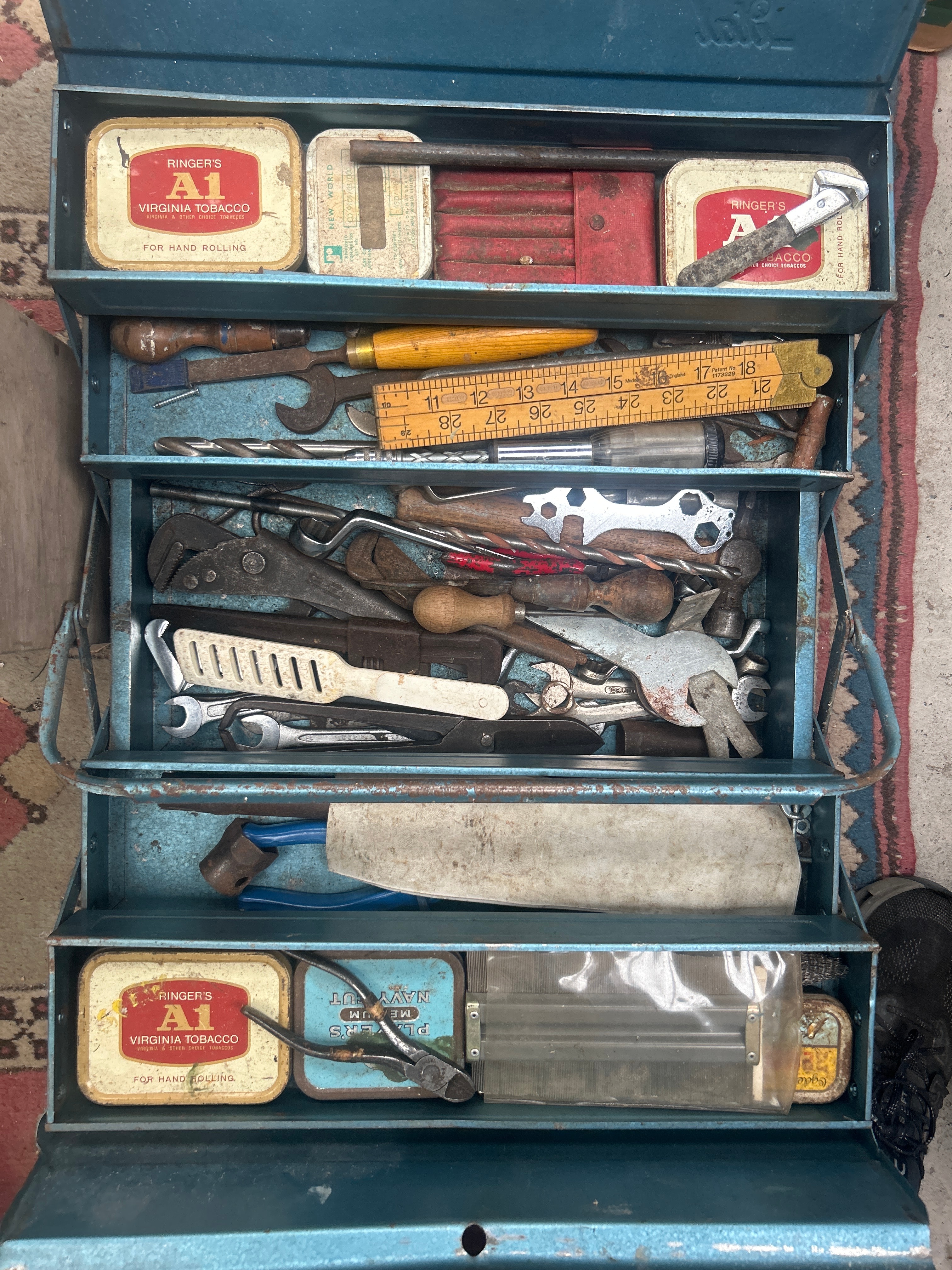 A vintage blue painted multi-tier cantilever metal toolbox, containing an assortment of well-used, aged hand tools. The contents include various wrenches, pliers, screwdrivers, and files. Prominently visible are several rectangular tins labeled “RINGER’S A1 VIRGINIA TOBACCO FOR HAND ROLLING,” a smaller blue oval tin with visible text “NAVAJ,” and a yellow wooden folding ruler.
