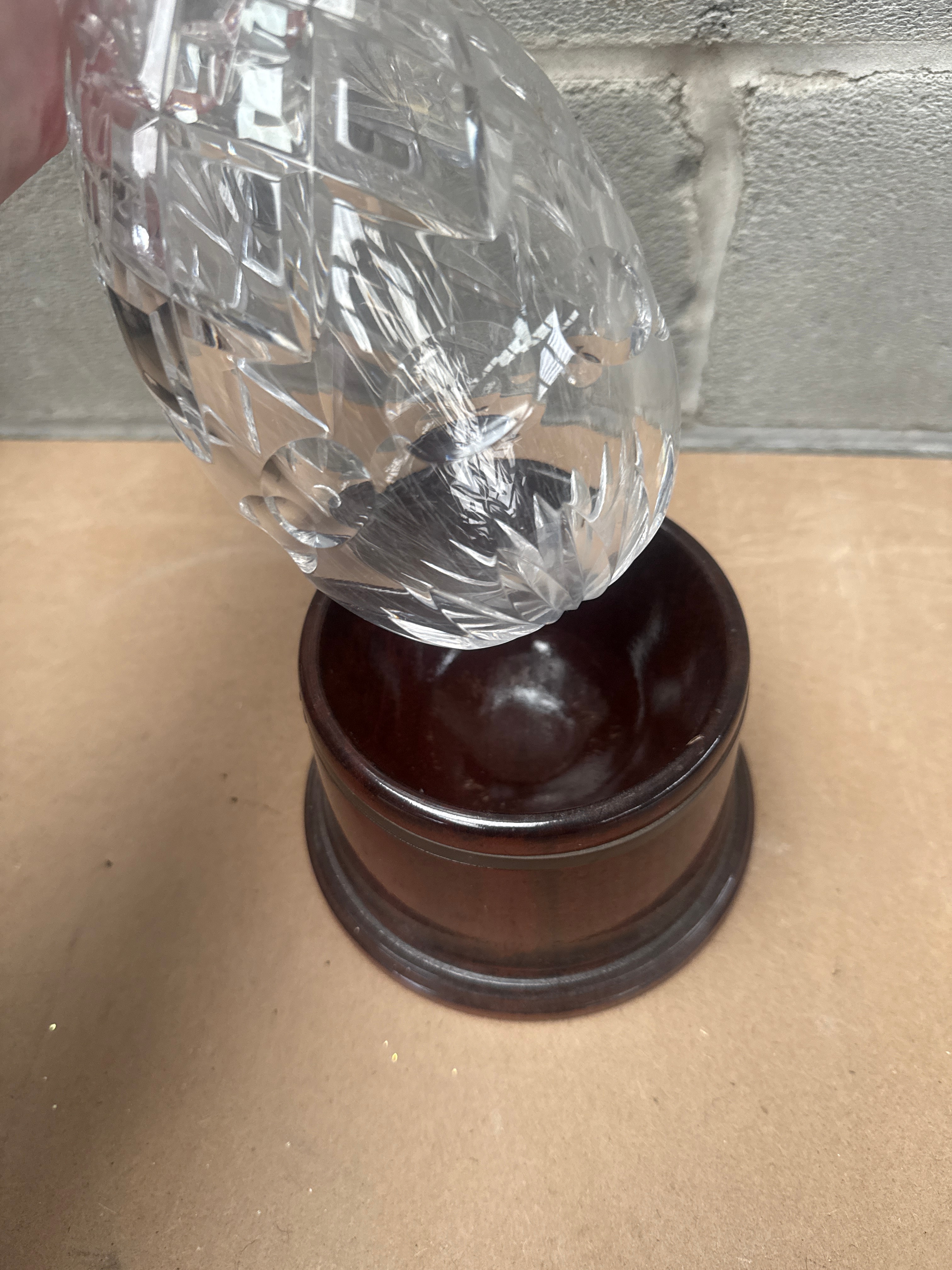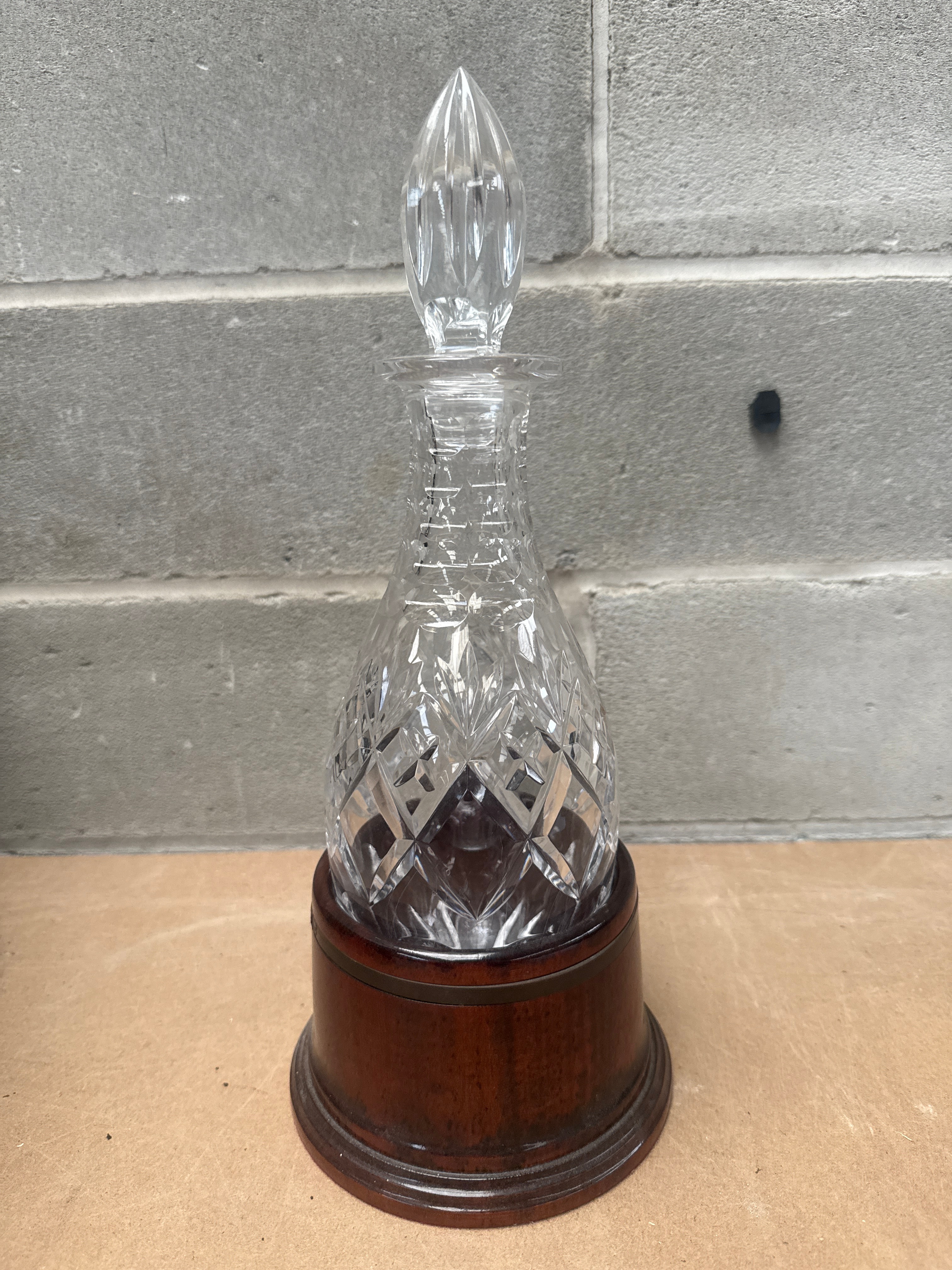 A Royal Doulton Hoggit cut glass decanter with a faceted, elongated stopper, presented on a dark, possibly mahogany-stained, turned wooden base. The decanter features elaborate geometric cut patterns, including diamond and starburst motifs, characteristic of traditional lead crystal designs.