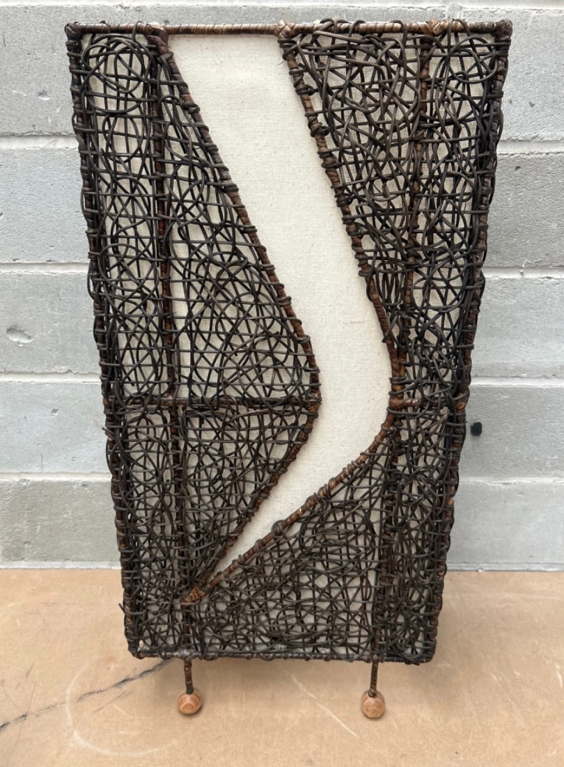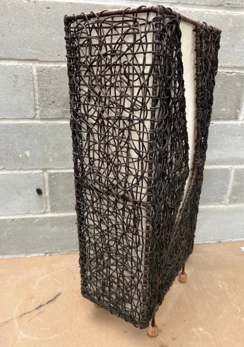 A Contemporary Style Rattan Wicker Accent Table Lamp. This rectangular columnar lamp is constructed from tightly woven dark brown natural fiber, likely rattan or wicker, forming an open lattice exterior. An internal, light-colored textile diffuser features an asymmetrical S-curve cutout, which is visible through the weaving. The item stands on two small, light-toned wooden feet. No visible text or manufacturer’s markings are present.
