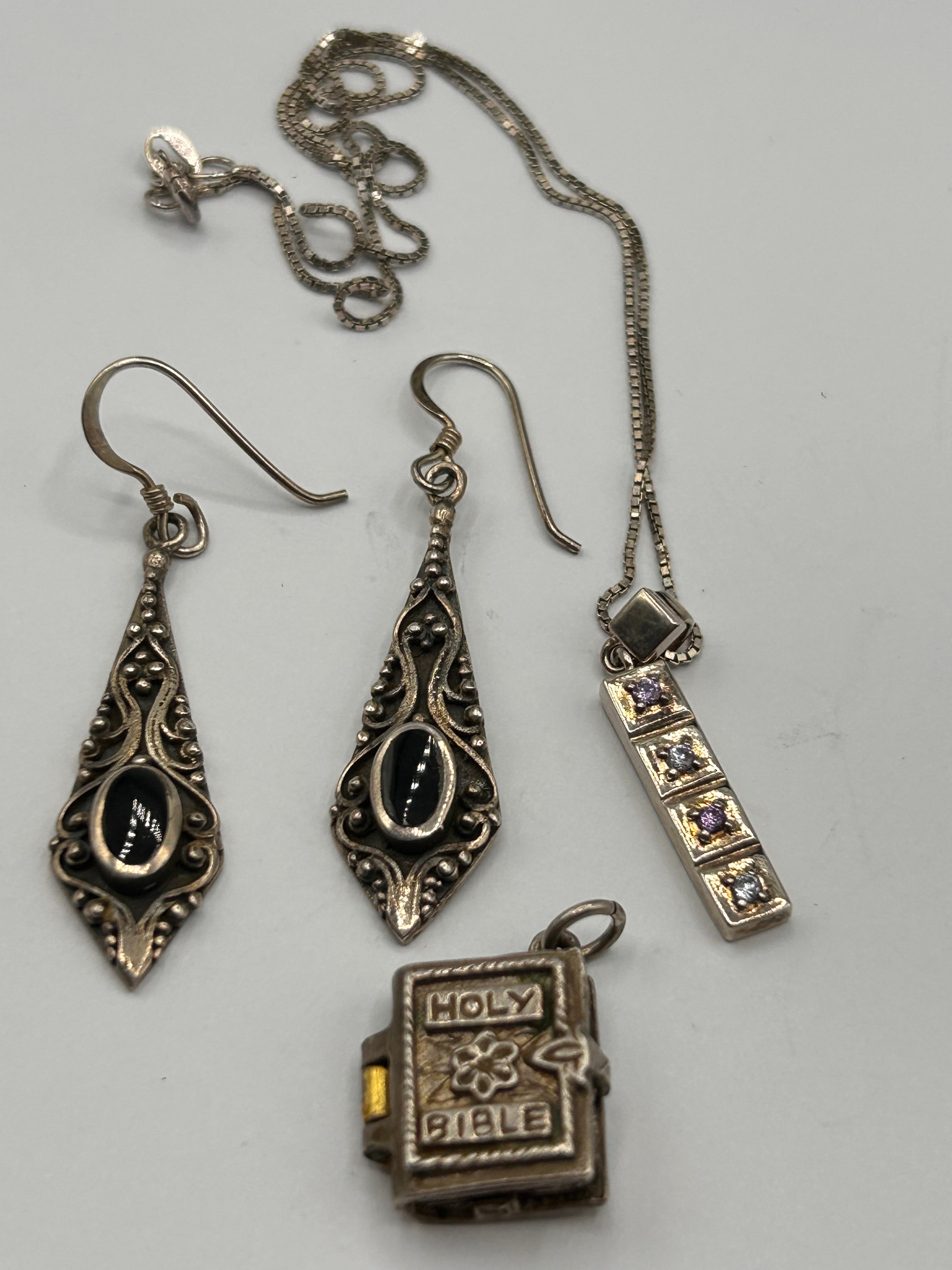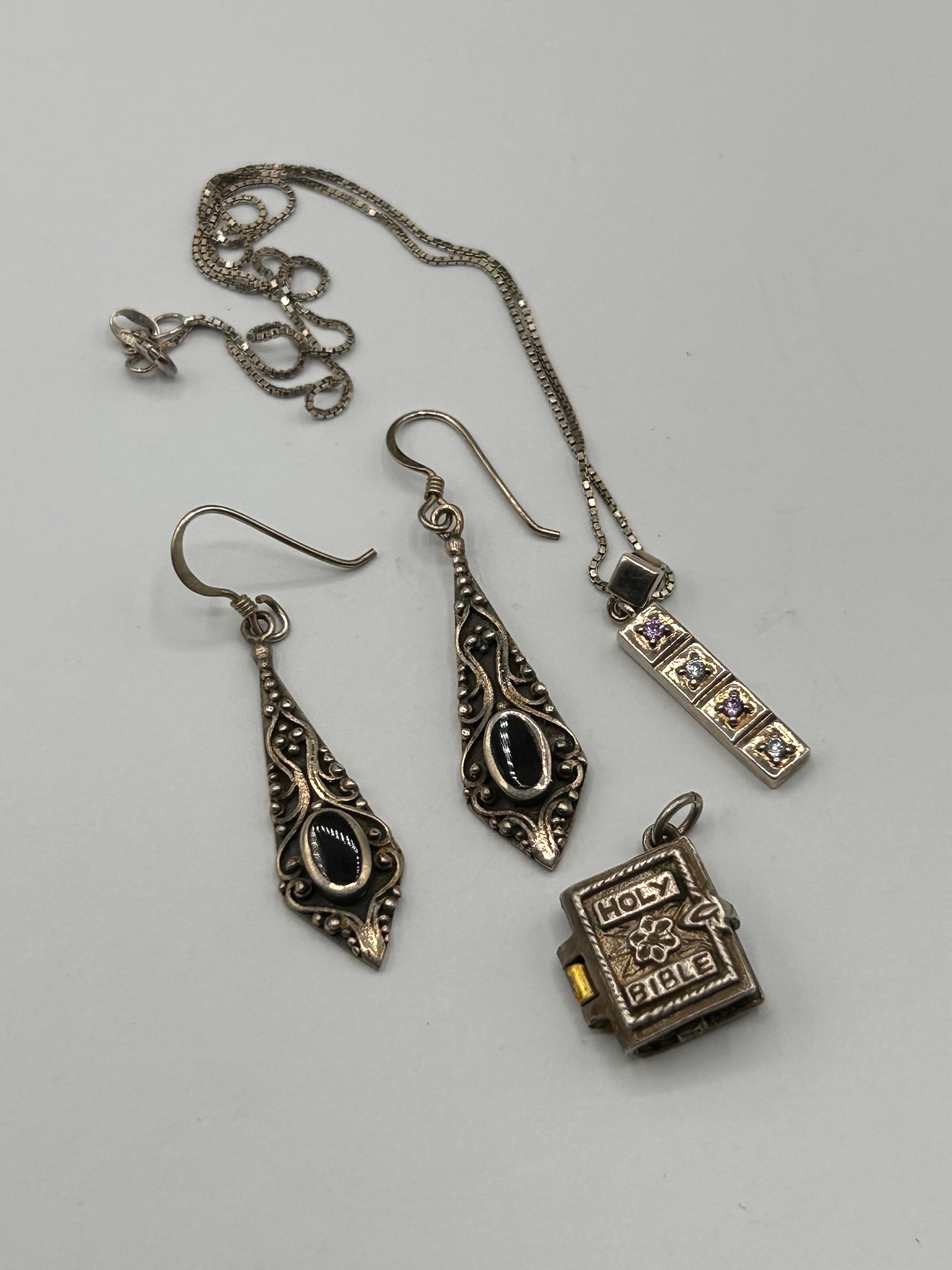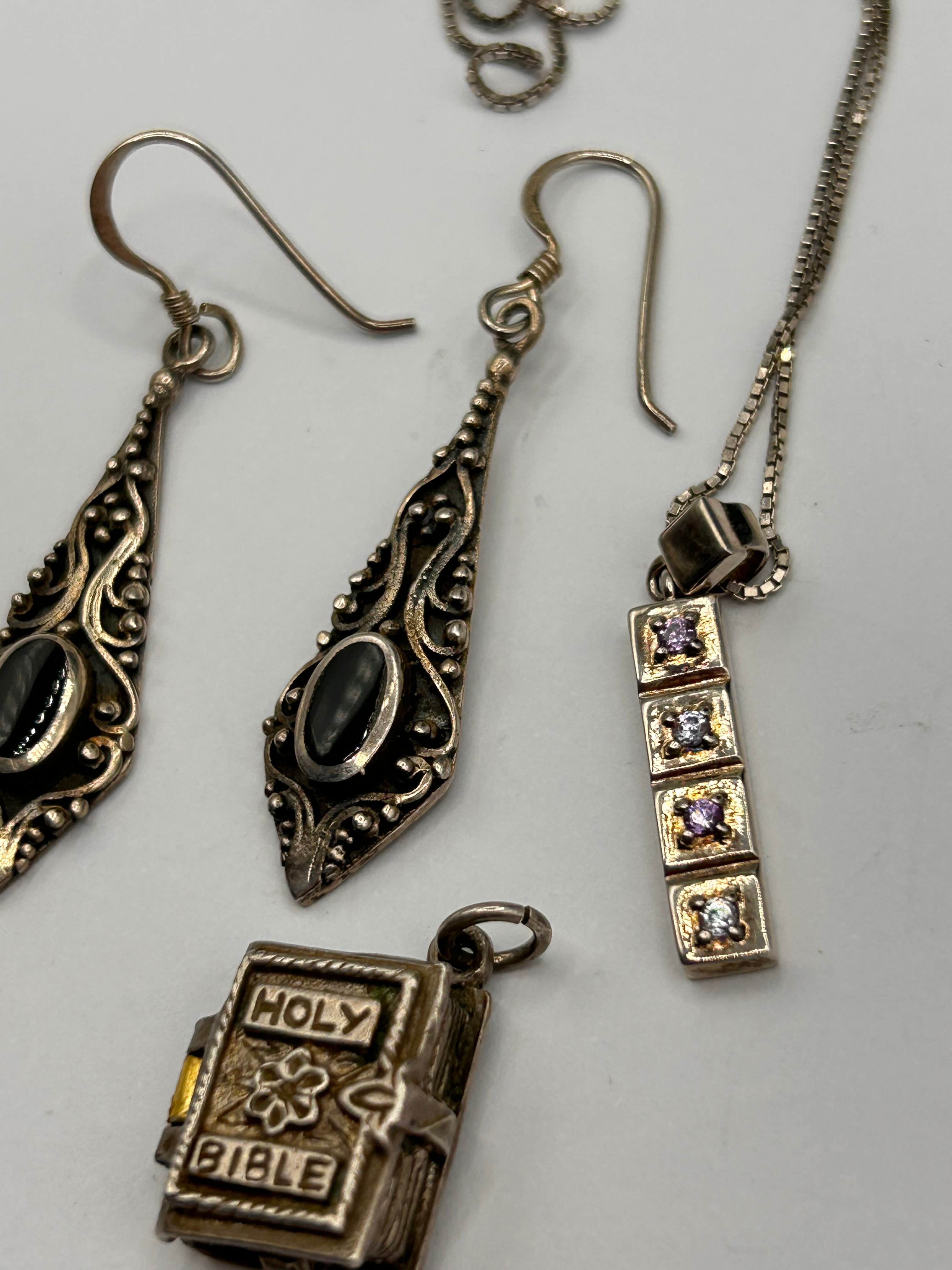 A collection of Silver jewelry, featuring a pair of Moroccan style dangle earrings. Each earring is crafted from Silver, featuring an ornate dangle design with intricate scrollwork, set with a central oval black cabochon stone, and fitted with hook backings. Also included is a Silver box chain necklace adorned with a rectangular pendant, which is set with three alternating clear and light purple square-cut faceted stones. A separate, loose Silver chain with a lobster clasp is present. The collection is completed by a miniature book-shaped pendant, embossed on its cover with the text “HOLY BIBLE” and a central floral design; it exhibits a visible hinge or clasp suggesting it may open.