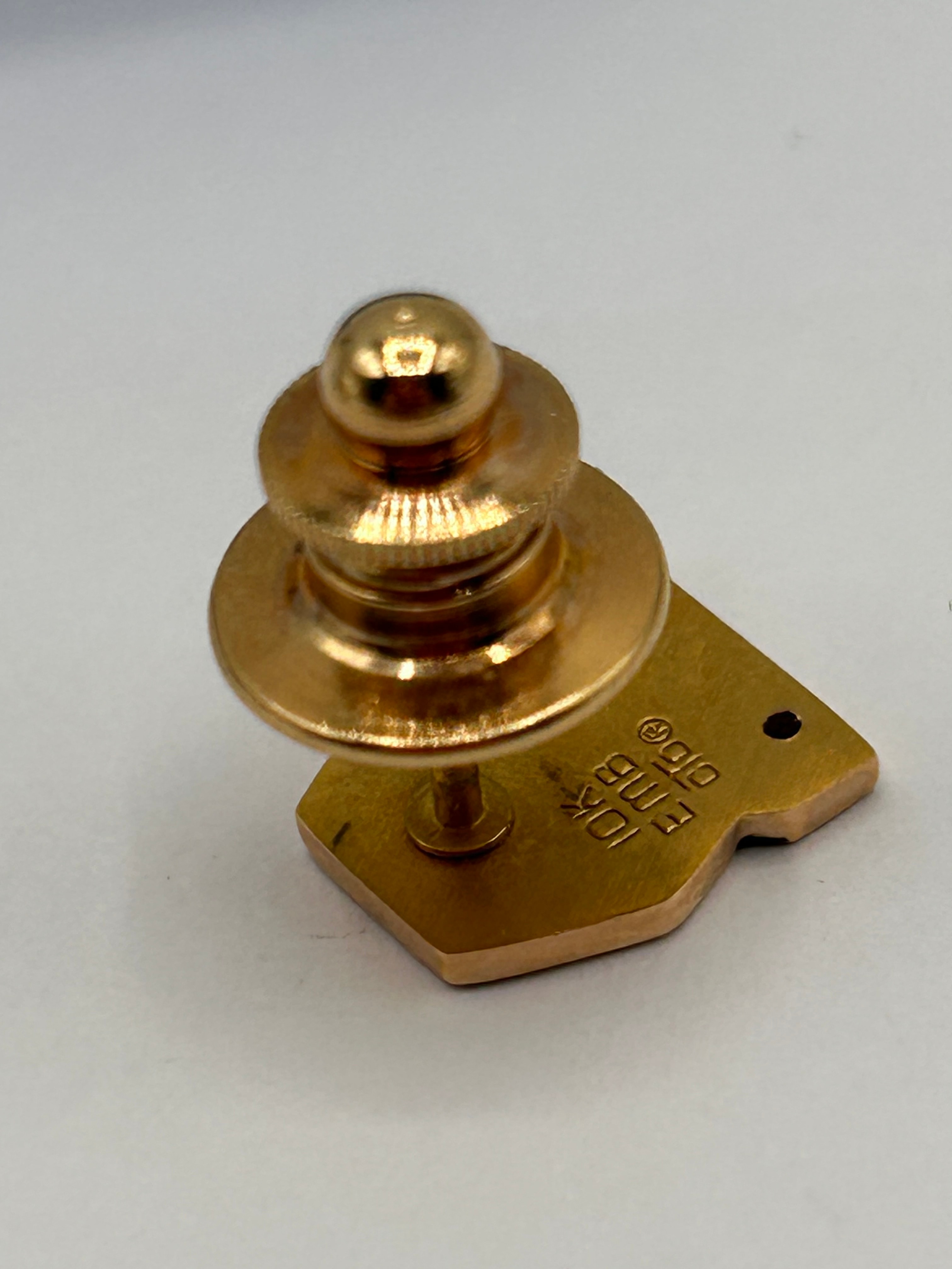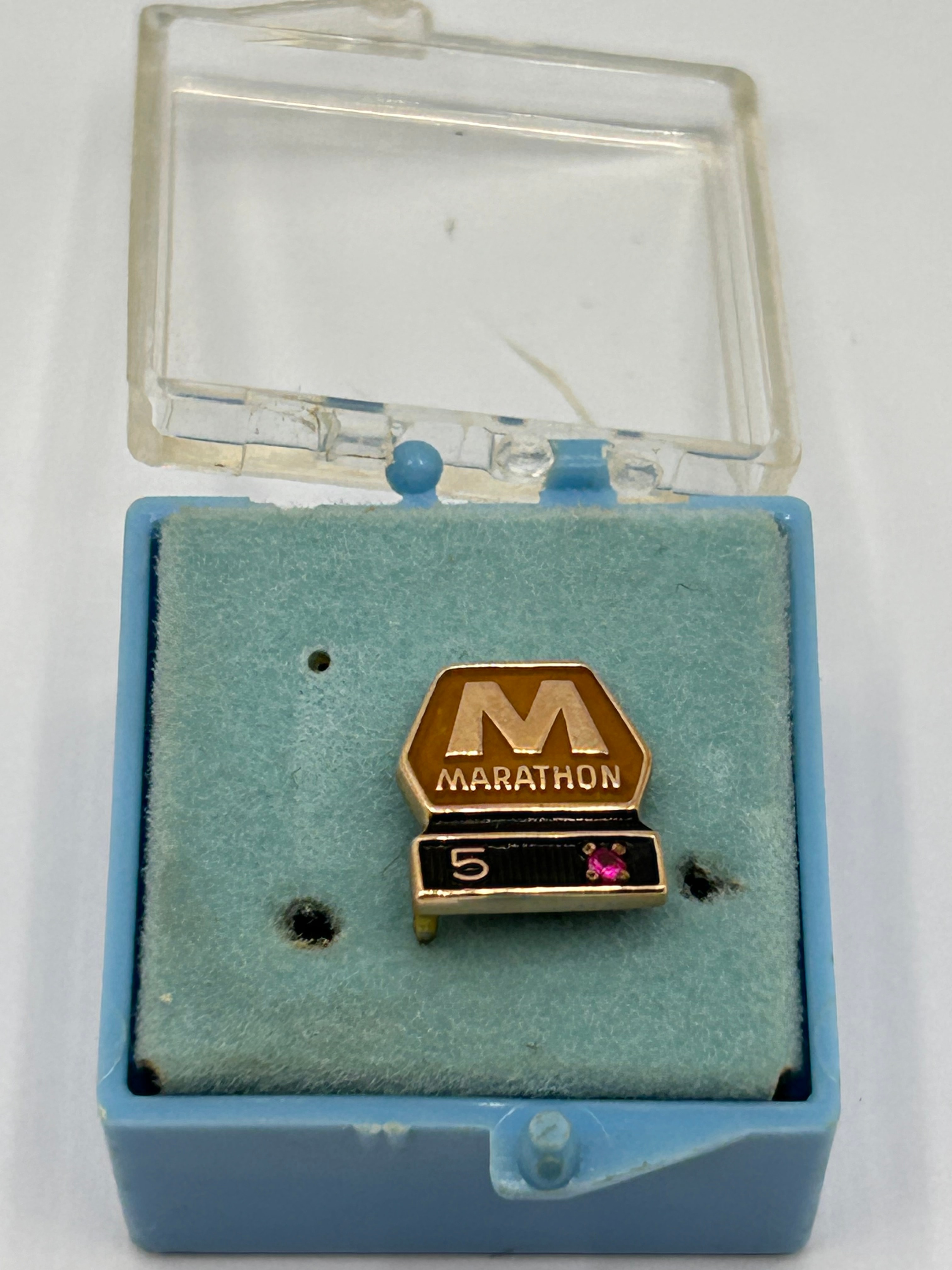 A Vintage Marathon Oil Co. 5 Year Service Lapel Pin, crafted from 10K gold. The pin features a hexagonal upper section with a stylized “M” above “MARATHON” text, set against a gold-toned background. Below this, a rectangular base displays the number “5” in white on a black field, accompanied by a small pink stone or enamel accent. The reverse of the pin is marked “10K”, “EMB”, and a registered trademark symbol. The pin is housed within a light blue plastic display box with a clear lid and felt insert.