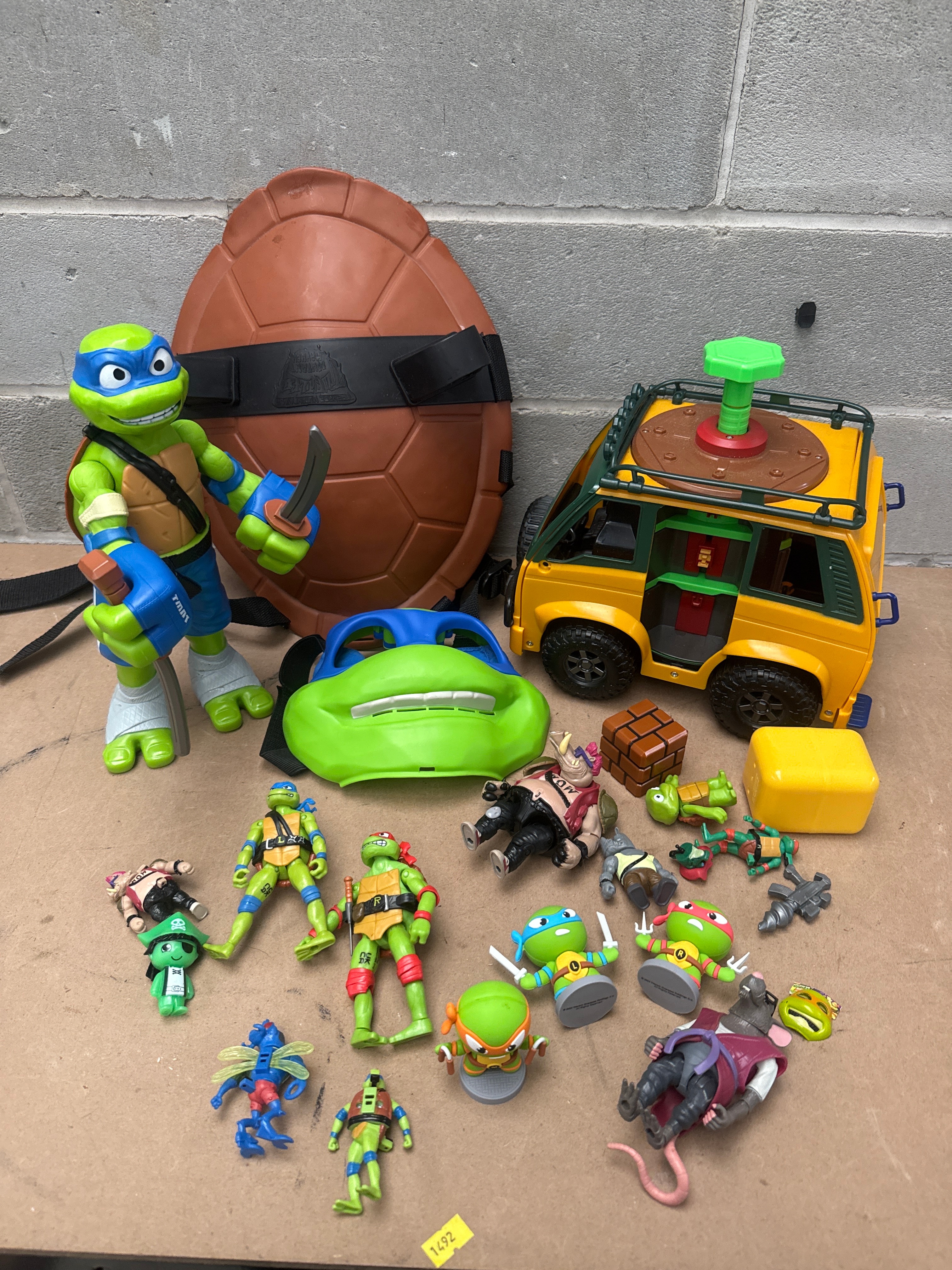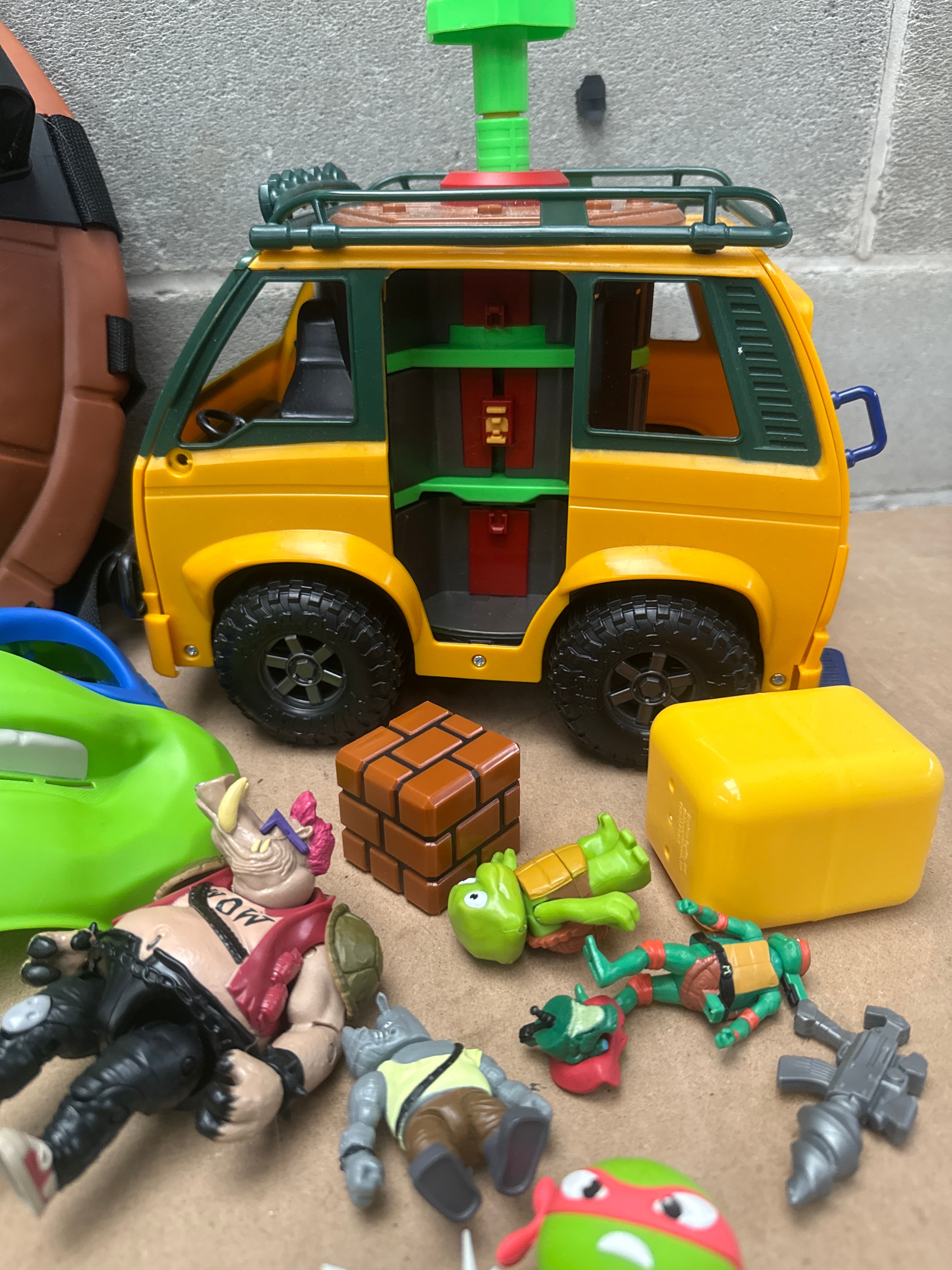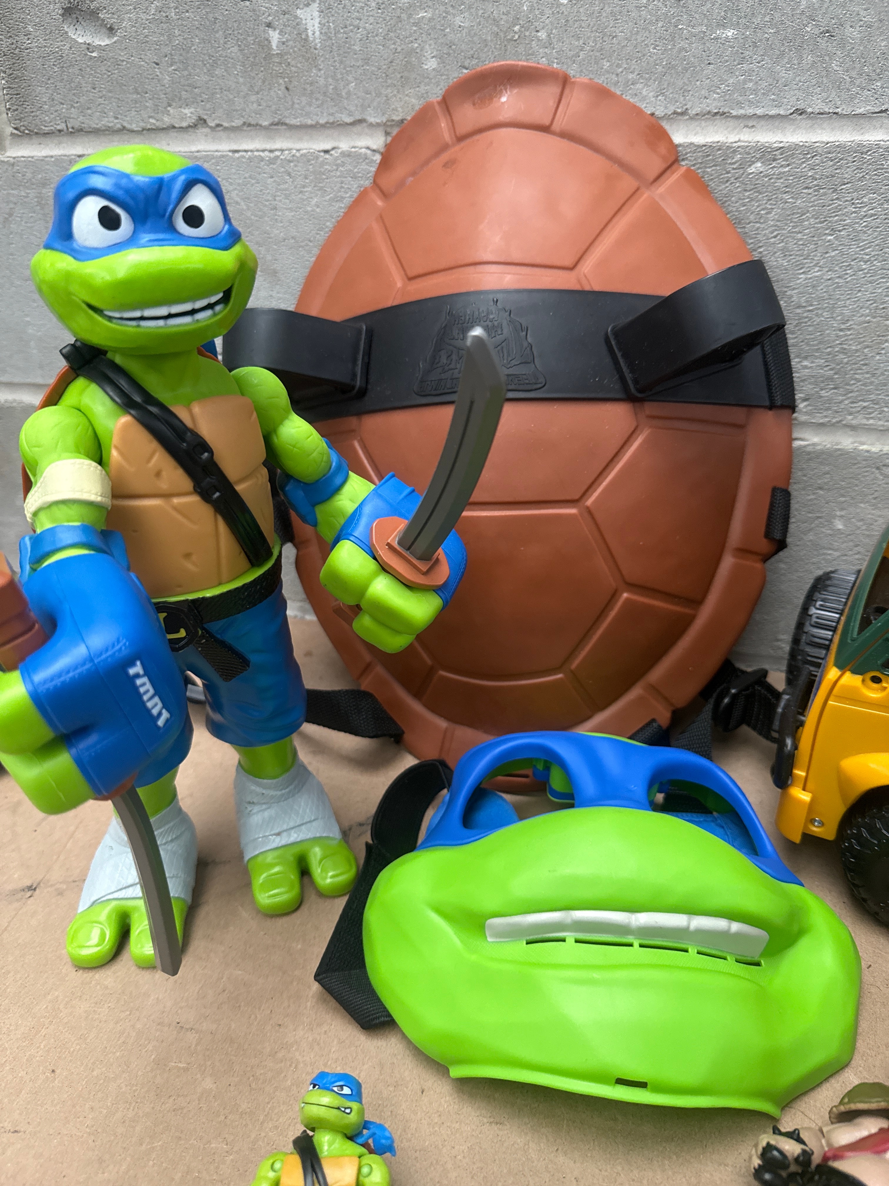 A collection of Teenage Mutant Ninja Turtles (TMNT) themed plastic toys, comprising a large-scale Leonardo action figure with “TMNT” visible on its blue wristband, a brown plastic turtle shell backpack with straps, and a green and blue plastic turtle face mask. The lot also includes a yellow plastic toy vehicle, styled as the “Turtle Van” with a rooftop turret. Further items consist of numerous smaller plastic action figures, depicting various turtle characters and other figures from the franchise, along with miscellaneous plastic accessories such as weapons, a brown cube, and a yellow block. The items are primarily constructed from plastic.