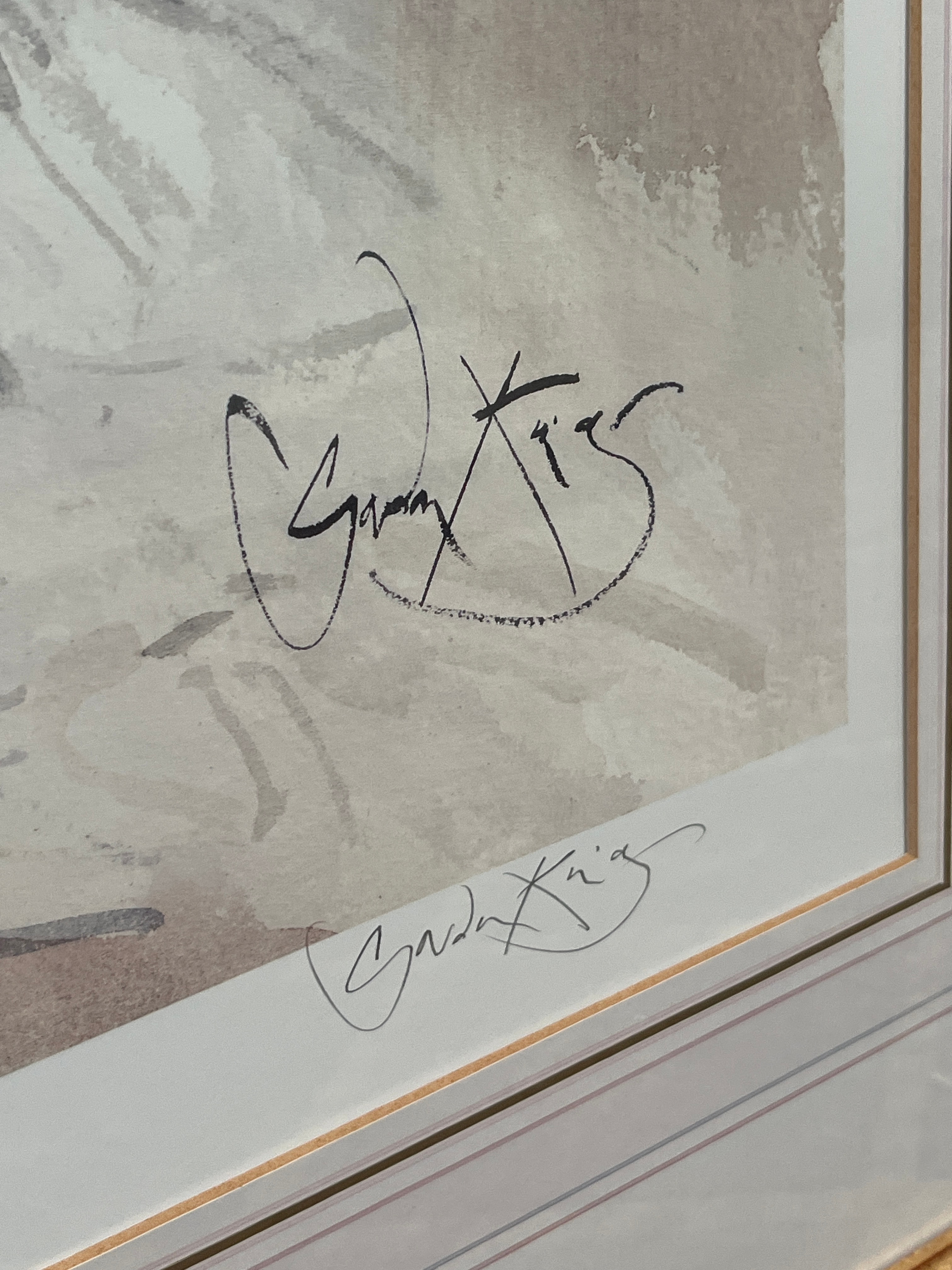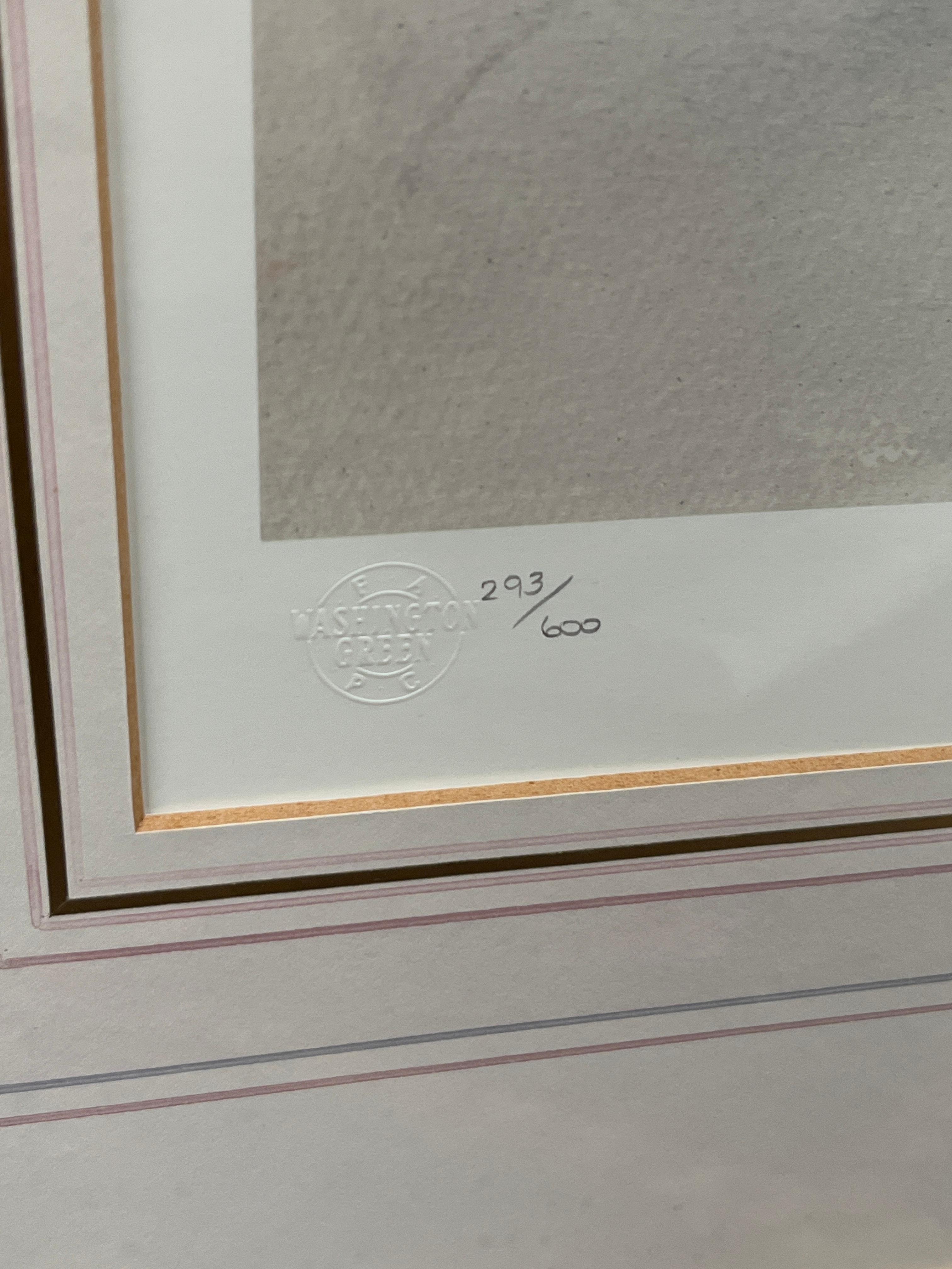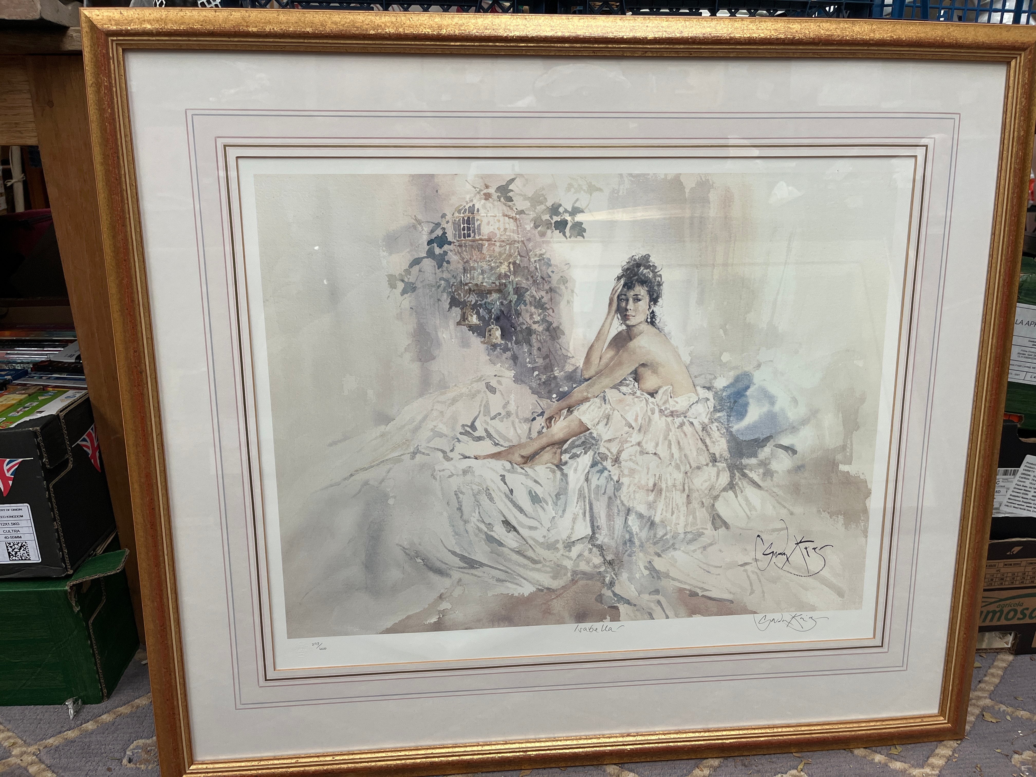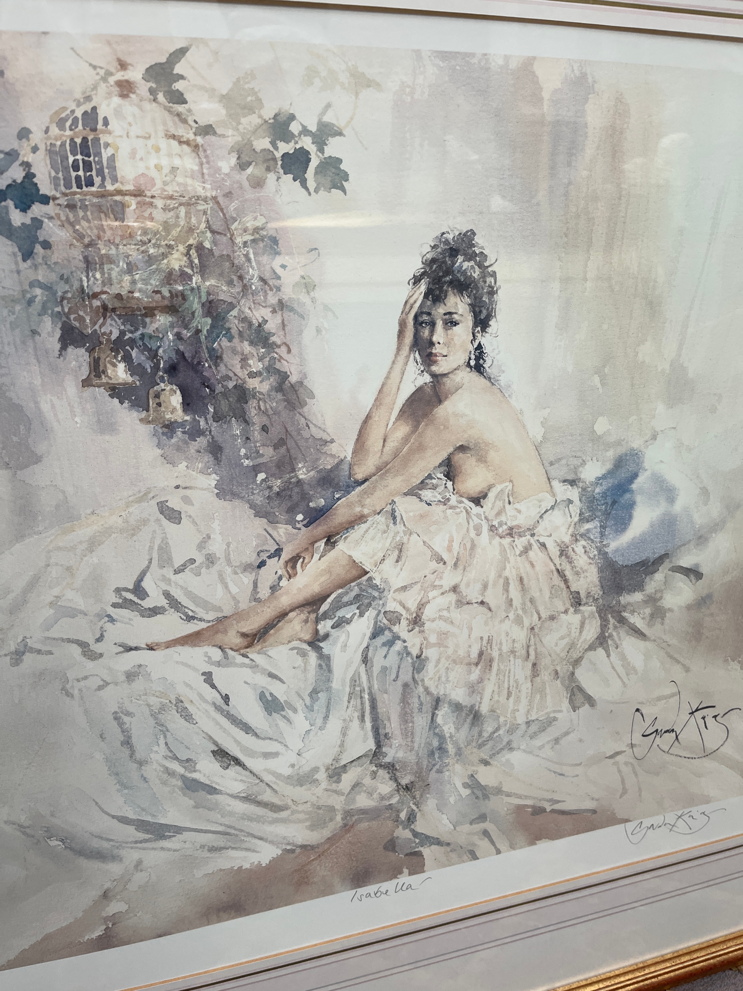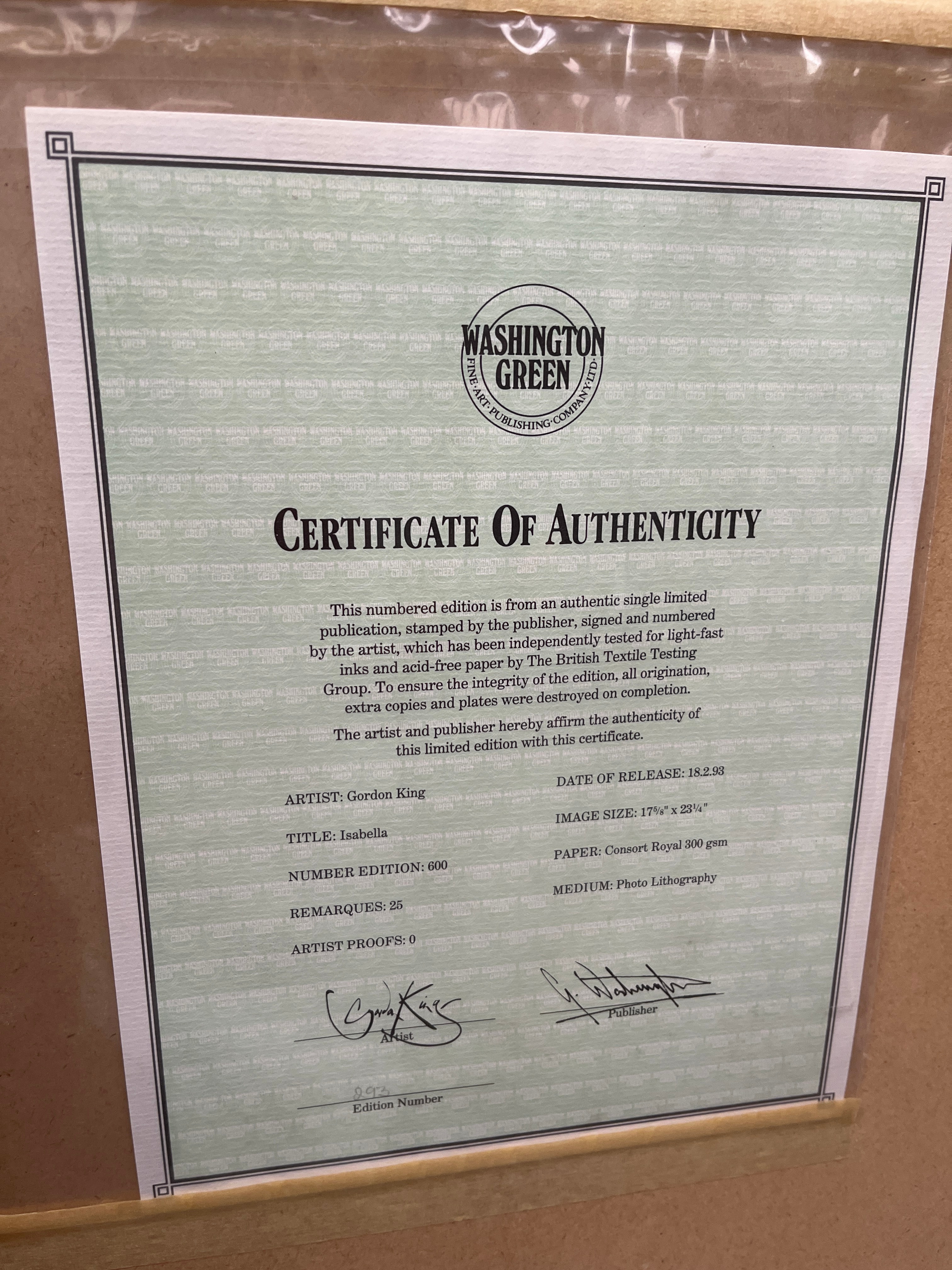 A limited edition signed photo lithograph by Gordon King, titled ‘Isabella’. Numbered 293/600, this print was released on 18.2.93 and published by Washington Green. The artwork depicts a romantic, figurative scene featuring a partially draped female figure seated amidst soft drapery, with a birdcage and foliage in the background, rendered in a style evocative of watercolor. It is presented under glass with triple matting within a decorative gilt-colored frame. Visible markings include the hand-written edition number, the title “Isabella,” two signatures (one identifiable as Gordon King), and an embossed “WASHINGTON GREEN” publisher’s stamp. A Certificate of Authenticity confirming the artist, title, medium, and edition size is affixed to the reverse.