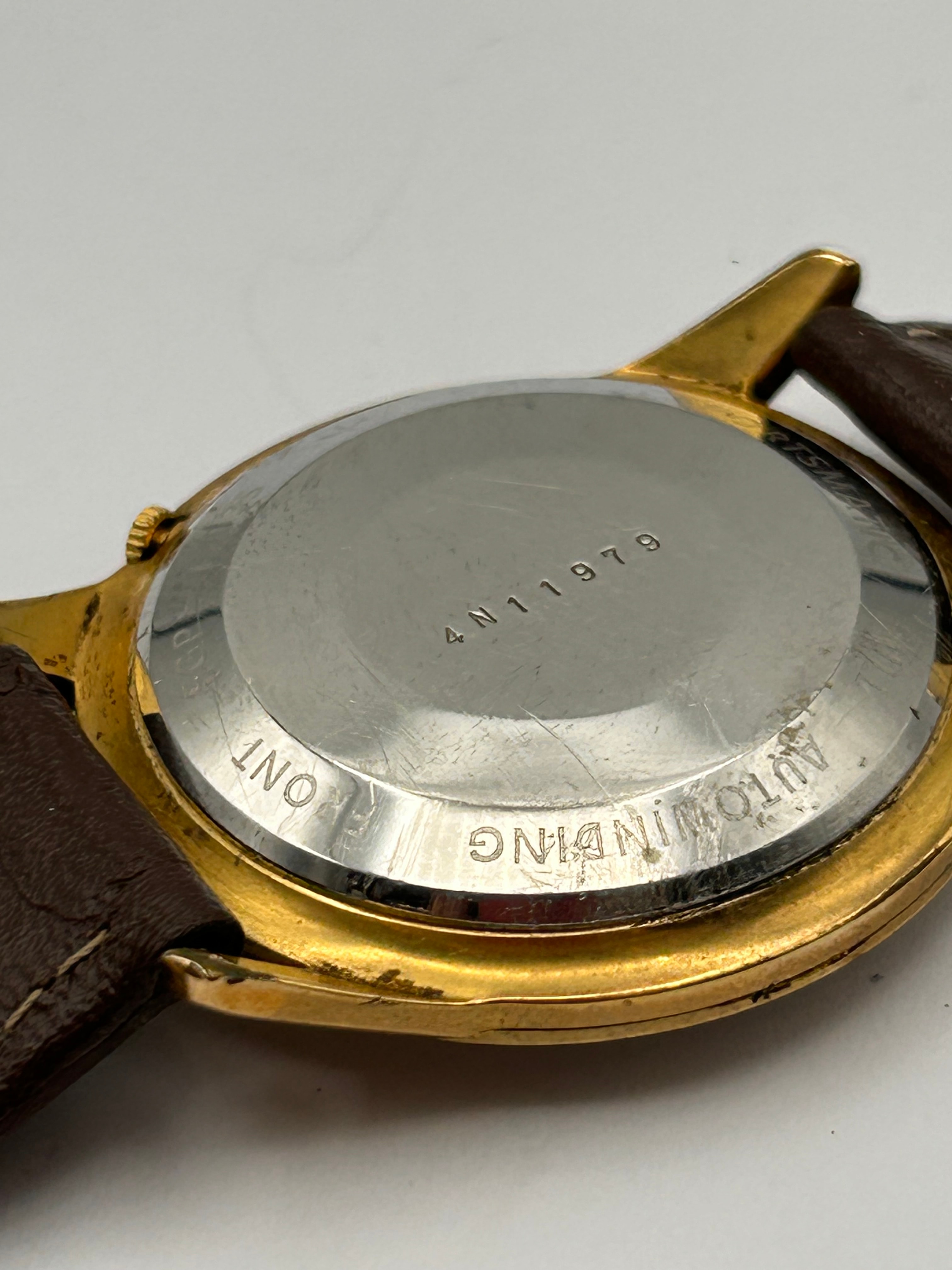 A vintage Seiko Sportsmatic automatic wristwatch. Featuring a gold-tone case, a silver-tone dial with applied gold-tone stick hour markers and hands, and a brown leather strap. The dial is marked “Seiko Sportsmatic” with a small logo below 12 o’clock, “Diashock” and “21 Jewels” near 6 o’clock. The stainless steel case back is engraved with the serial number “4N11979” and the text “AUTOMATIC”, “STAINLESS STEEL BACK”, and partially “WATERPROOF”.