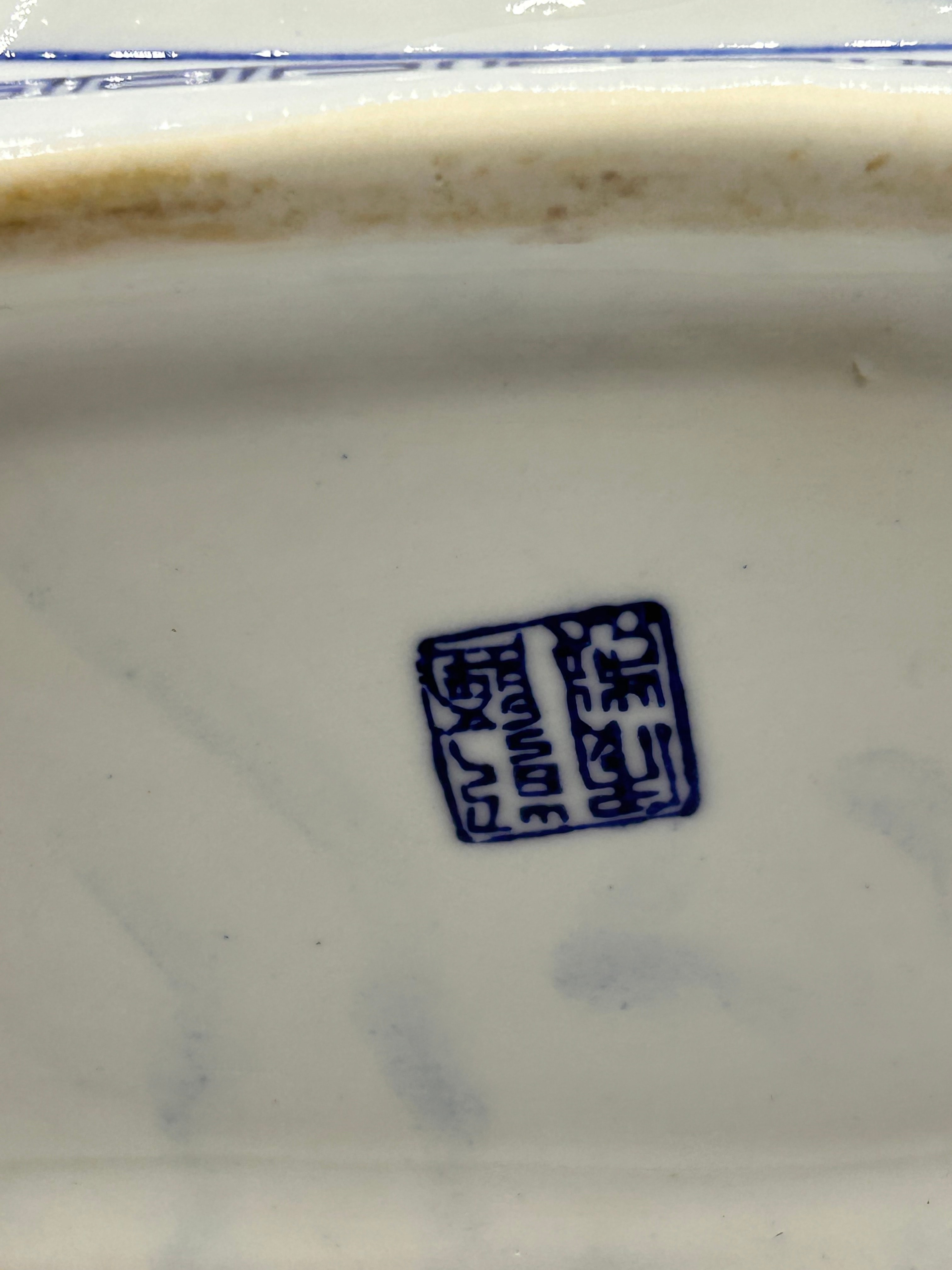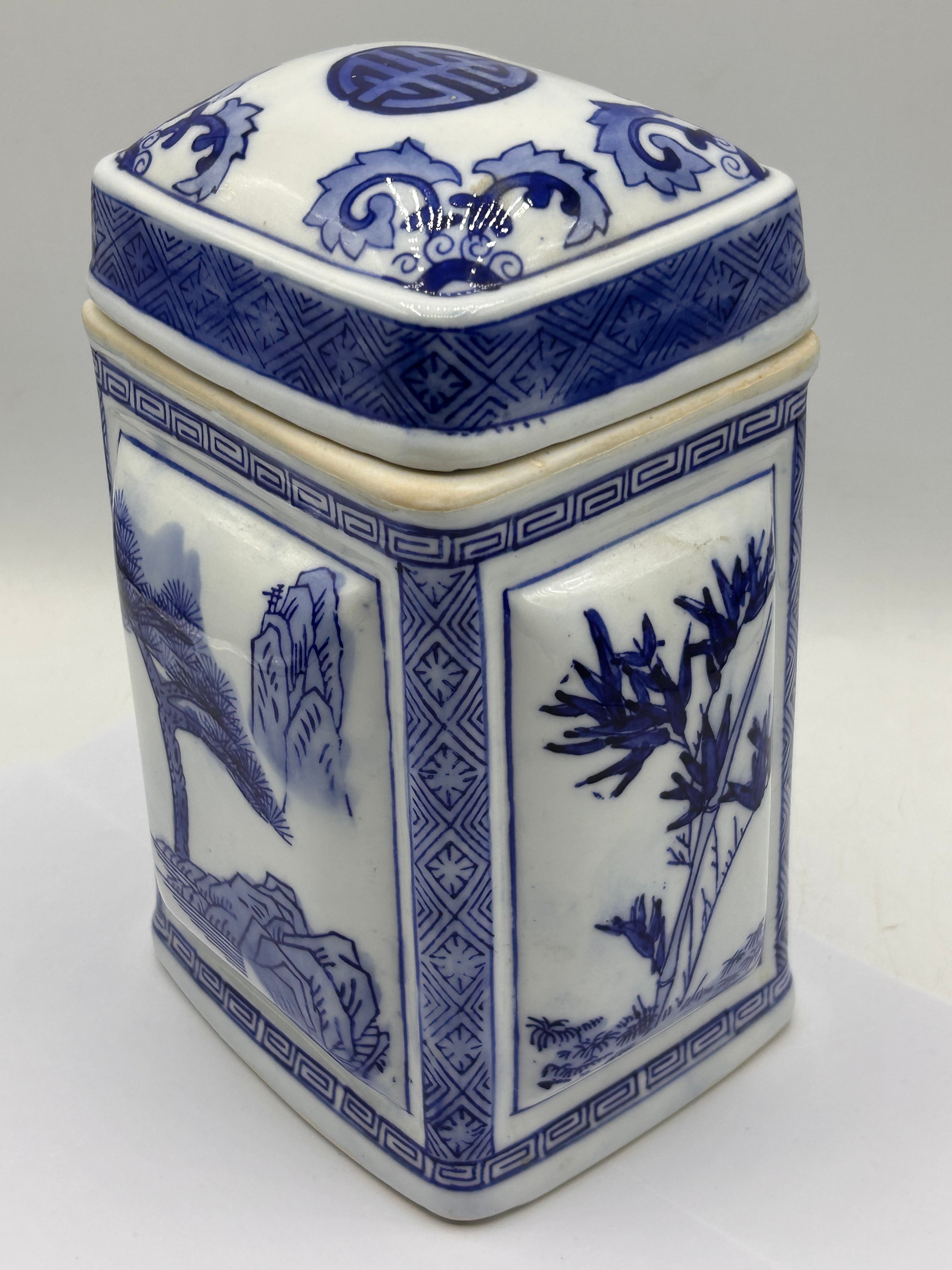 A 19th Century Chinese blue and white porcelain covered jar. The lidded rectangular jar features a crisp white ground with underglaze cobalt blue designs. Framed landscape panels depict pine trees and mountains on one side, and bamboo on another, bordered by geometric fretwork patterns. The square lid’s top centrally displays a stylized **壽 (Shòu)** character, meaning “longevity,” surrounded by scrolling motifs. The base bears a square blue seal mark which translates to **乾隆年製 (Qiánlóng Nián Zhì)**, indicating “Made in the Qianlong reign,” though the piece is attributed to the 19th century based on market consensus.