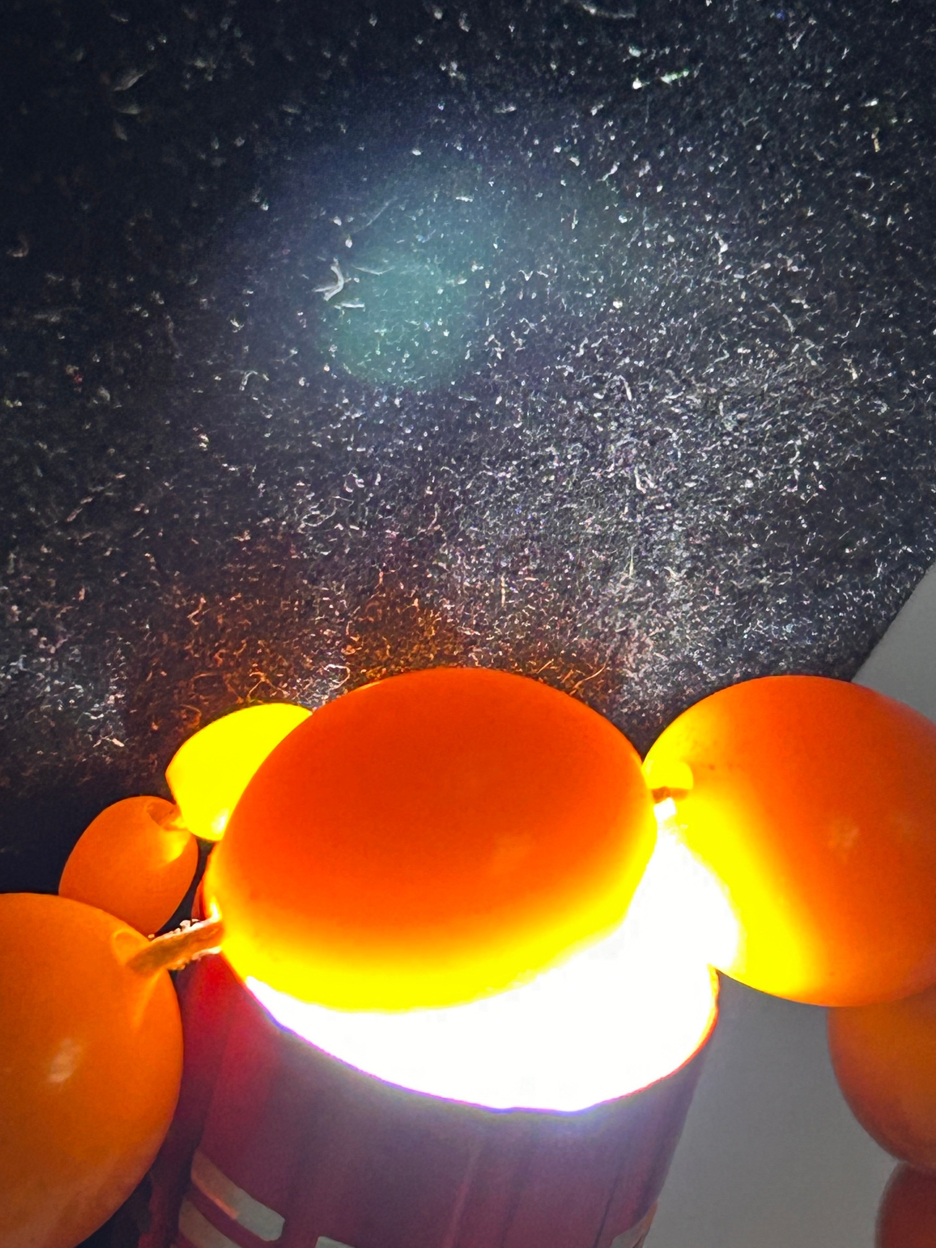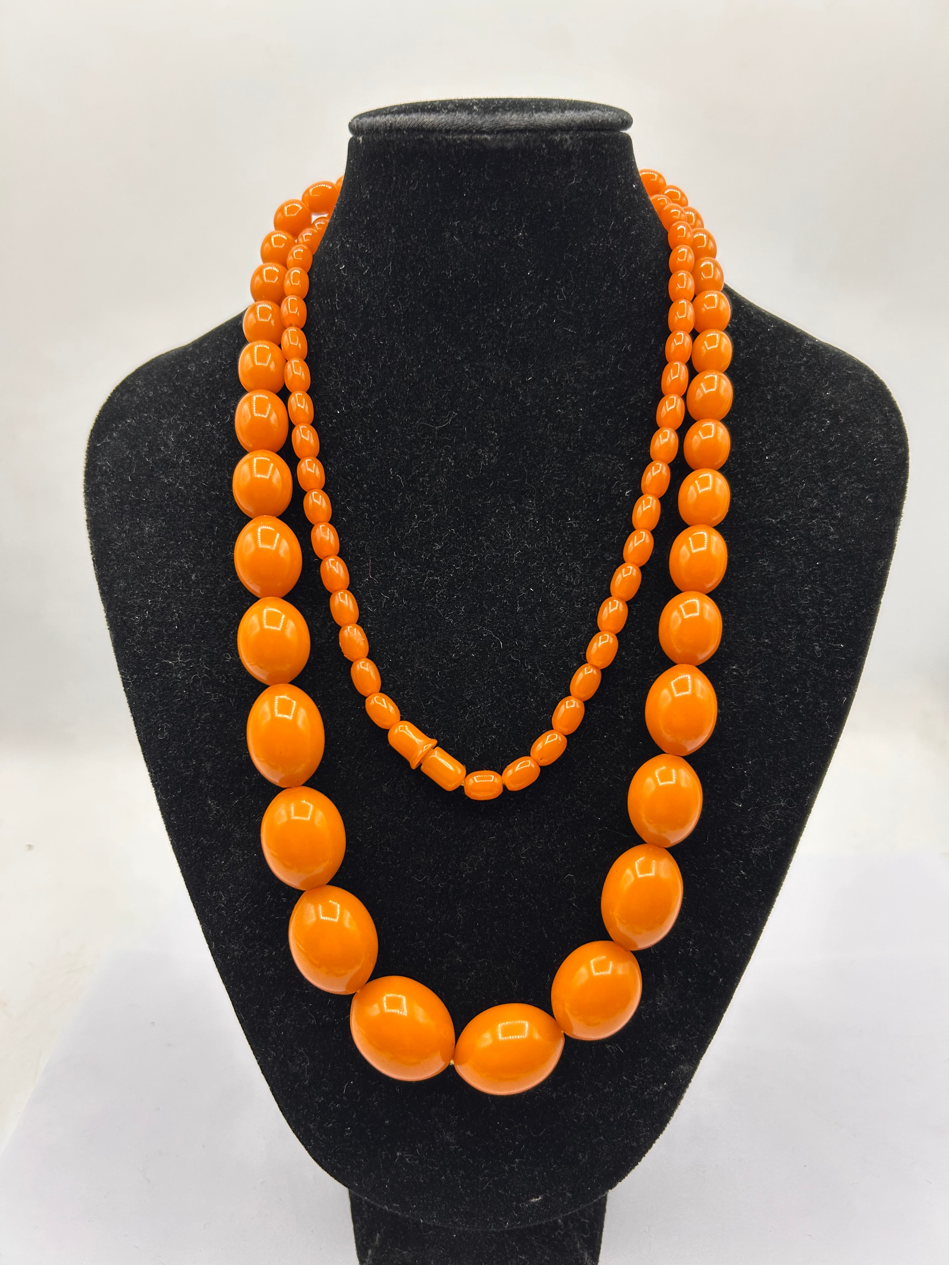 A double-strand beaded necklace, identified as graduated egg yolk butterscotch Bakelite. The necklace features vibrant, glossy orange, polished beads. The shorter strand consists of smaller, relatively uniform oval beads, while the longer strand displays graduated, larger oval beads, with the largest at the center front. The beads exhibit translucency and glow with a warm yellow-orange hue when illuminated. A barrel-style clasp, made of the same orange material, secures the shorter strand. No visible text or distinguishing markings are apparent on the beads or clasp.