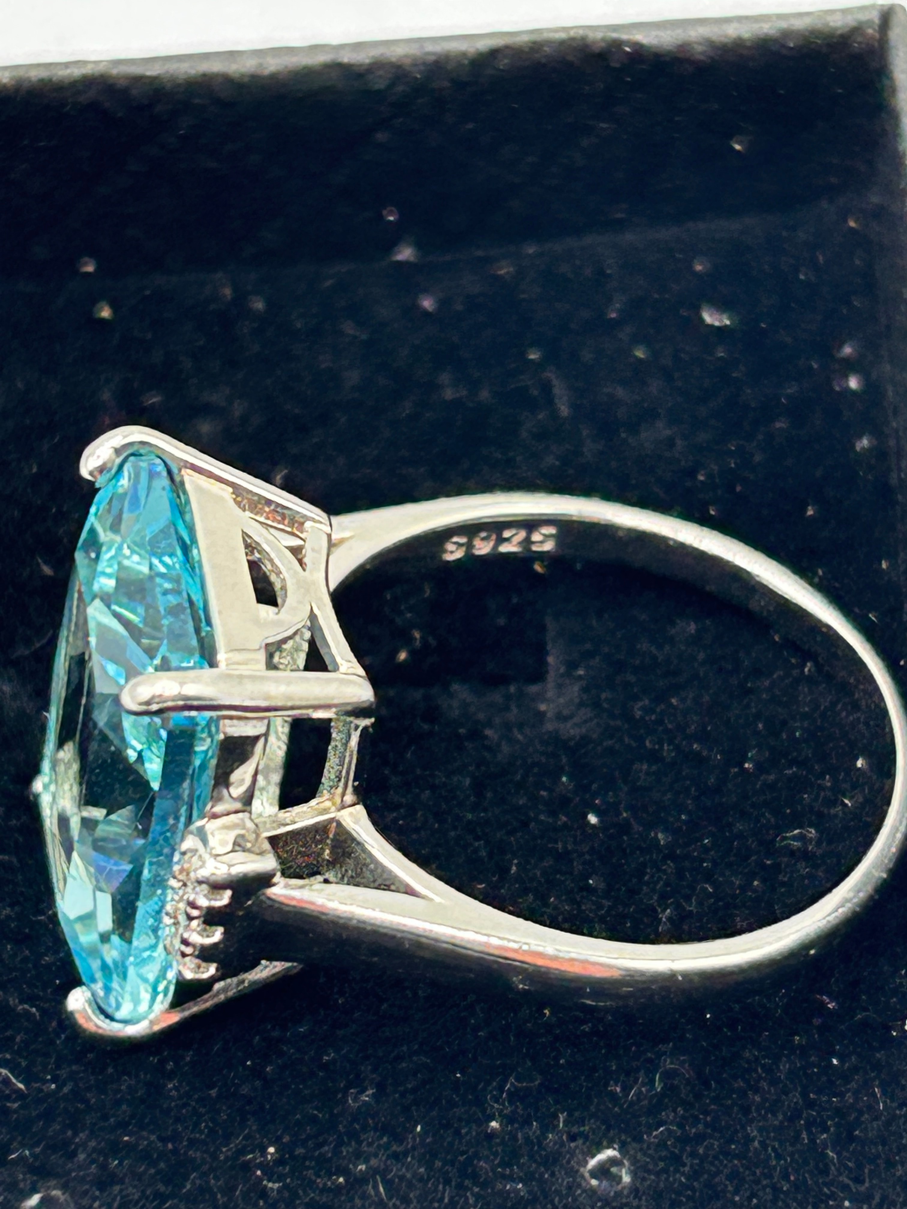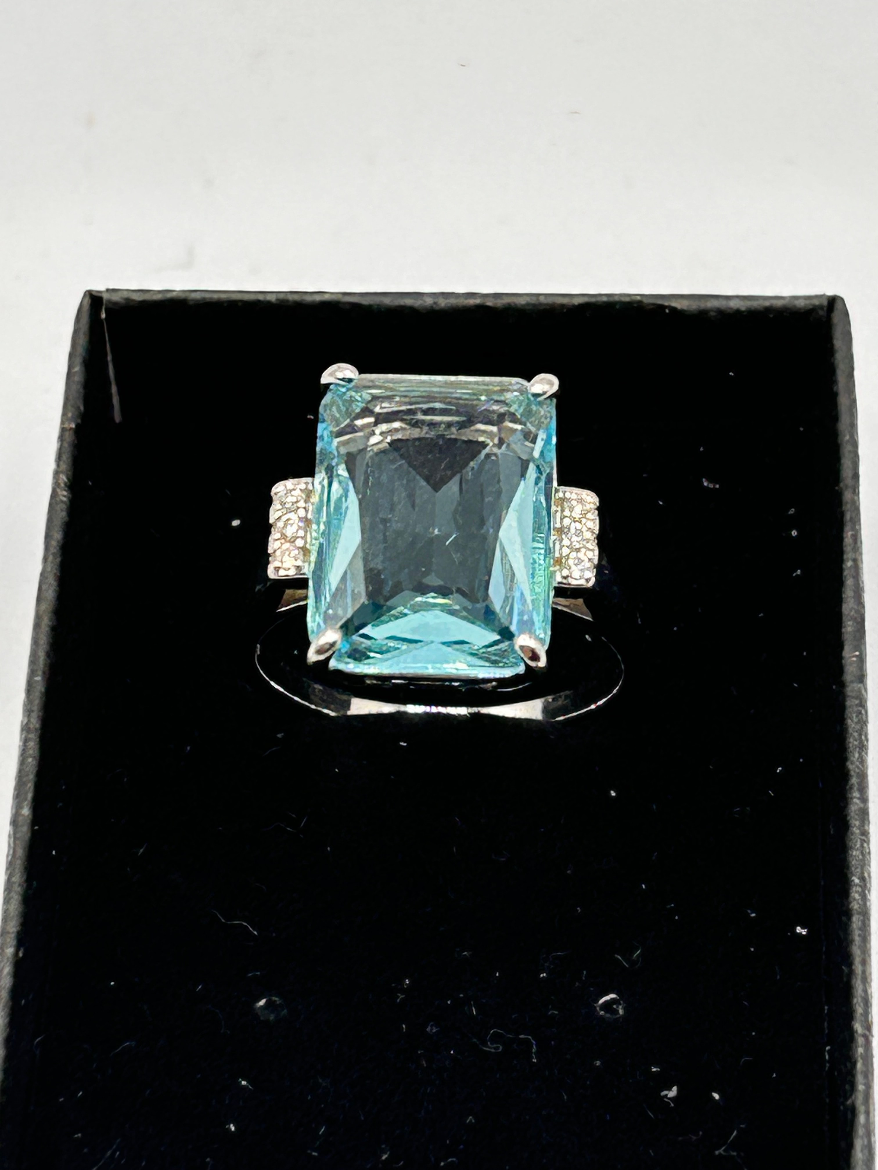 An Aquamarine and Cubic Zirconia ring in Sterling Silver. This modern ring features a prominent, rectangular, step-cut faceted blue aquamarine gemstone as its centerpiece. It is flanked on either side by pavé-set clusters of small, round, clear faceted cubic zirconia stones. The band is smooth, and the inside is marked “S925”, confirming its sterling silver composition.