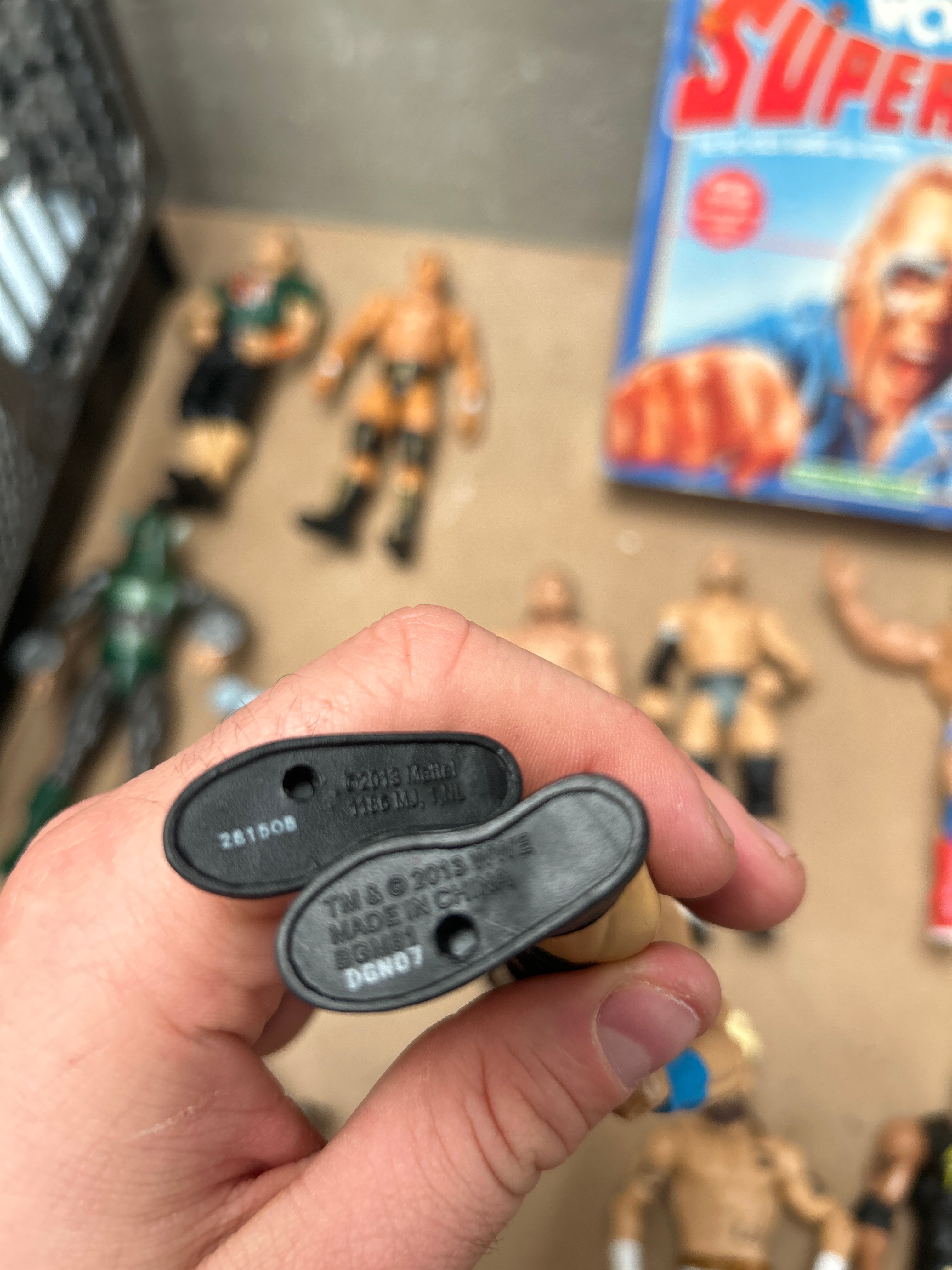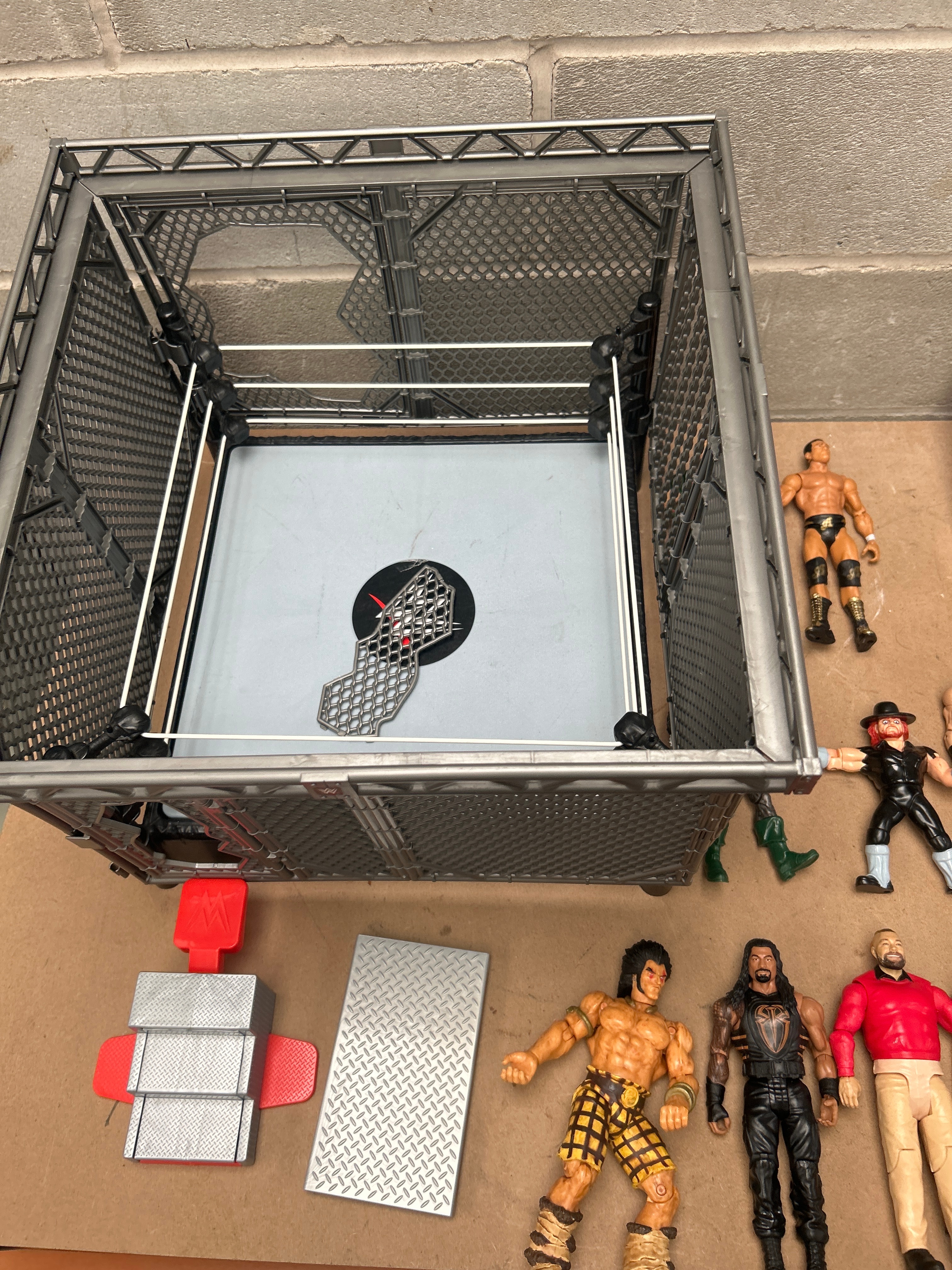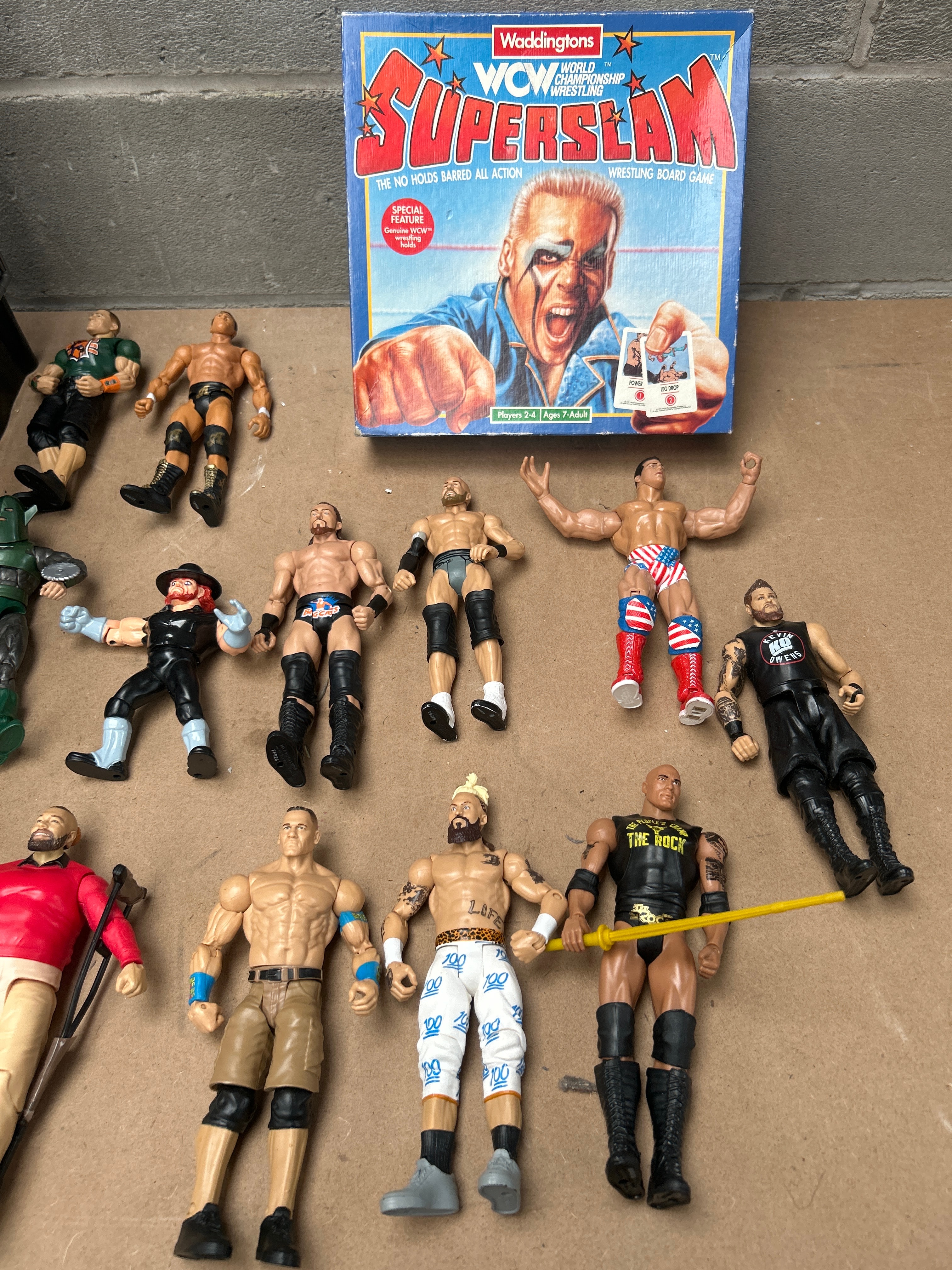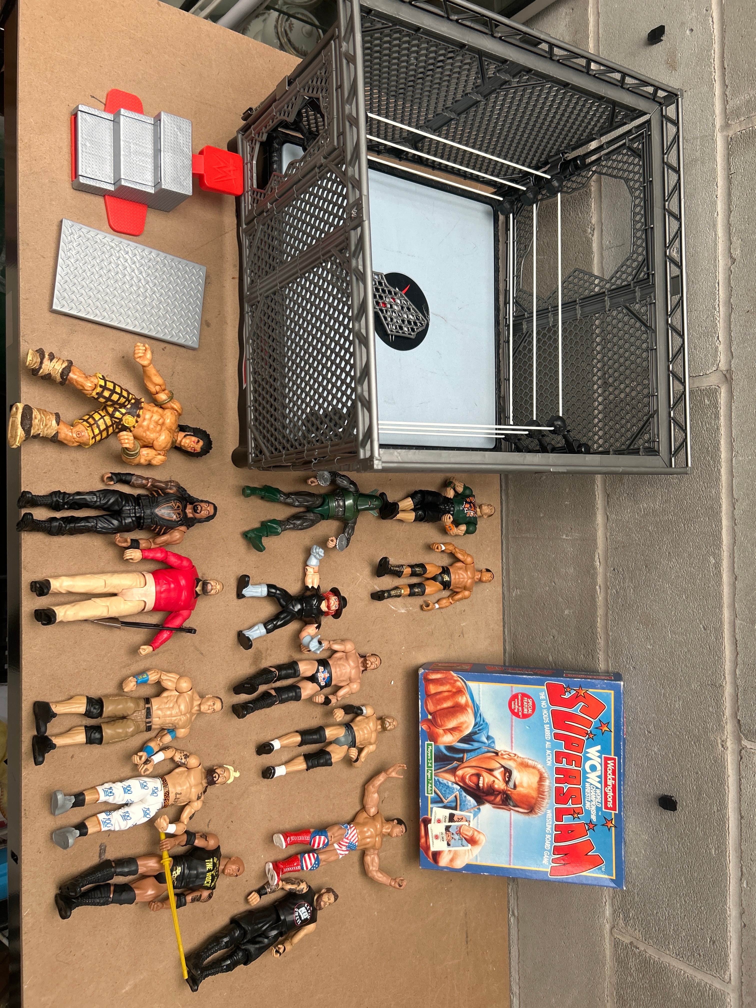 A WWE Mattel Wrekkin’ Collision Cage Playset, comprising a large grey plastic wrestling cage playset with an internal ring and a movable ladder accessory. Accompanying this is a collection of approximately 20-25 articulated plastic action figures depicting various male professional wrestlers, exhibiting diverse attire and some accessories. One figure’s foot is visibly marked “TM & © 2013 Mattel H.B.M. MG., TM.” and “MADE IN CHINA DGN07,” confirming Mattel as the manufacturer for the figures. Also included is a Waddingtons WCW SuperSlam Wrestling Board Game in its original cardboard box. The box prominently features a wrestler (likely Sting) and is labeled “Waddingtons,” “WCW World Championship Wrestling,” “SUPERSLAM,” “WRESTLING BOARD GAME,” and “THE NO HOLDS BARRED ALL ACTION!”