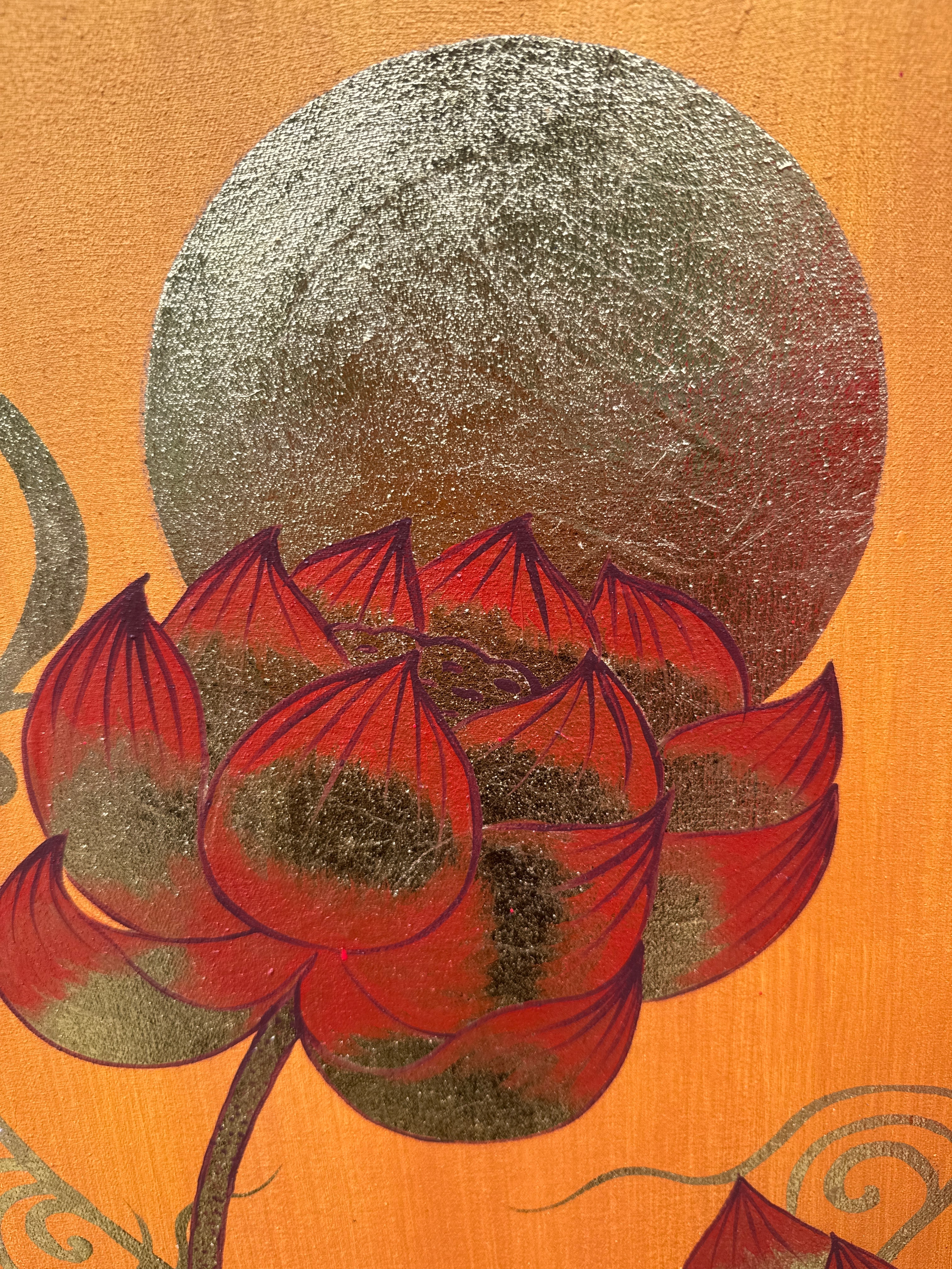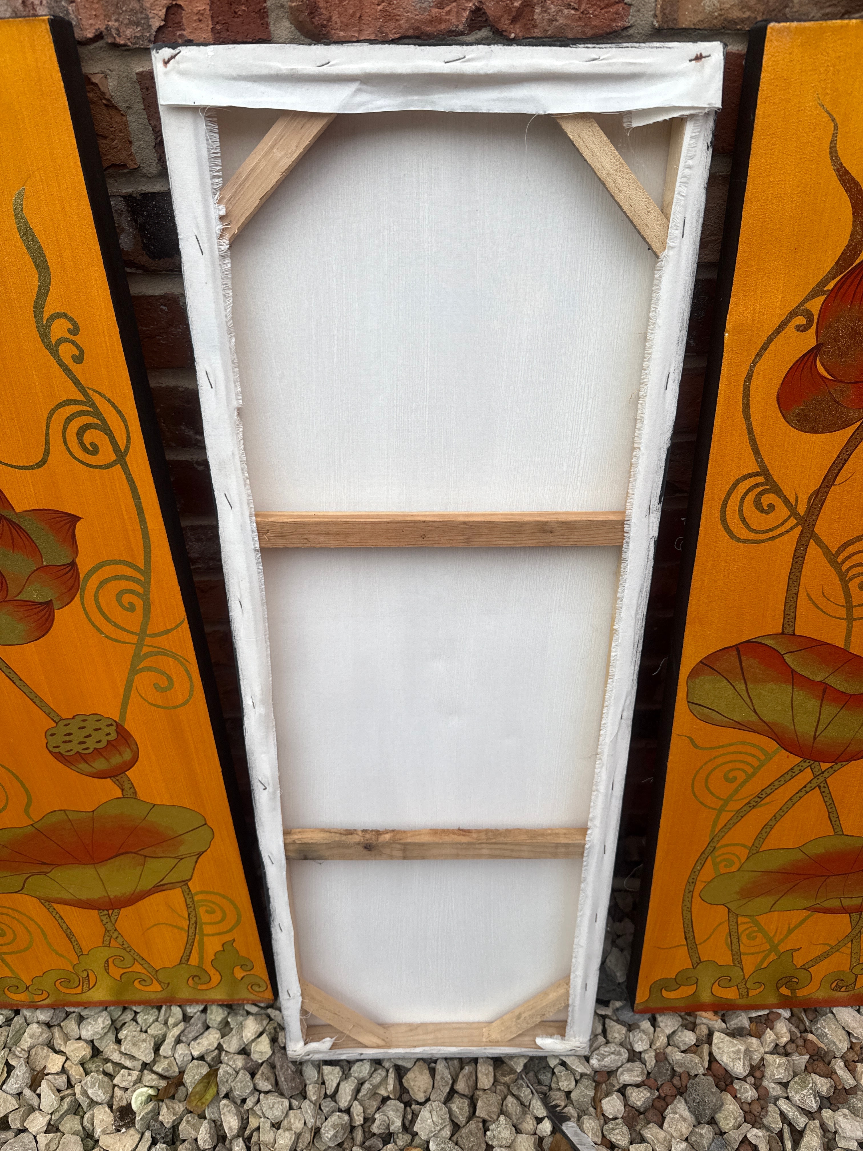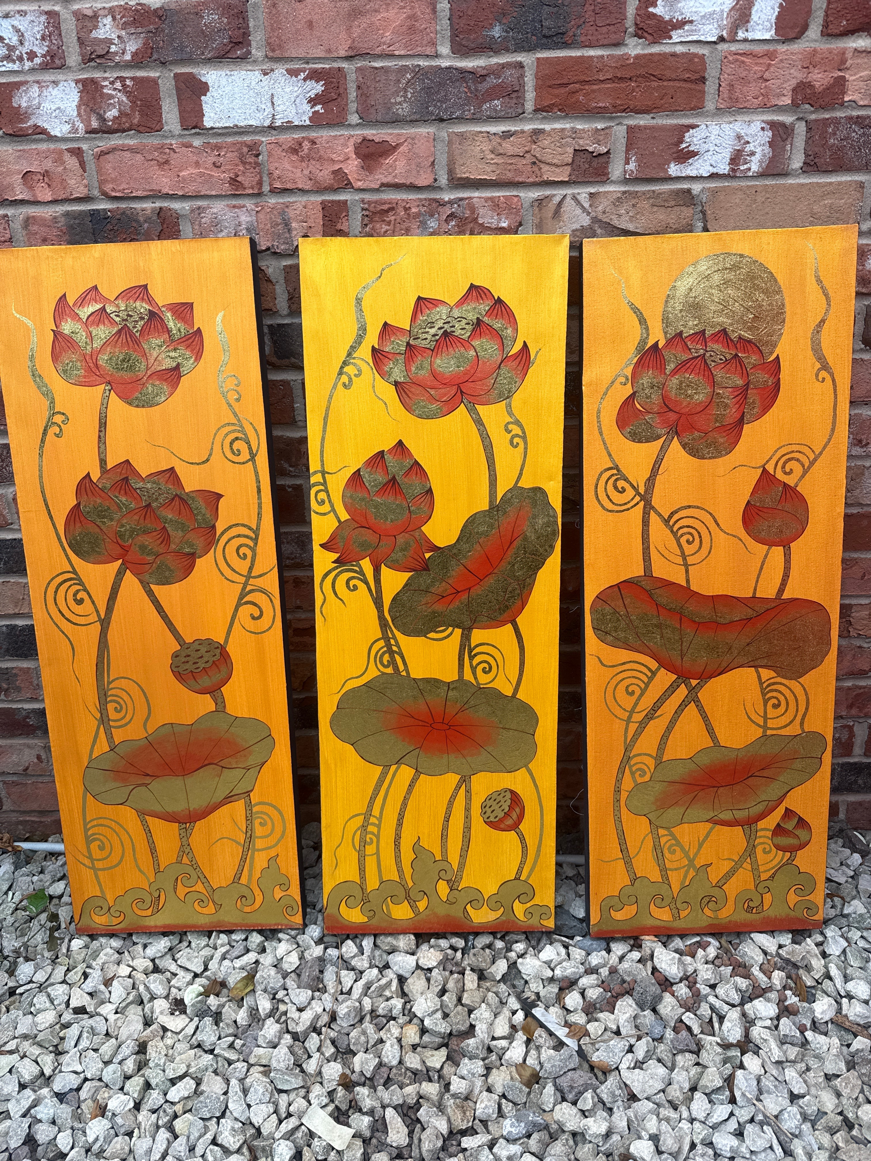 A set of three traditional Thai lotus flower paintings. Each vertical canvas depicts stylized lotus flowers, buds, and leaves with intricate swirling decorative elements, rendered in an East Asian-inspired aesthetic. The botanicals are depicted in red and muted green tones, significantly accented with applied gold-toned metallic leaf that also forms ornate swirls and outlines. The rightmost panel features a large, textured silver-toned circular motif, also in metallic leaf. The background is a vibrant orange-yellow. The canvases are stretched over modern wooden stretcher bars, which are visible from the reverse.