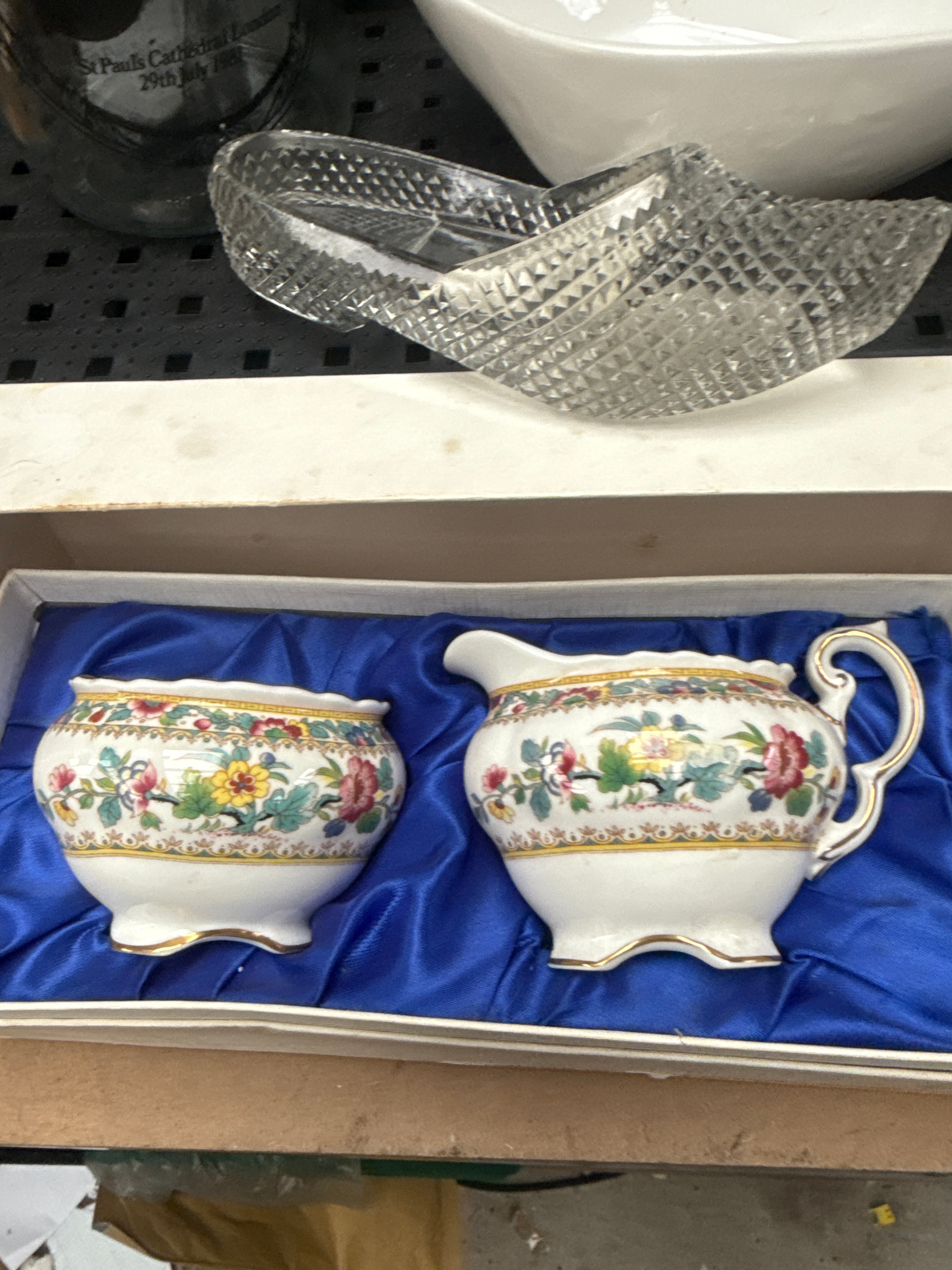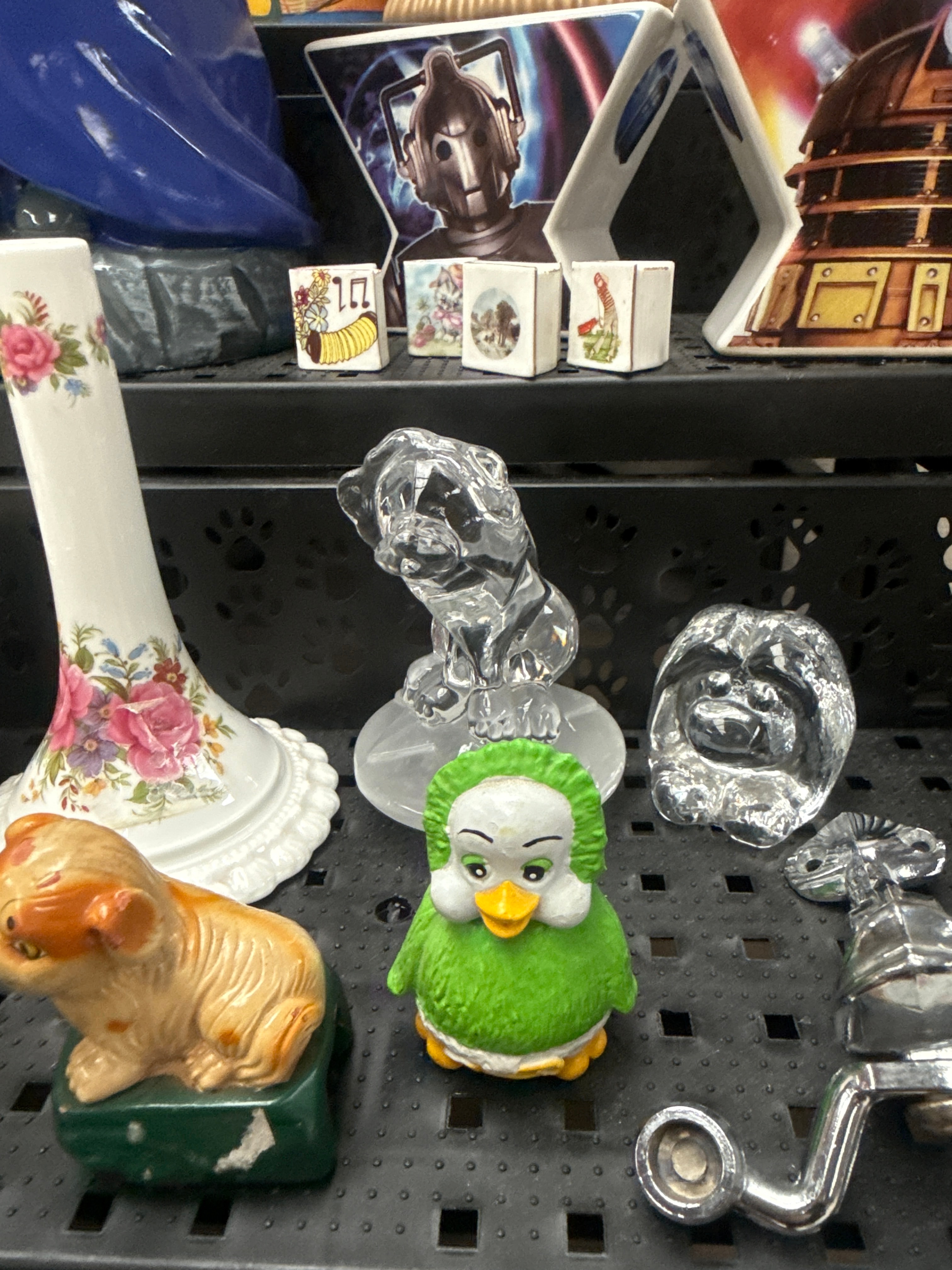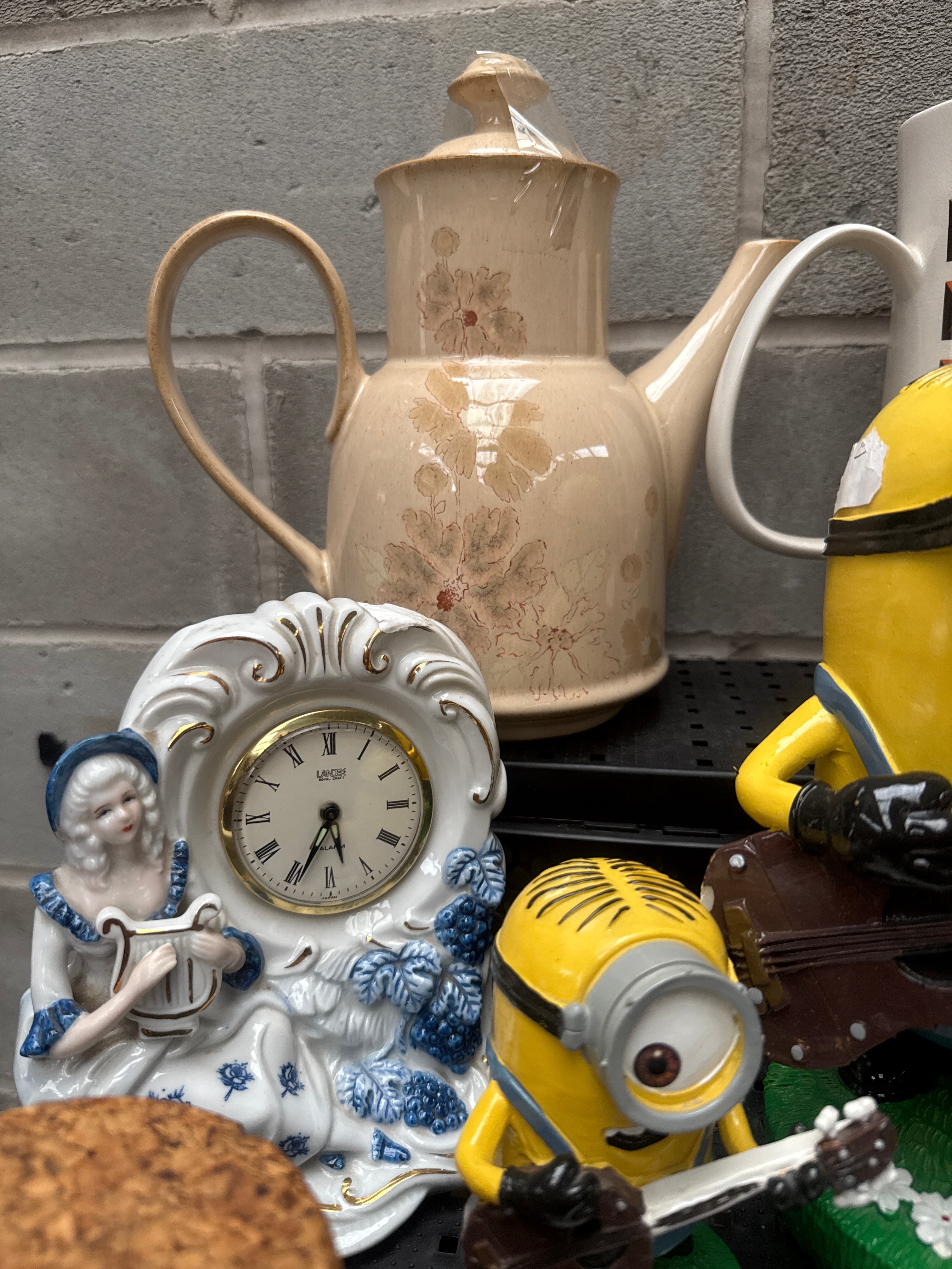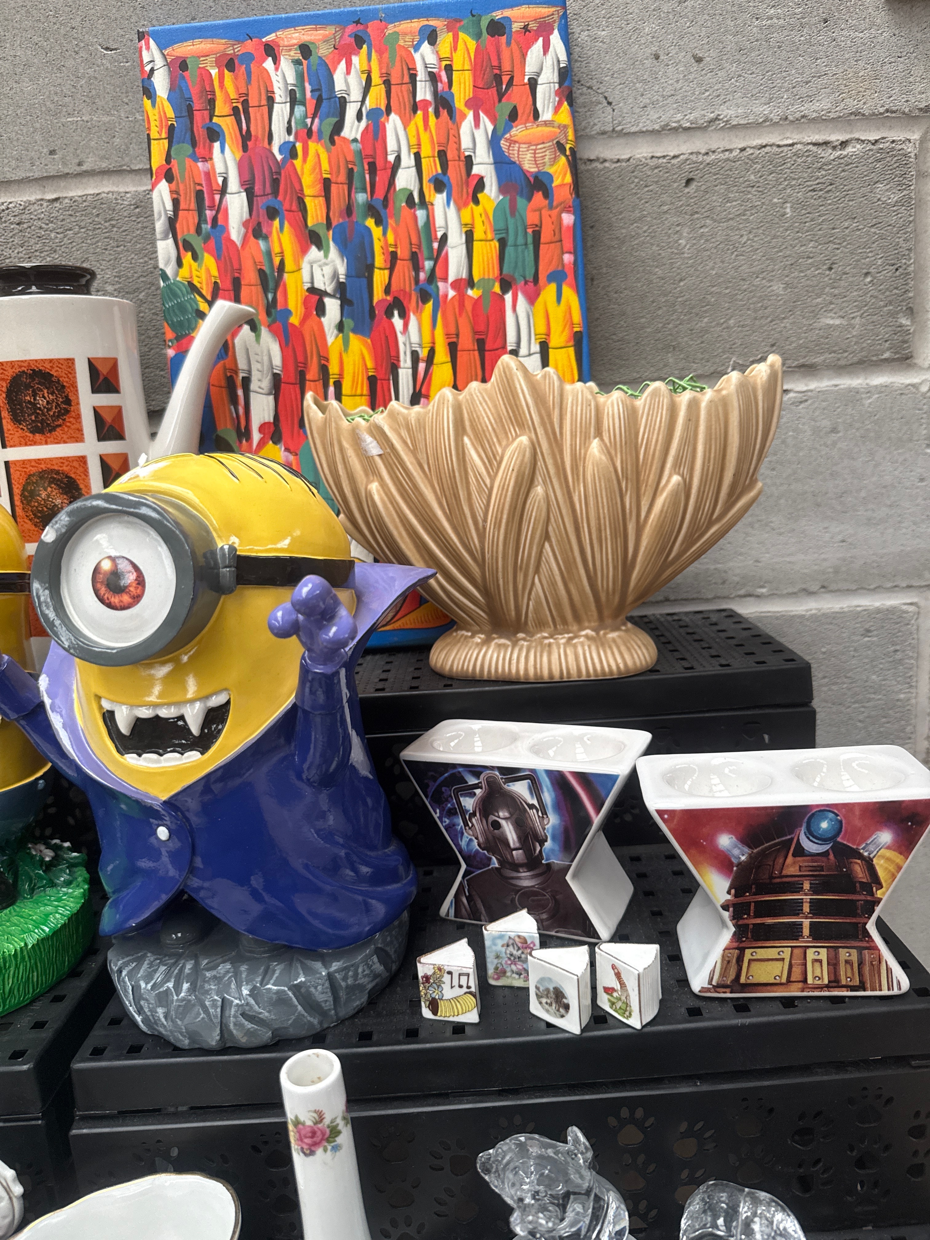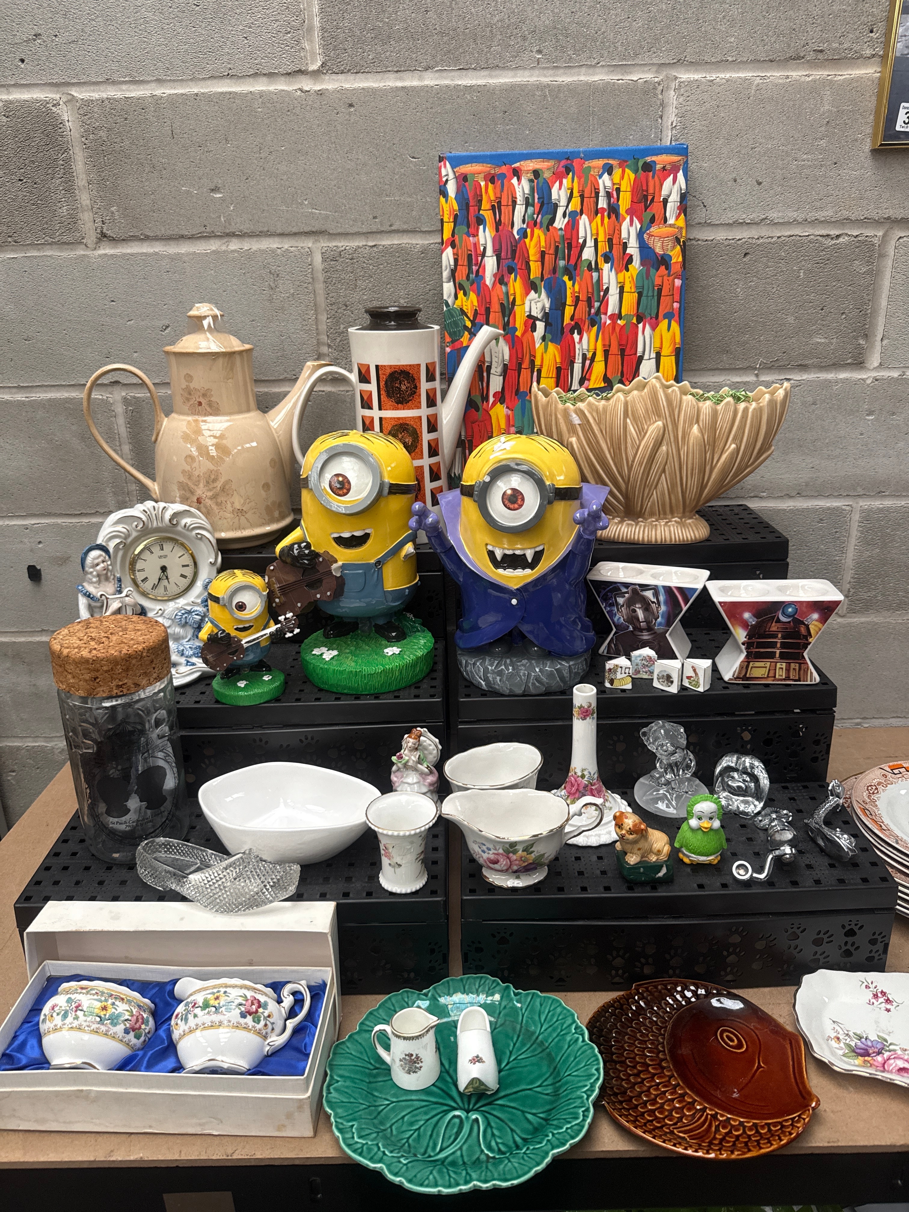 A diverse collection of decorative and functional household items, predominantly crafted from ceramic, glass, and resin. The collection includes three contemporary yellow Minion character figurines, two “Doctor Who” themed ceramic vessels featuring a Cyberman and a Dalek, and a vibrant abstract-figurative painting on canvas depicting a crowd of people. Ceramic items comprise two traditional-style teapots (one beige with subtle floral decals, another white with geometric patterns), a modern fluted earthenware vase, and a white ornate mantel clock by “La Crosse” with a Roman numeral face and a classical female figure. Also present is a boxed set of intricately decorated floral and gold-accented ceramic creamer and sugar, possibly by Coalport. A clear cut-glass slipper, various small ceramic and glass animal figurines (some possibly Sylvac), and an assortment of floral-patterned and textured plates and dishes, including a large green leaf-motif plate, complete the lot. The collection reflects a mix of contemporary novelty items, decorative objects, and domesticware, with potential examples from makers such as Denby, Sylvac, and Coalport.