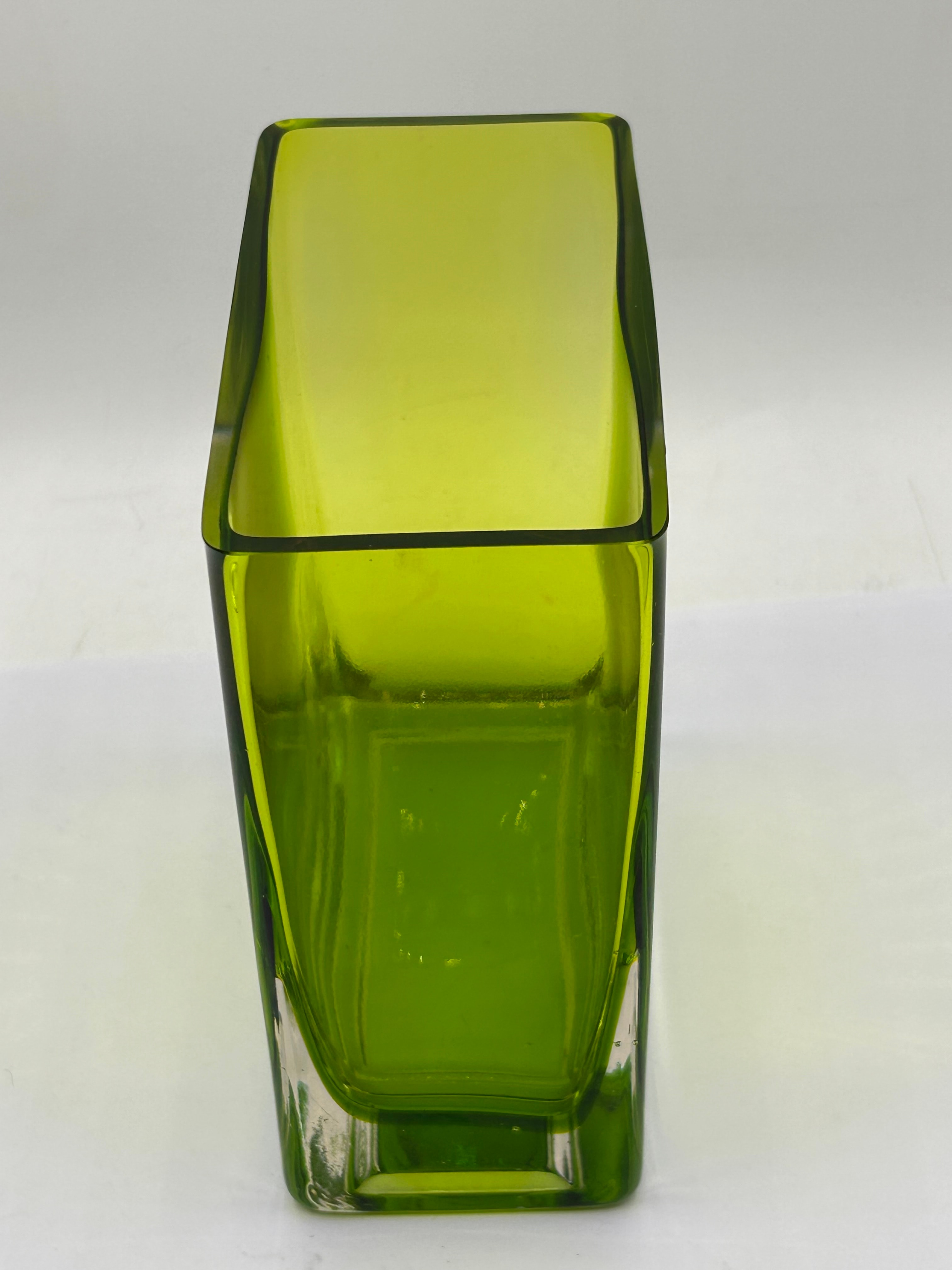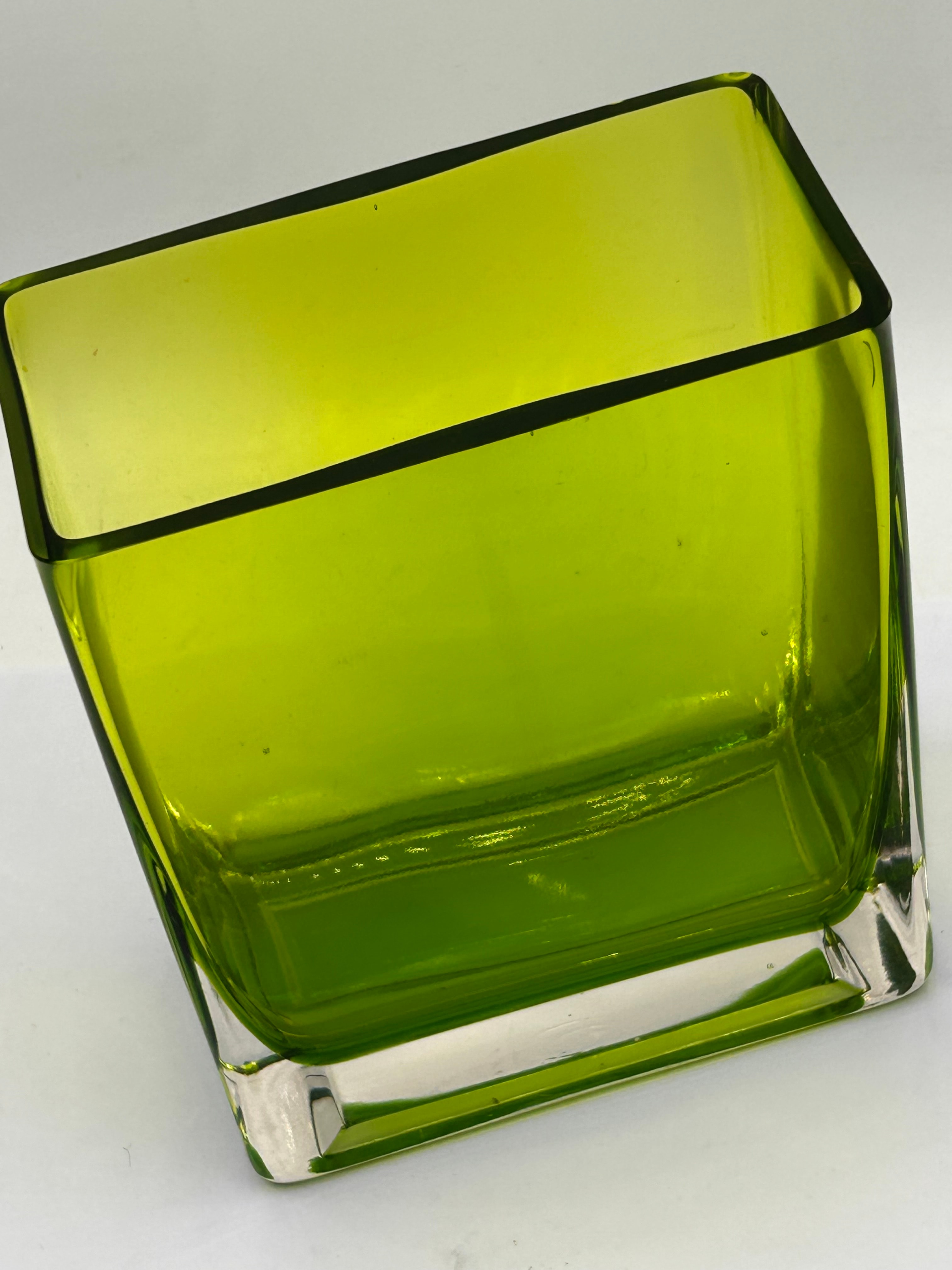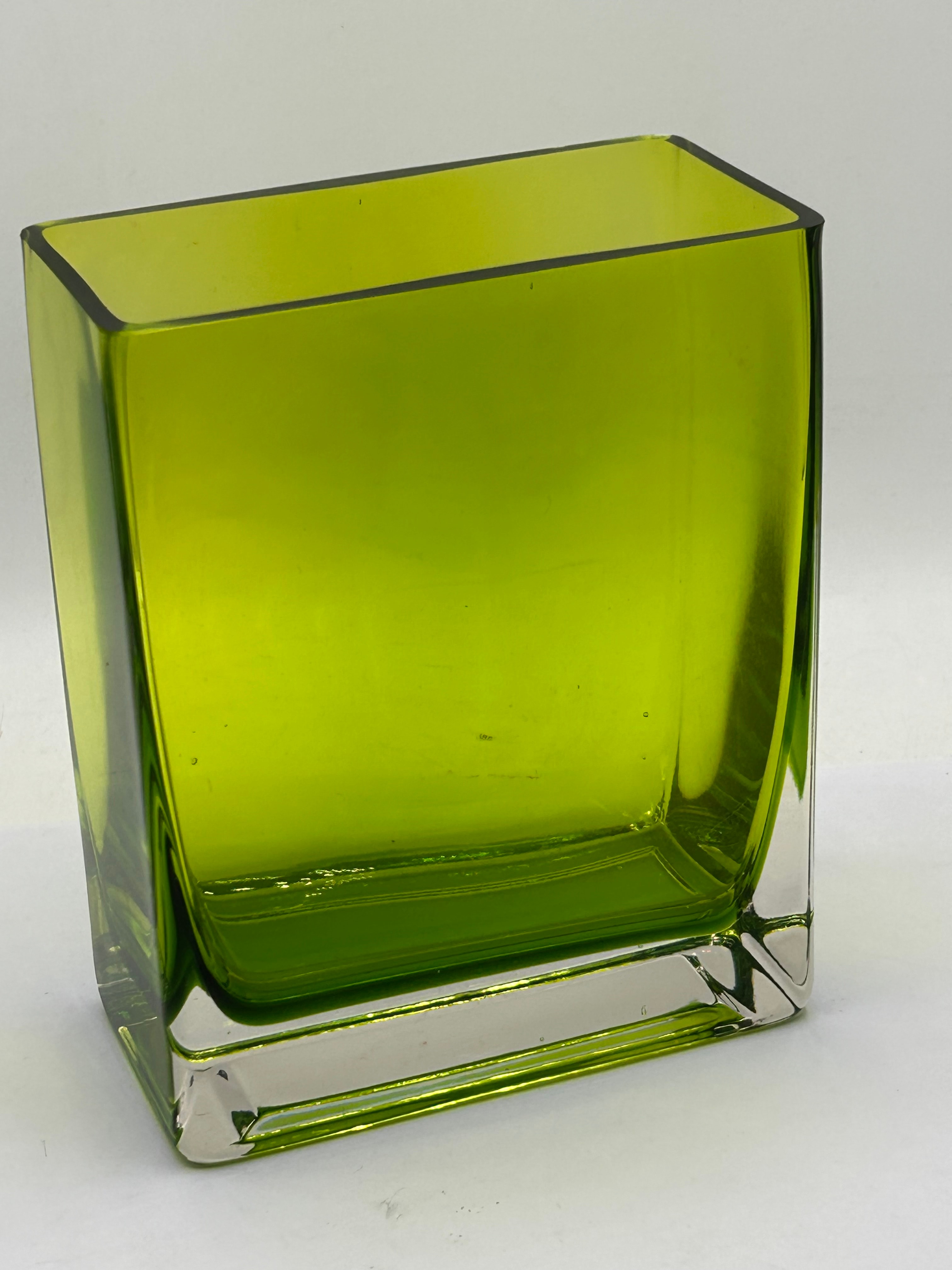 A modern or post-war style rectangular-form glass vase, crafted from vibrant lime green glass with a substantial, clear base and polished rim. Internal air bubbles are present within the glass, indicative of its manufacturing. No discernible manufacturer’s markings or text are visible.