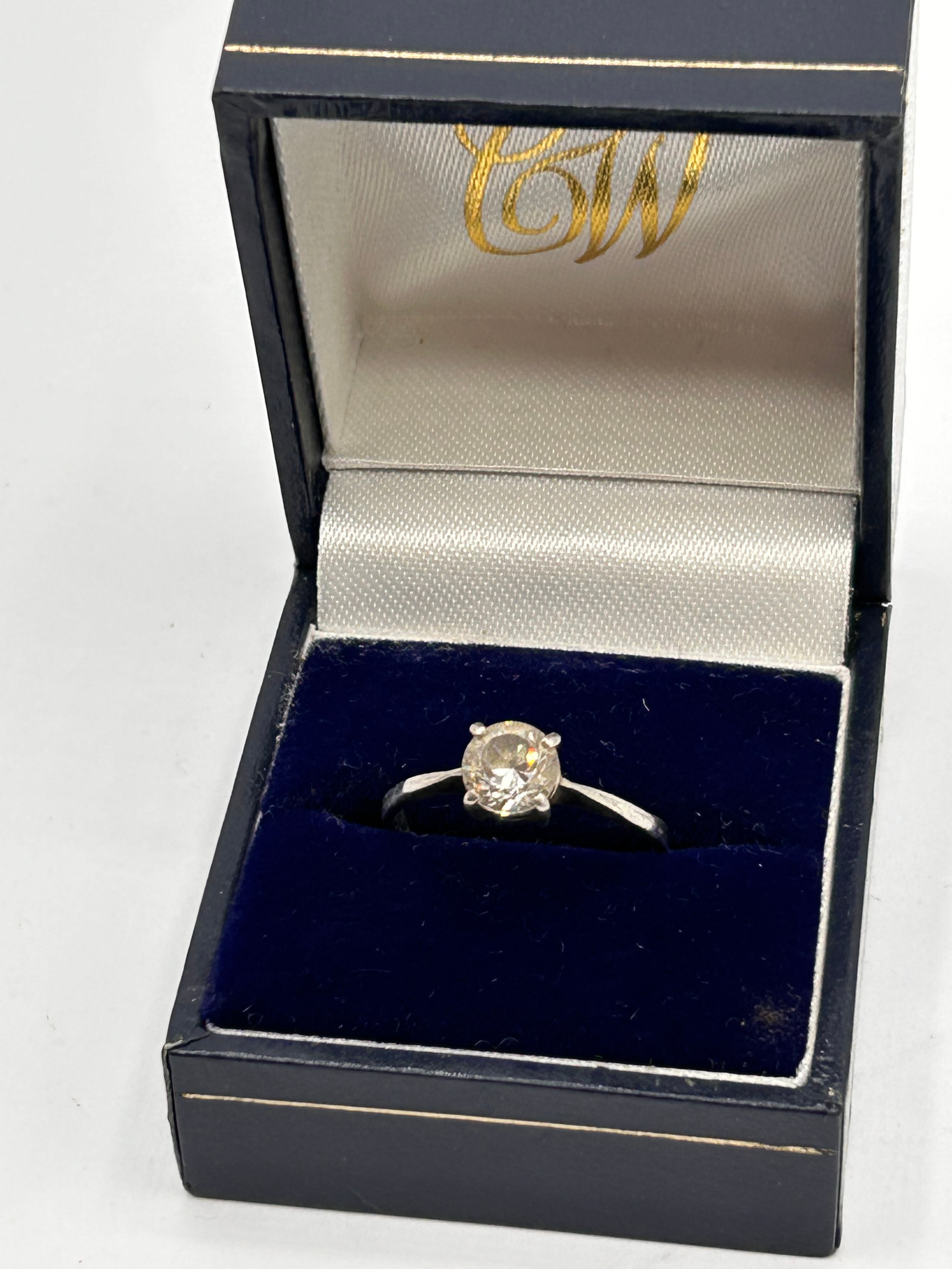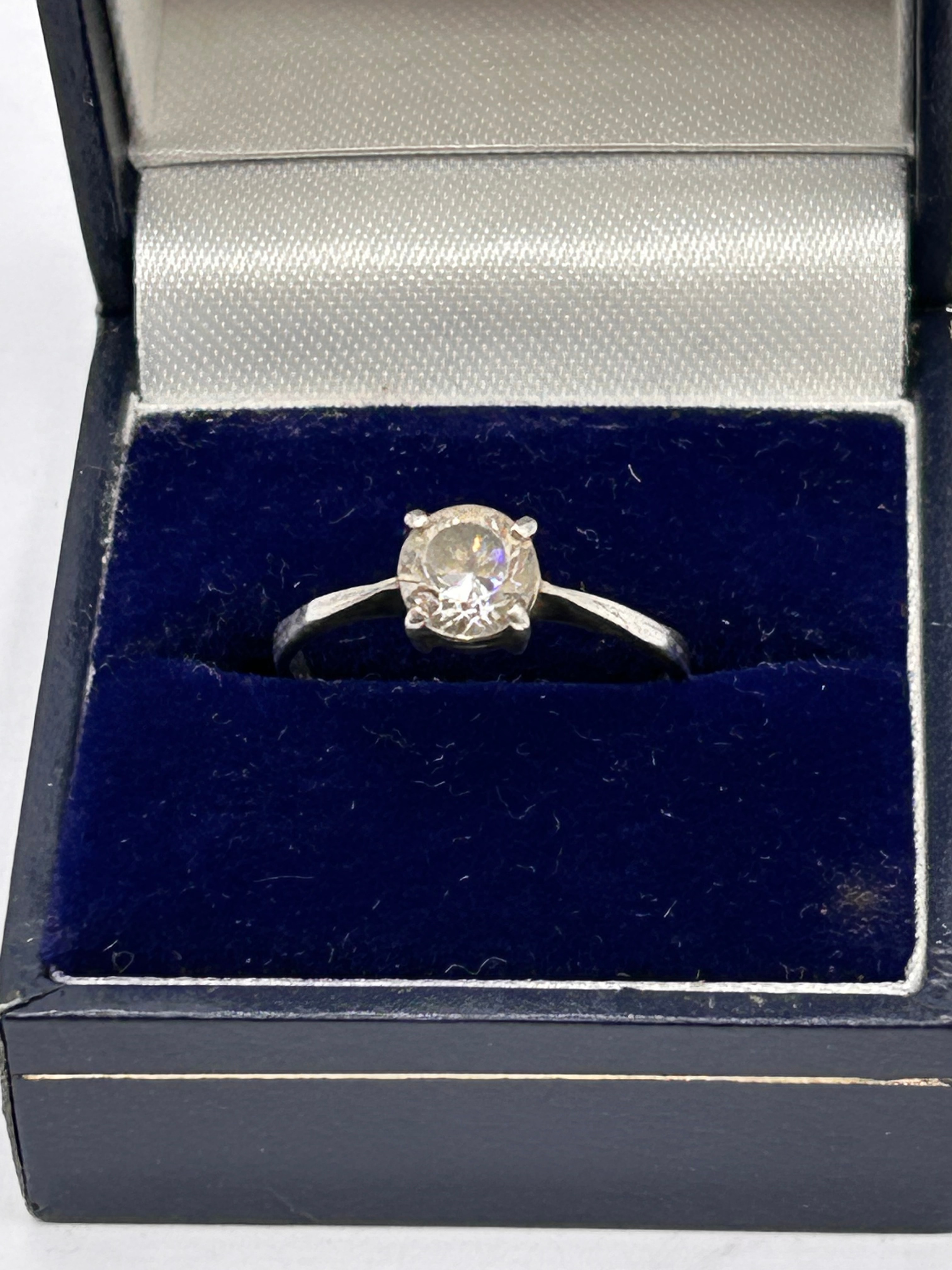 A ‘The Vanderbilt Jewel’ solitaire ring, crafted from silver, featuring a prominent, round-faceted, clear stone, likely a diamond simulant, set in a four-prong band. The ring is presented in a dark blue hinged presentation box with a navy velvet interior. The box’s lid is lined with a light grey satin-like material, bearing gold-colored cursive initials, which appear to be ‘CW’ or ‘CN’, within a decorative element. This piece is consistent with vintage 1980s designs.