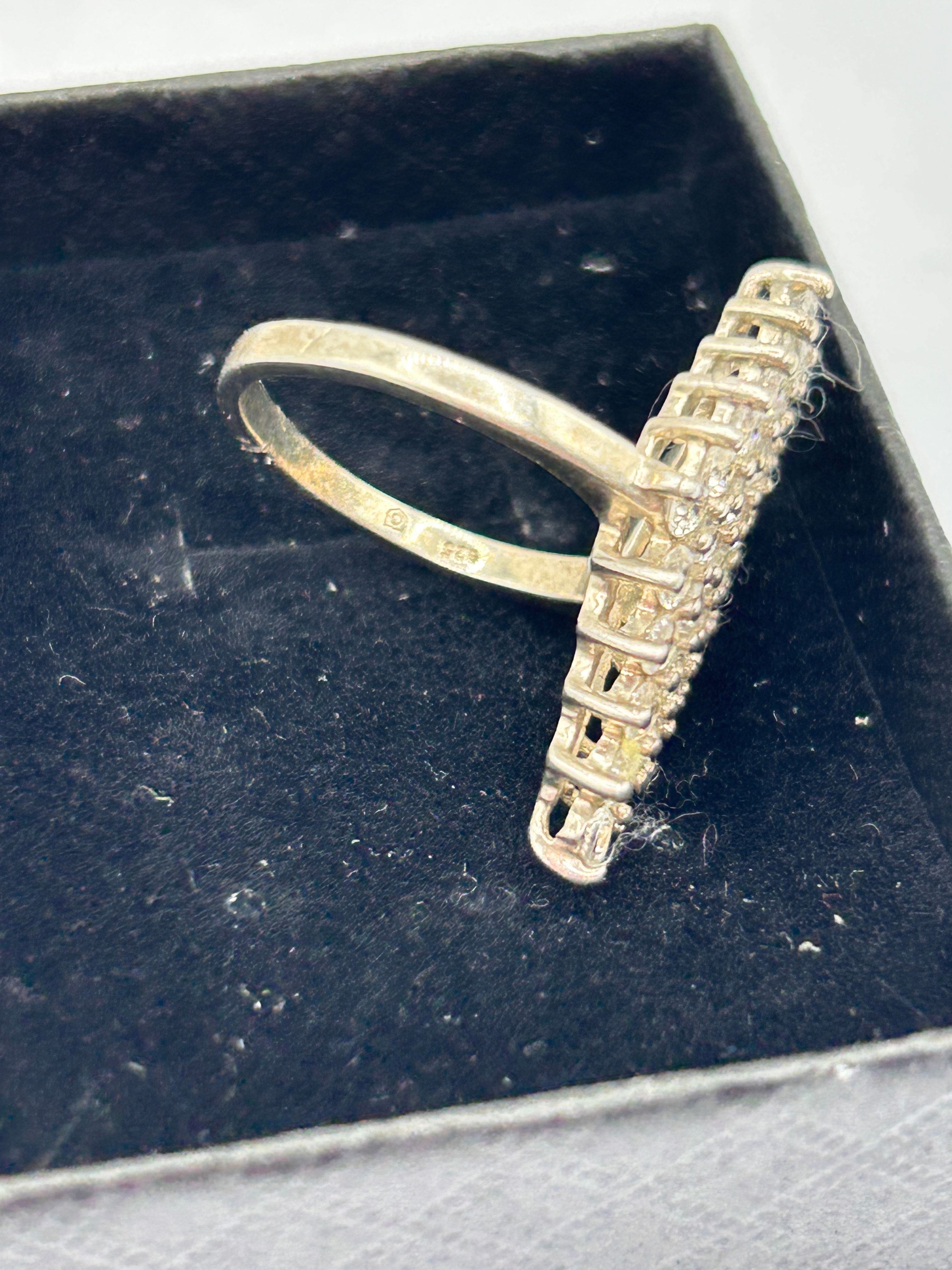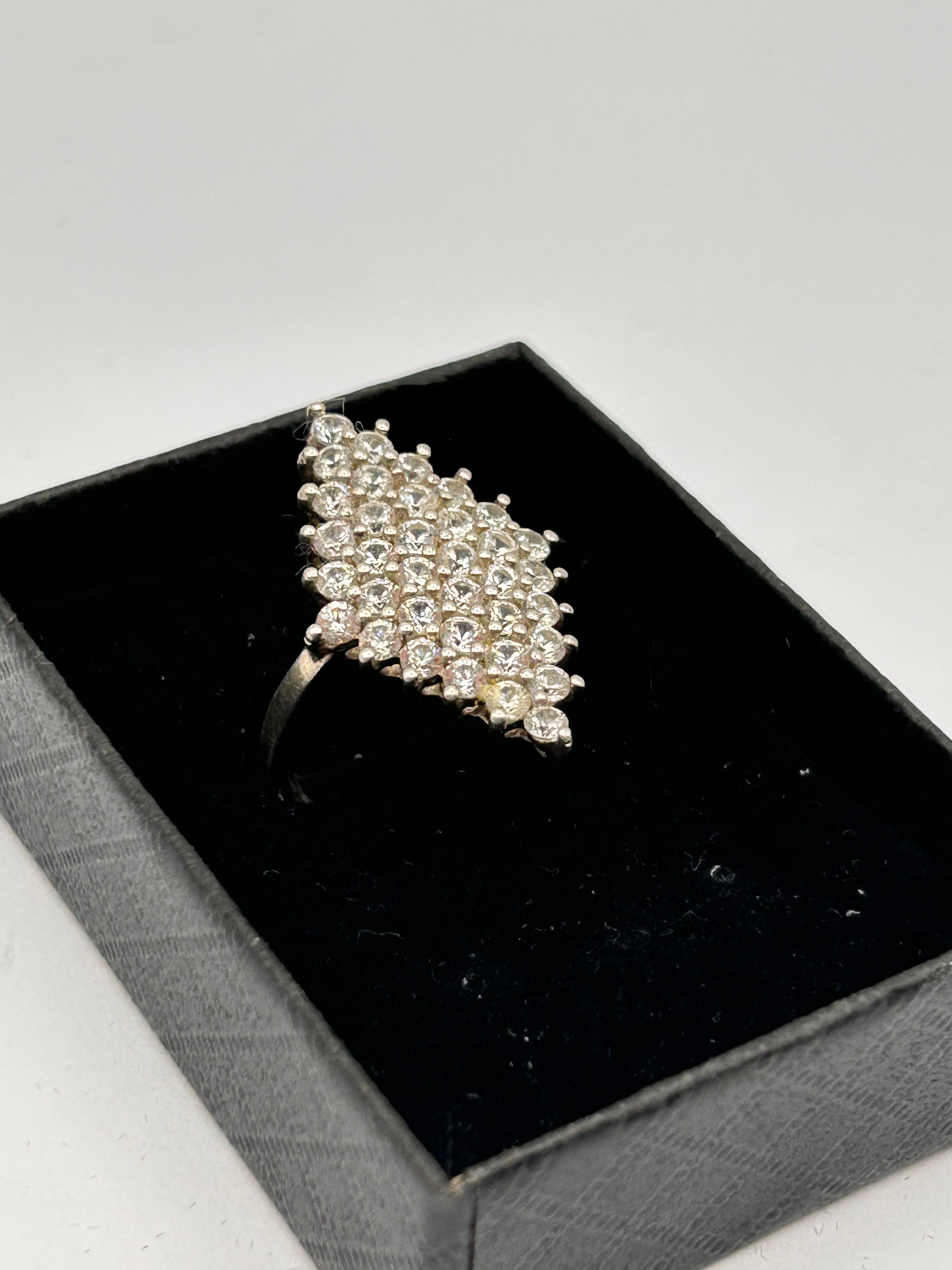 An elongated, kite-shaped cocktail or statement ring crafted from sterling silver, as indicated by the “S 925” stamp visible on the inner band. The prominent head features a dense cluster of numerous small, round, clear colorless stones, likely cubic zirconia or diamond simulants, set in a pavé style.