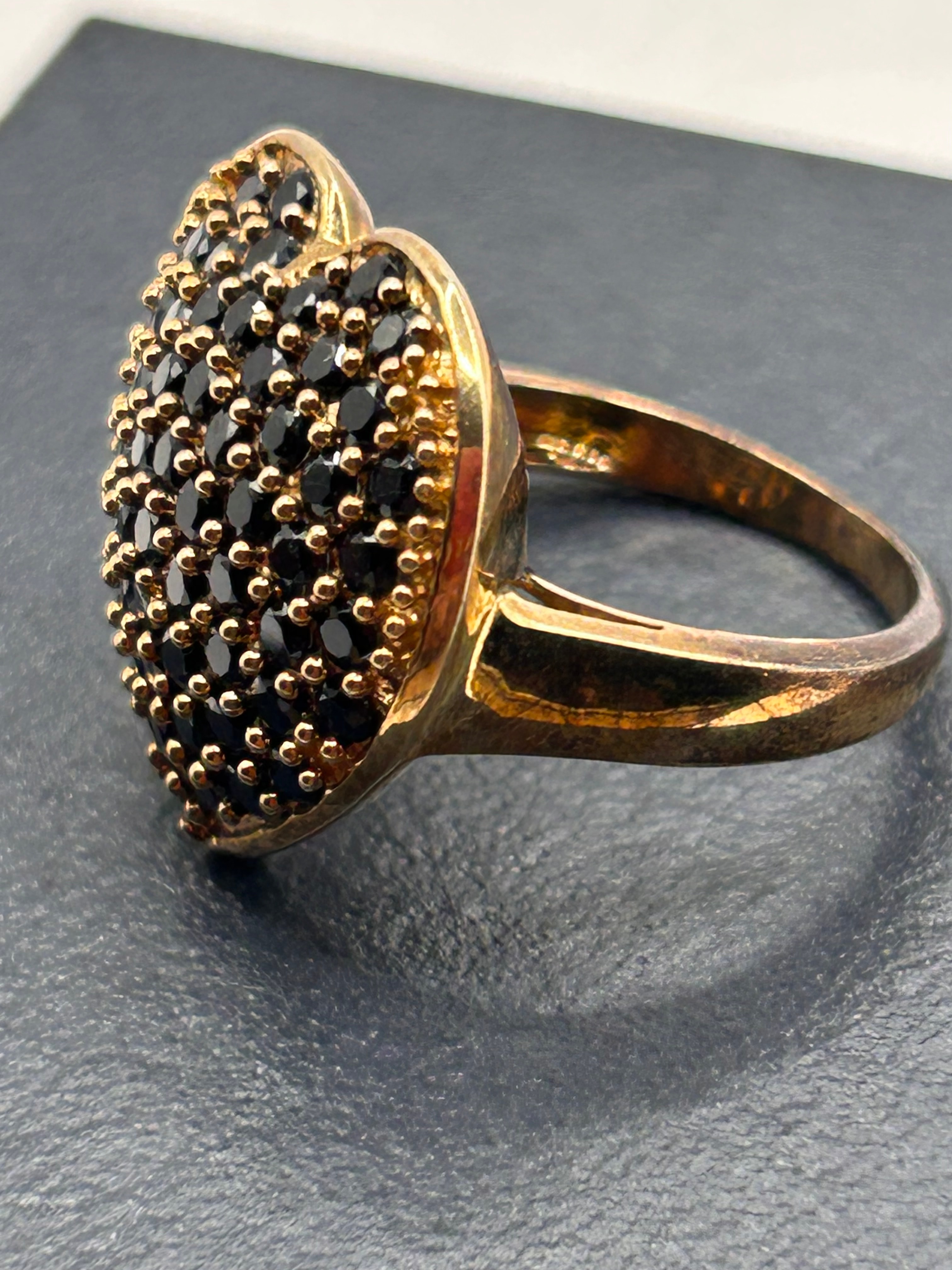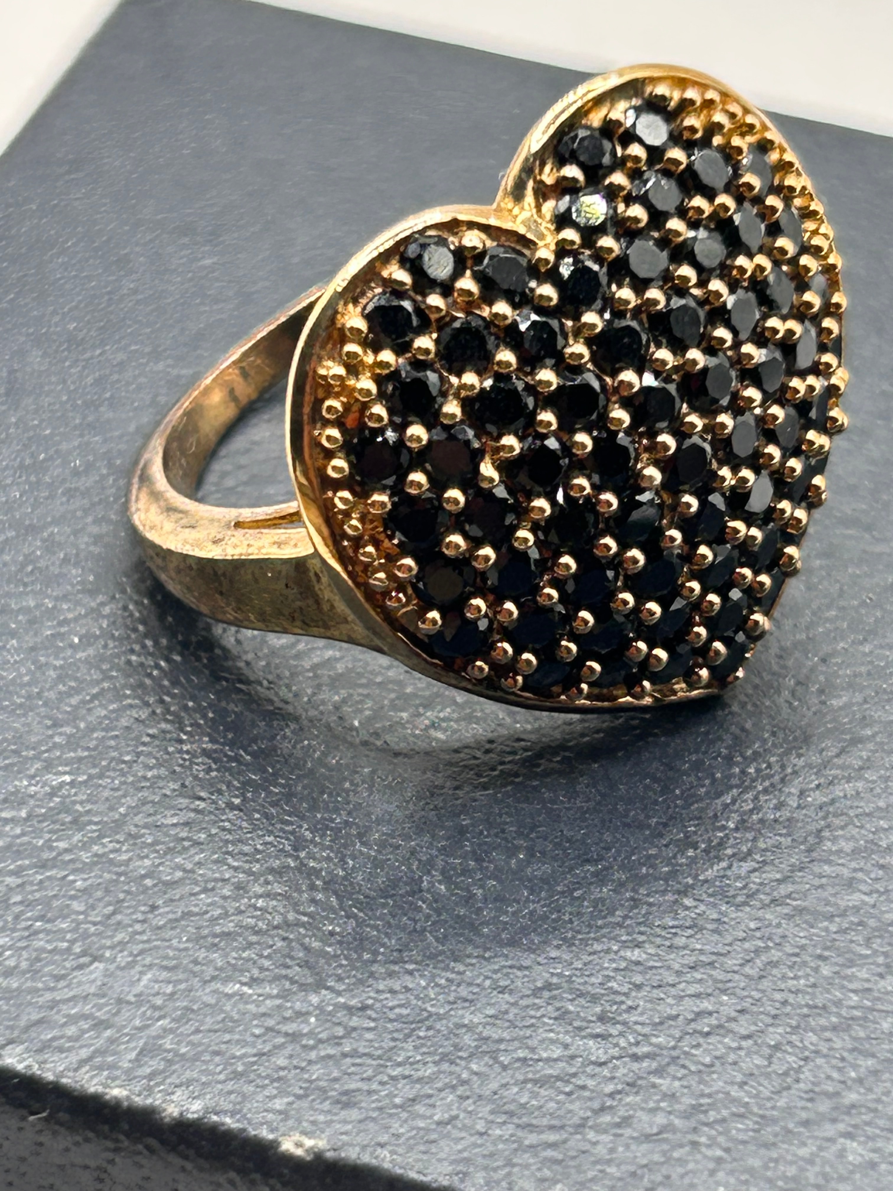 A heart-shaped finger ring, crafted from silver with a yellow-toned gold plating (vermeil). The interior of the band is marked ‘925’. The prominent heart-shaped bezel is entirely encrusted with numerous small, round-cut black stones, set closely in a cluster or pavé style. Based on market comparables and consensus keywords, these stones are consistent with black diamonds.