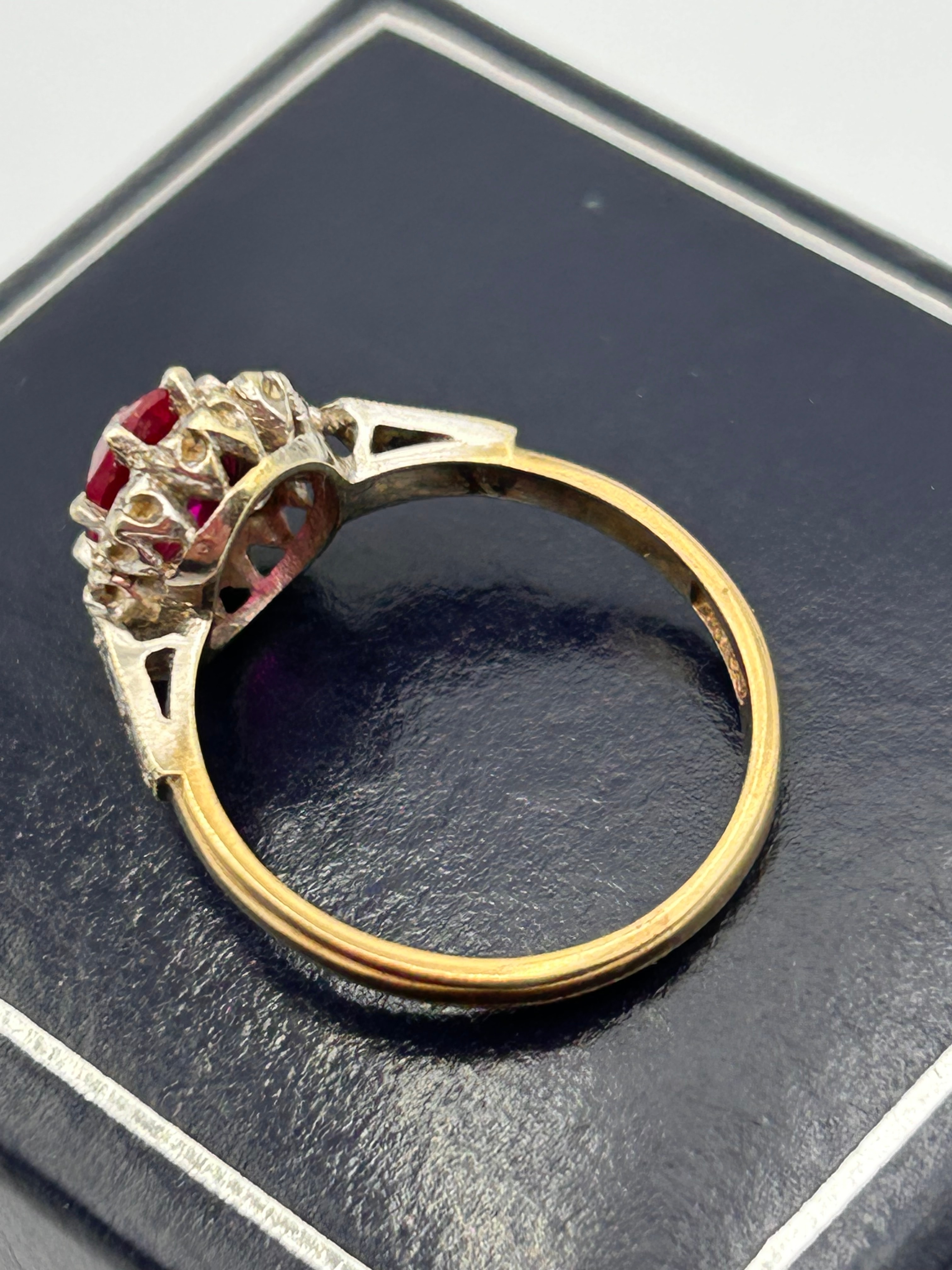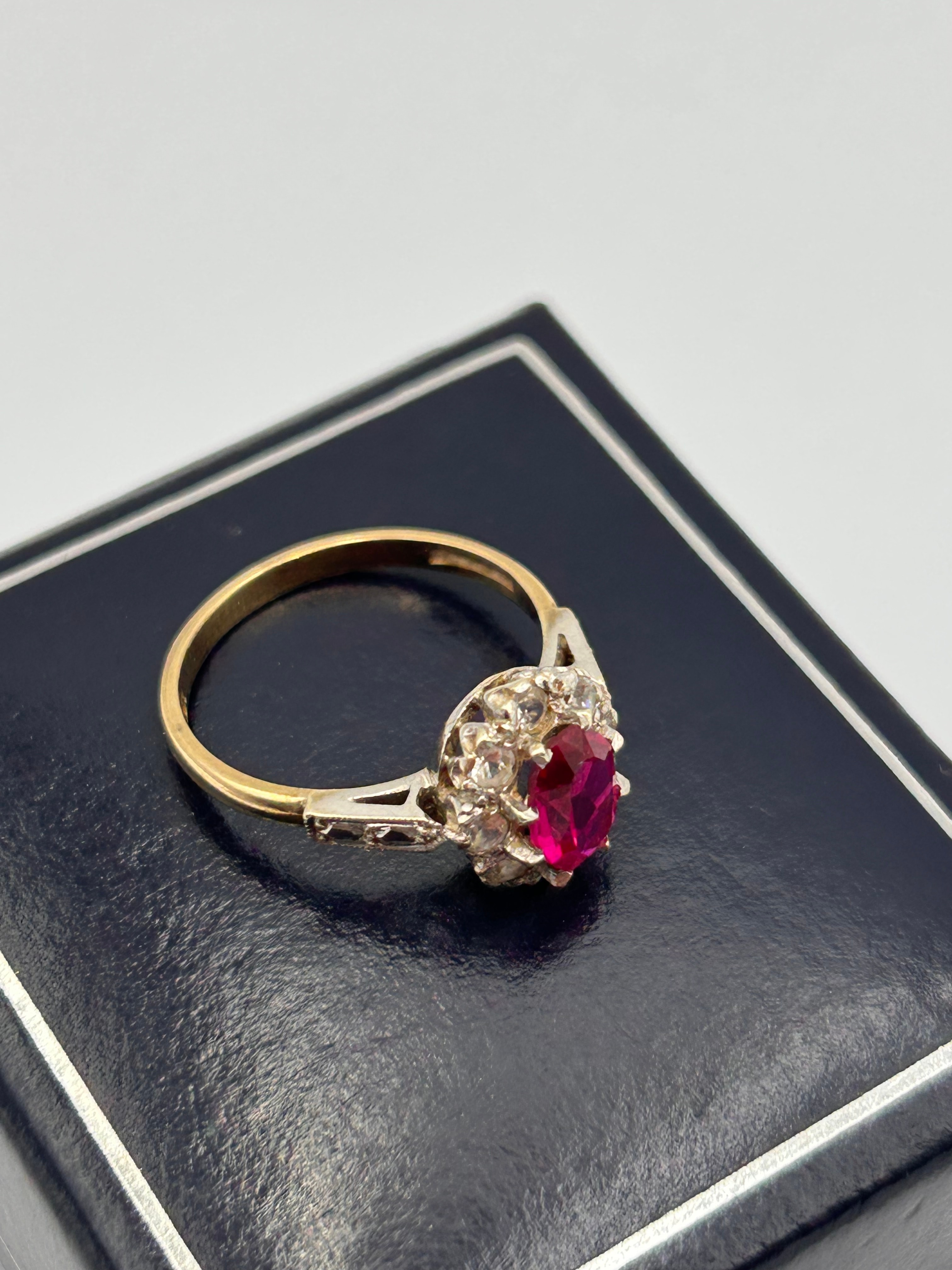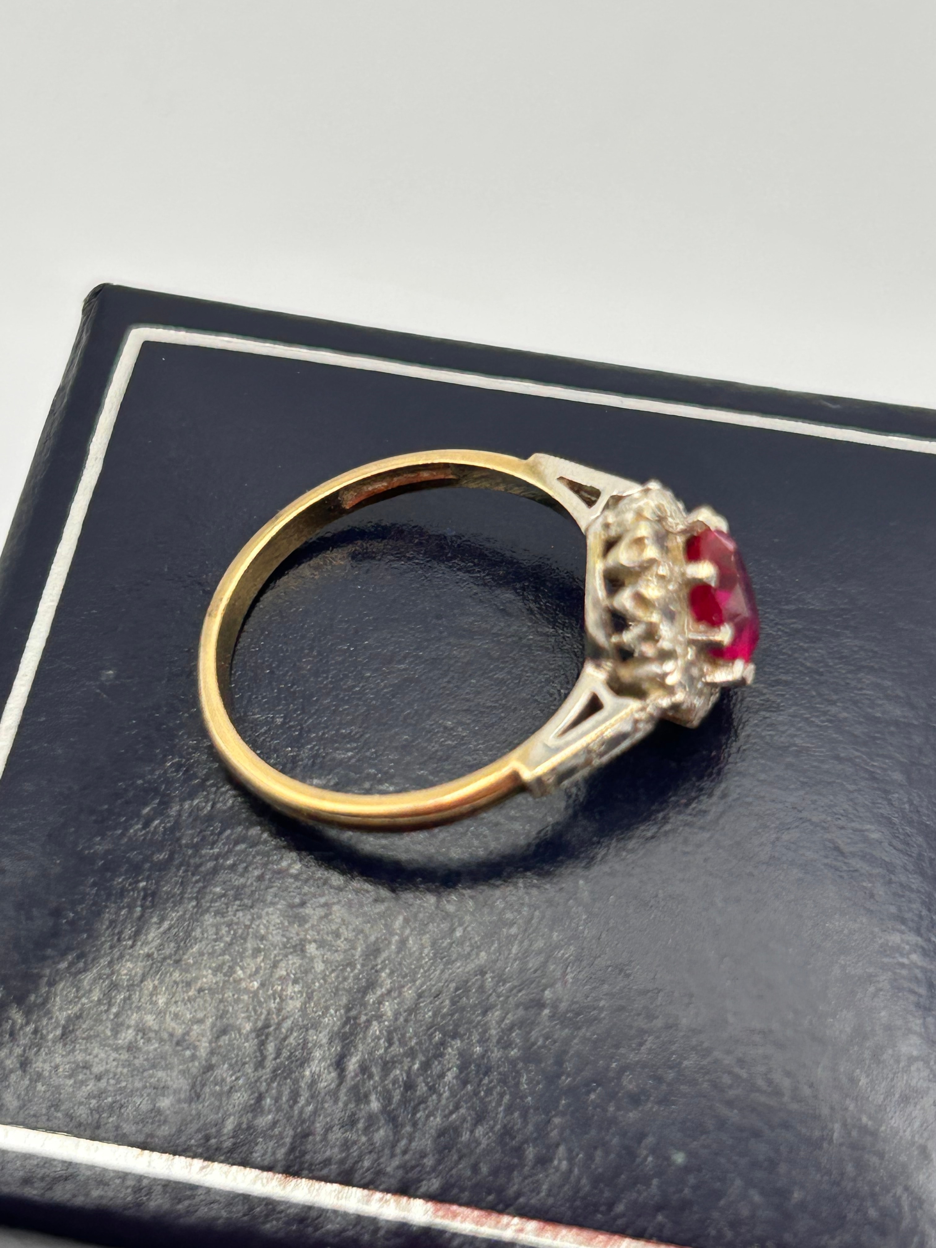 A 9ct yellow gold ruby and CZ ? cluster ring. Weighing 2.4g and of UK Size L, the ring features a central round faceted deep red stone, likely a ruby, surrounded by a halo of smaller clear faceted stones, consistent with diamonds or simulants. The main band is crafted from yellow gold, transitioning to a white metal setting for the stones, which features intricate openwork on the shoulders in a vintage-style design.