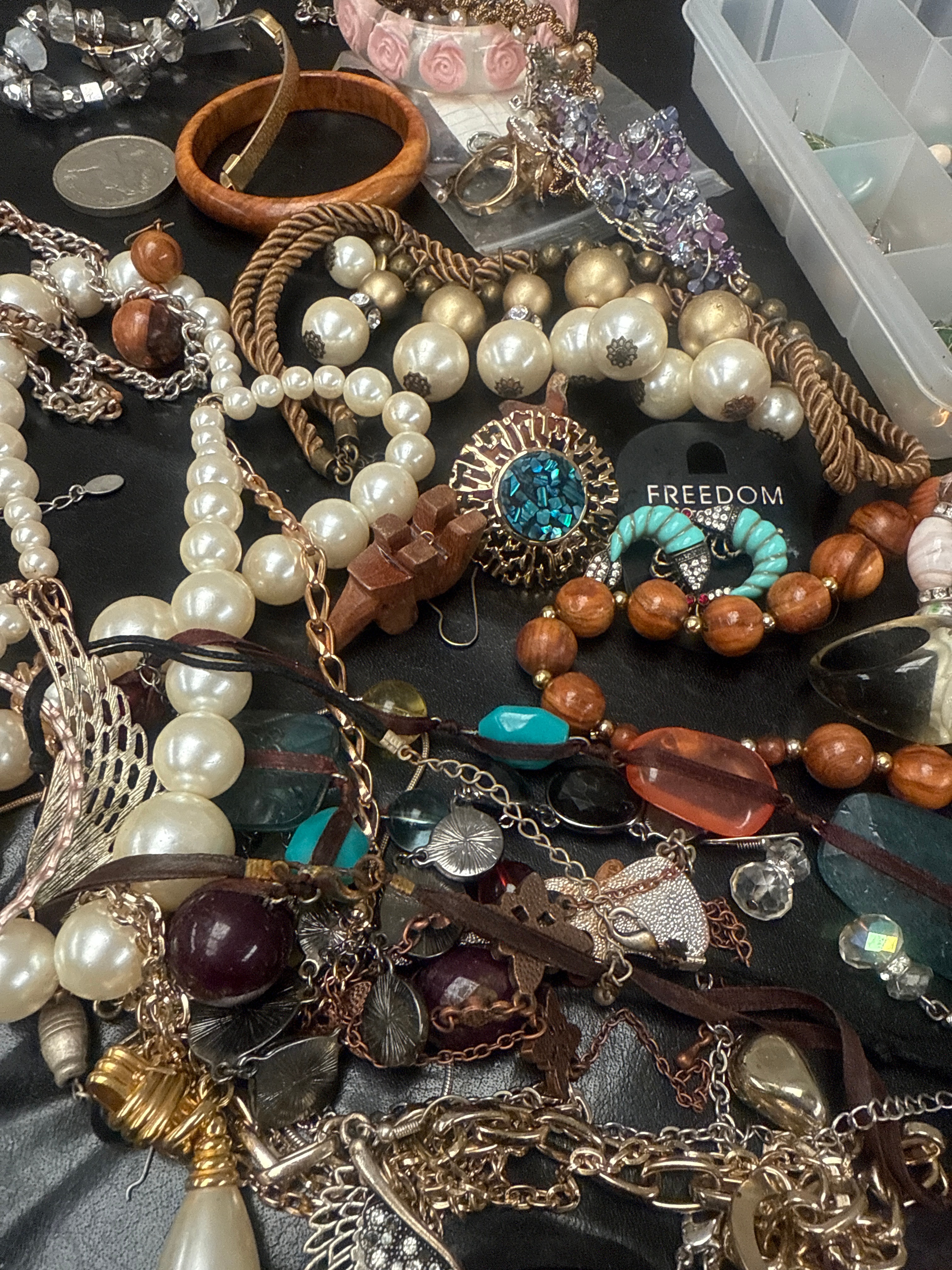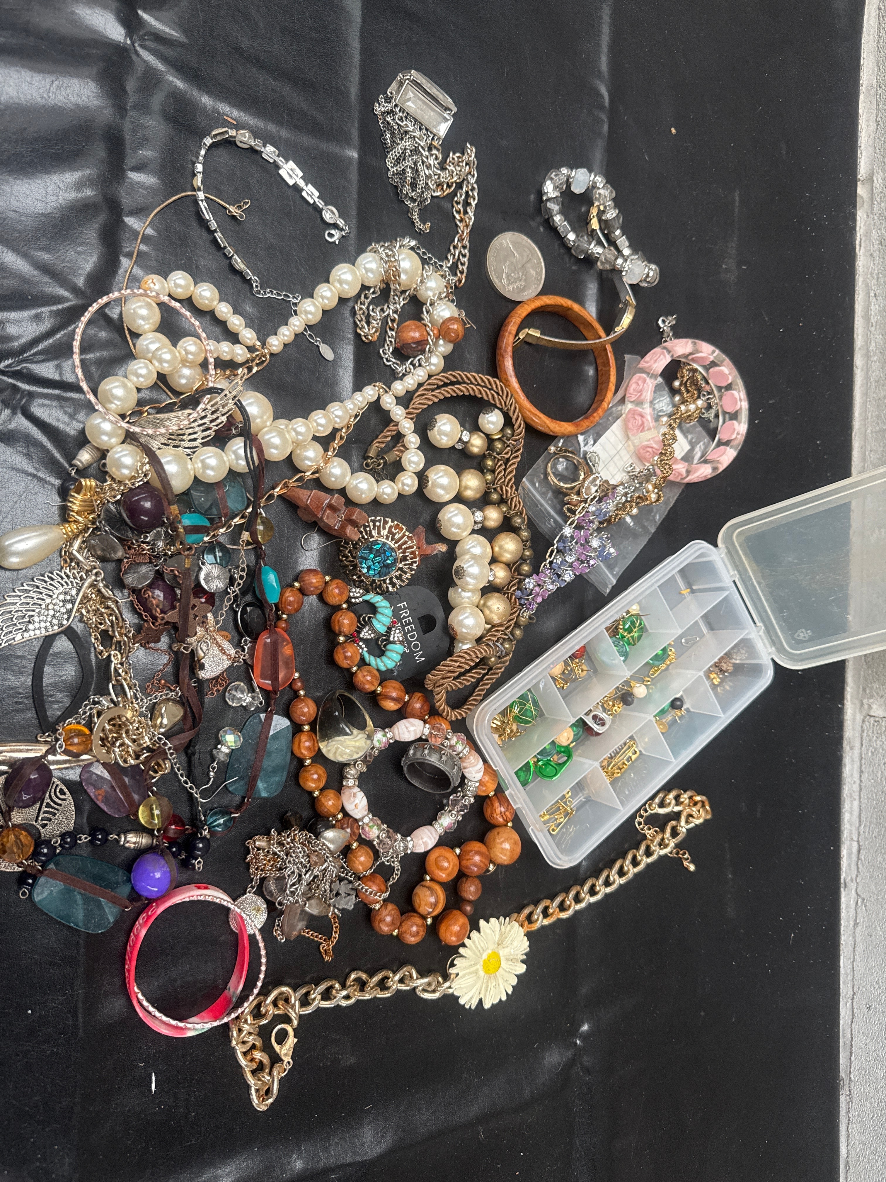 A substantial quantity of assorted costume jewelry and craft components. The collection includes numerous necklaces, bracelets, earrings, and rings, crafted from diverse materials such as base metals (gold-tone, silver-tone, bronze-tone), faux pearls, various glass beads (faceted, smooth, green), plastic and wooden beads, fabric cords, leather/suede-like elements, and synthetic stones or rhinestones. Notable items include a wooden bangle, a carved wooden pendant, and a clear plastic organizer box containing loose components, green glass beads, and gold-tone safety pins. A black jewelry tag bearing the text “FREEDOM” is visible on one piece. A single U.S. quarter coin is also present within the assortment.