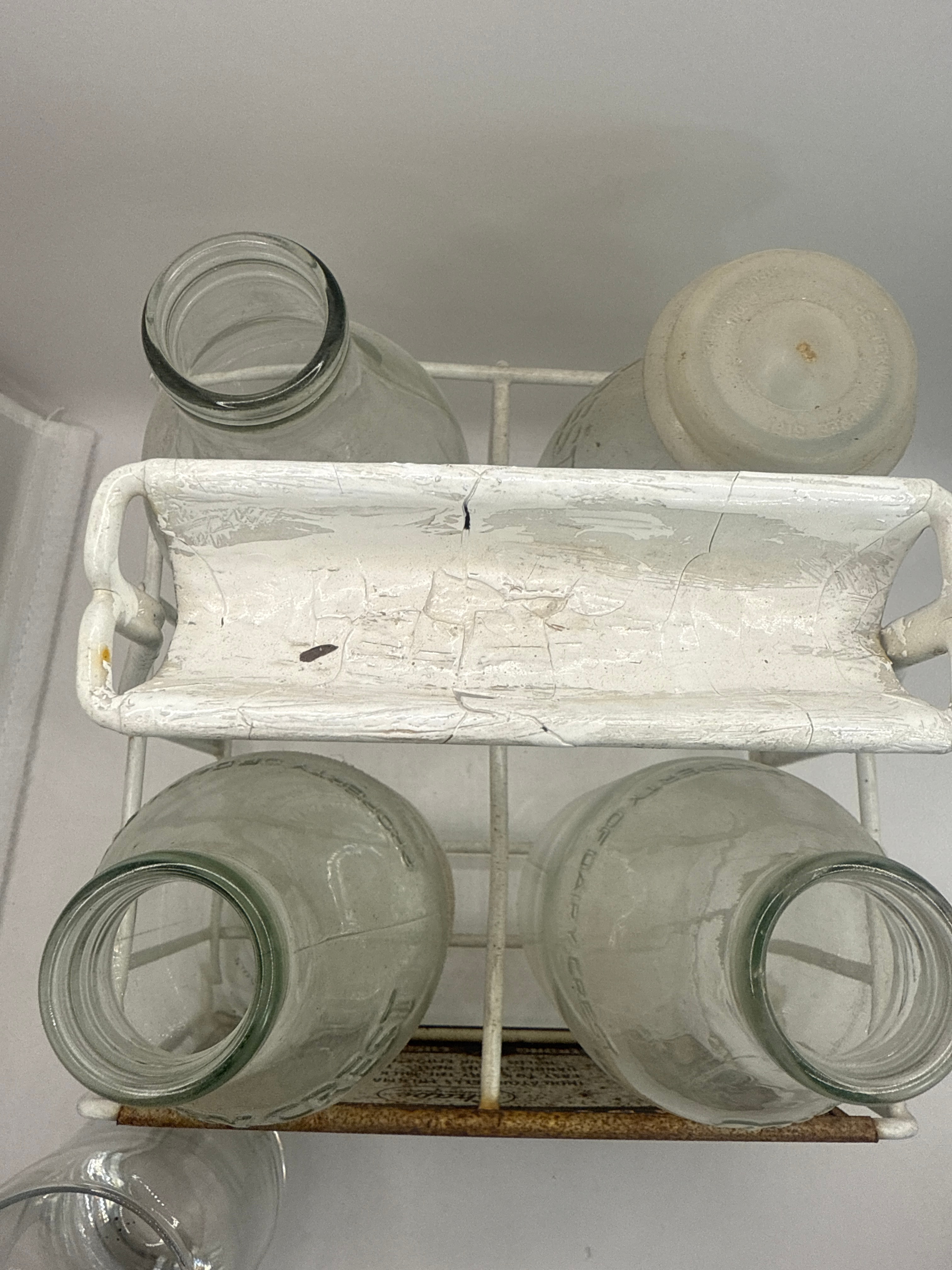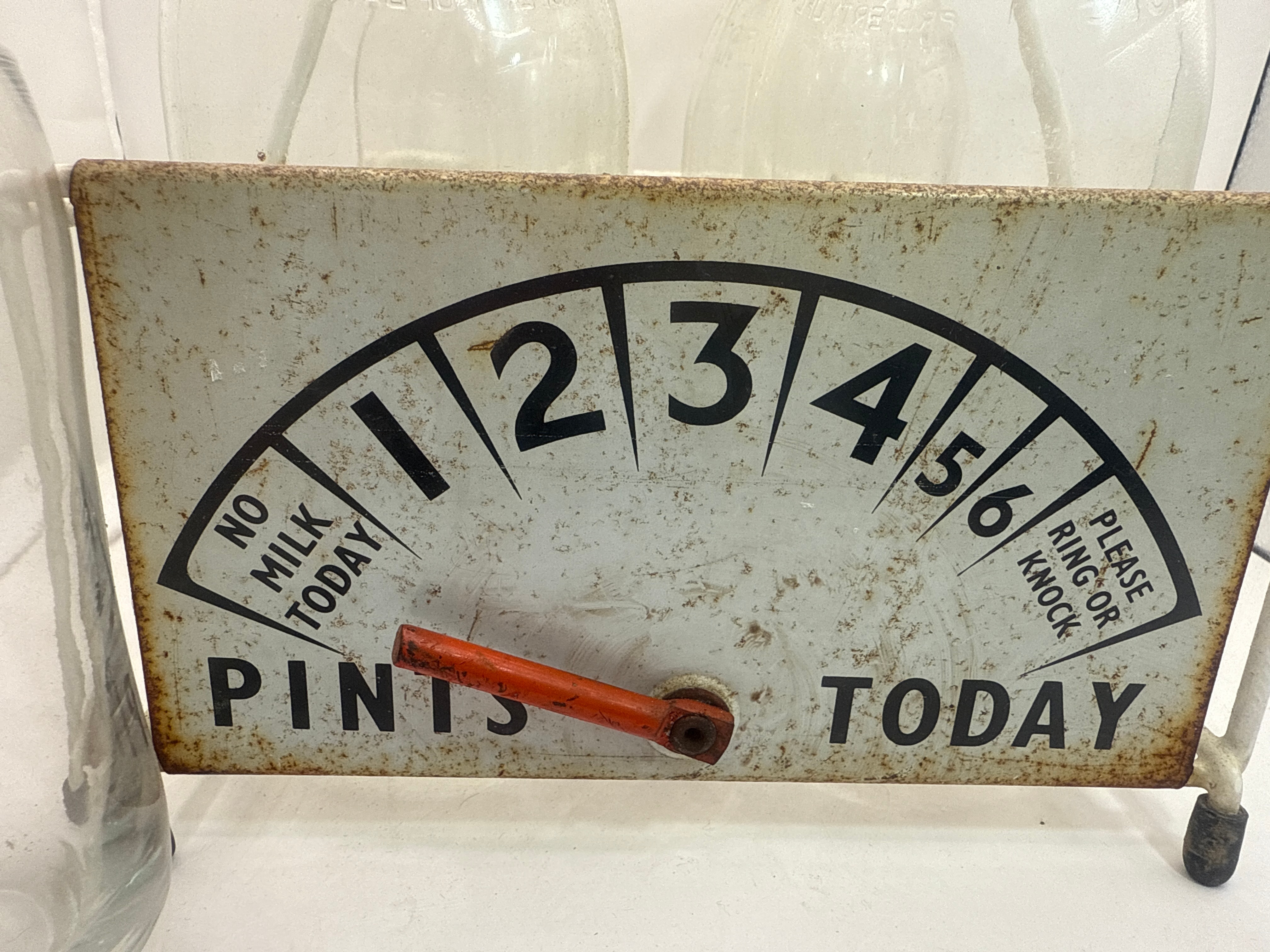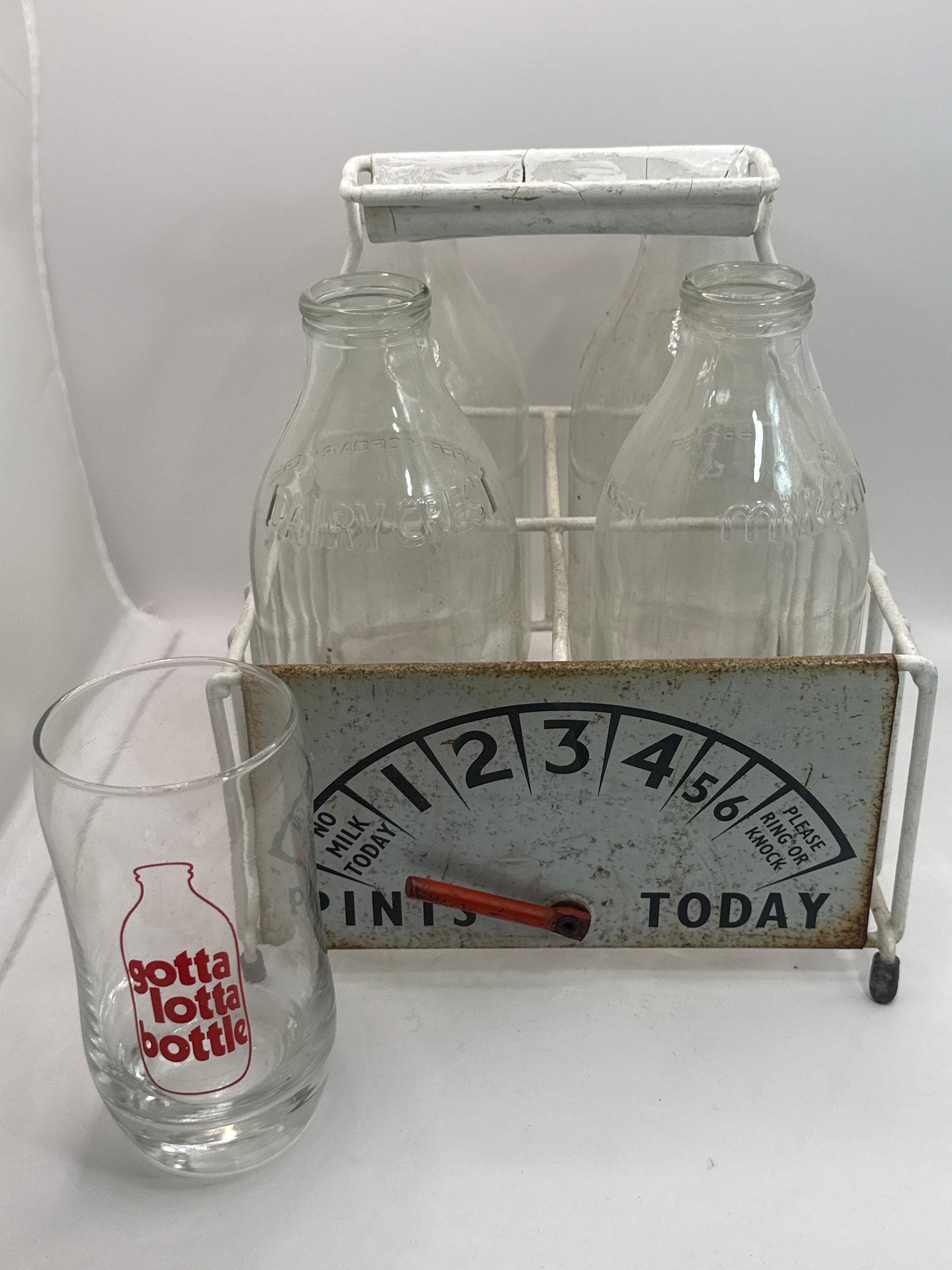 A vintage white painted metal milk bottle carrier, possibly dating to the 1980s. The carrier features an integrated dial sign marked “1 2 3 4 5 6 PINTS TODAY” with an orange pointer, and additional text including “NO MILK TODAY” and “PLEASE RING OR KNOCK”. It holds a group of clear glass milk bottles, some with vertical ribbing, each marked “HALF PINT” and “PROPERTY OF DAIRY”. Accompanying the carrier is a separate clear glass drinking tumbler, decorated with a red graphic of a milk bottle and the text “gotta lotta bottle”.