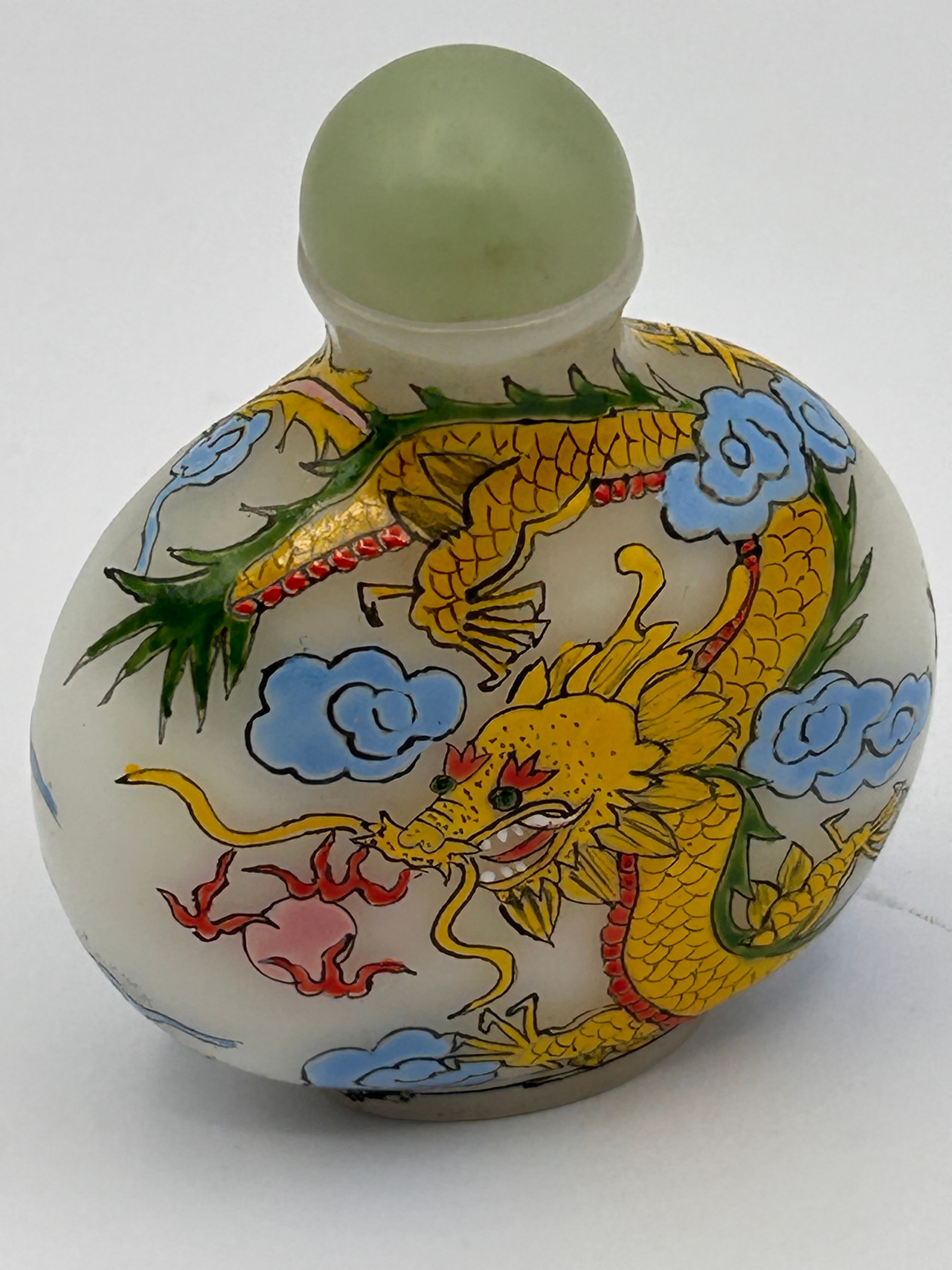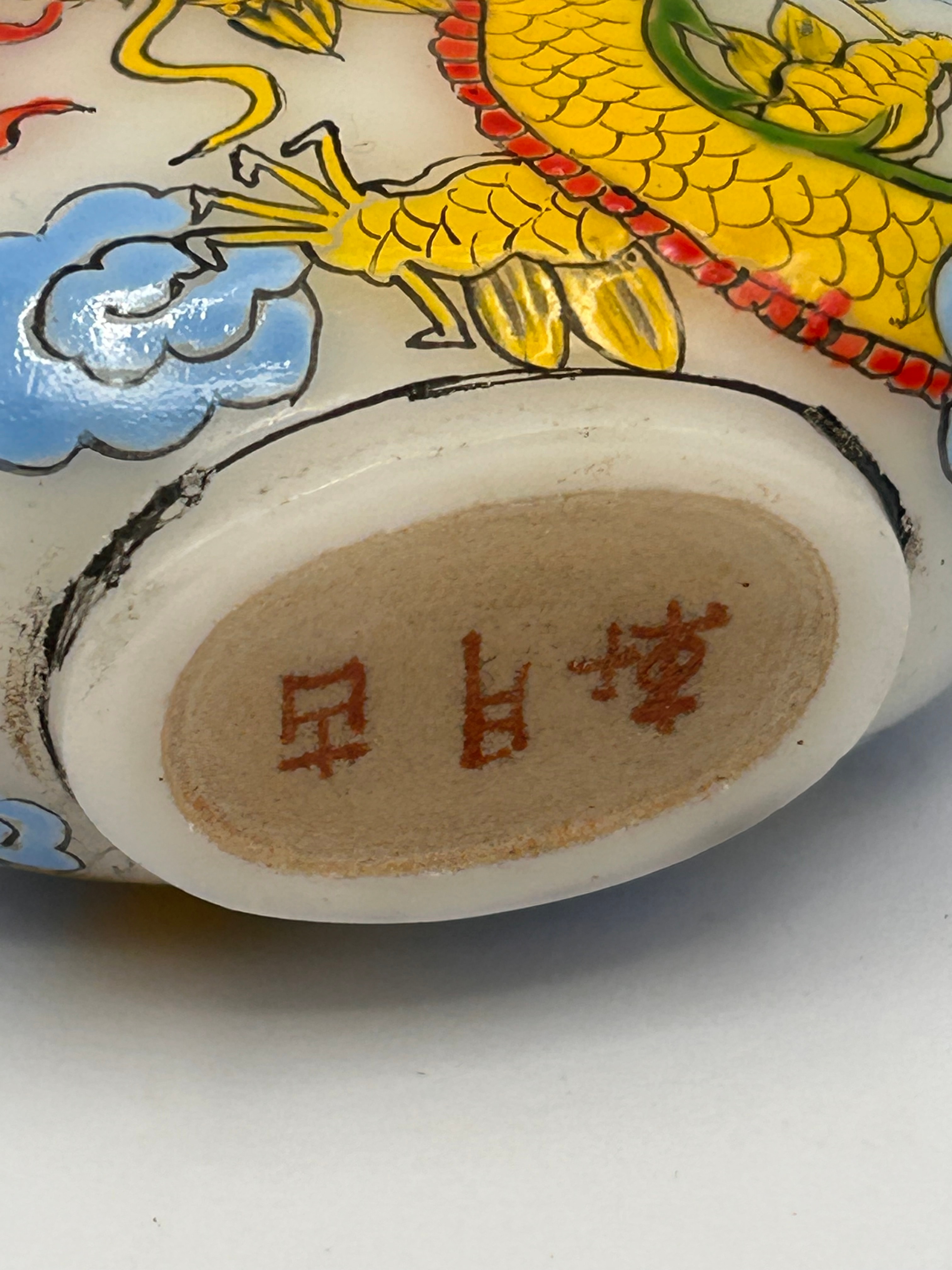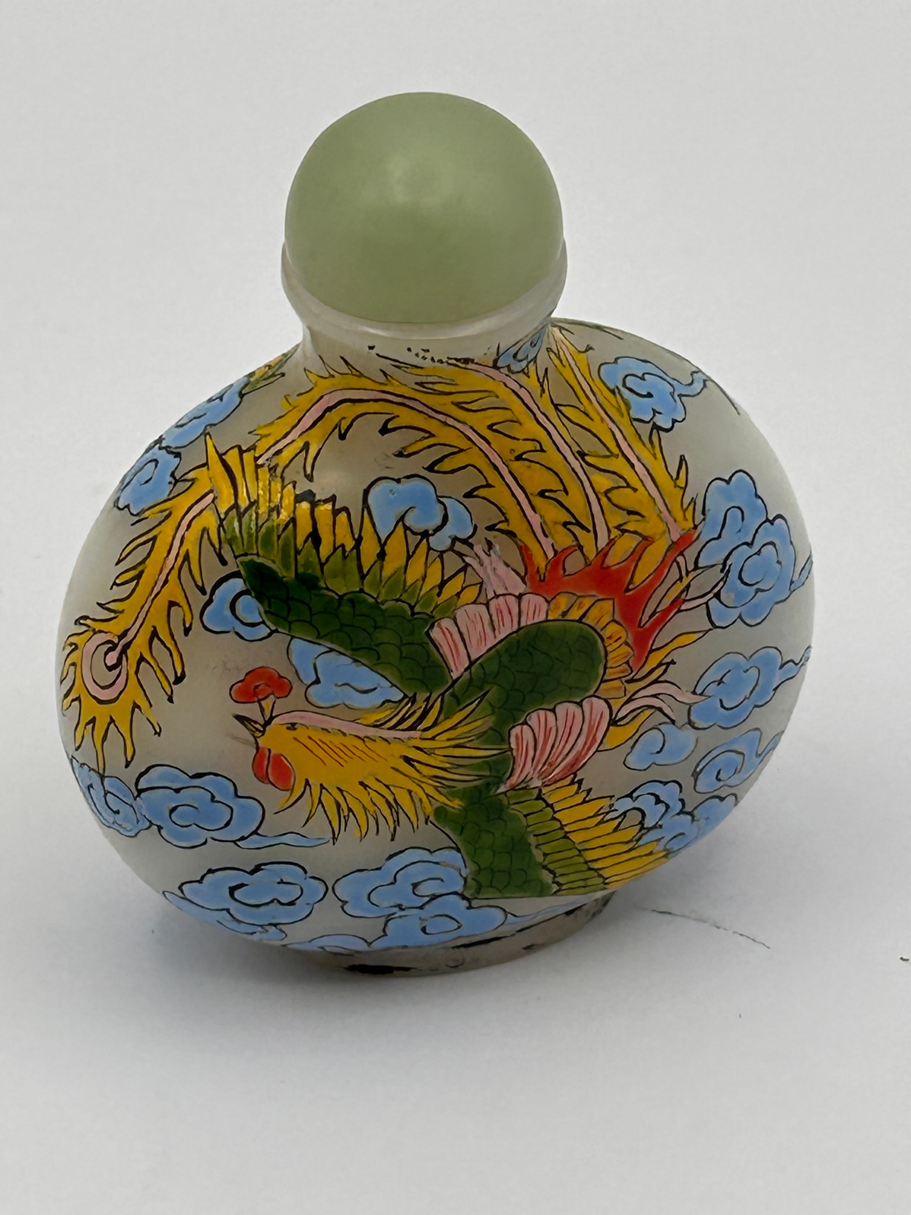 A Chinese-style snuff bottle crafted from milky-white translucent glass, featuring a flattened ovoid body. It is finely decorated with hand-painted polychrome enamel, depicting a golden dragon against blue clouds on one side and a multi-colored phoenix (fenghuang) among similar clouds on the reverse. The bottle is topped with a fitted light green stone stopper. The base features a red four-character mark, ‘蔡月記’ (Cài Yuè Jì), which translates to ‘Cai Yue’s Mark/Record/Shop,’ indicating a maker’s or workshop name.
