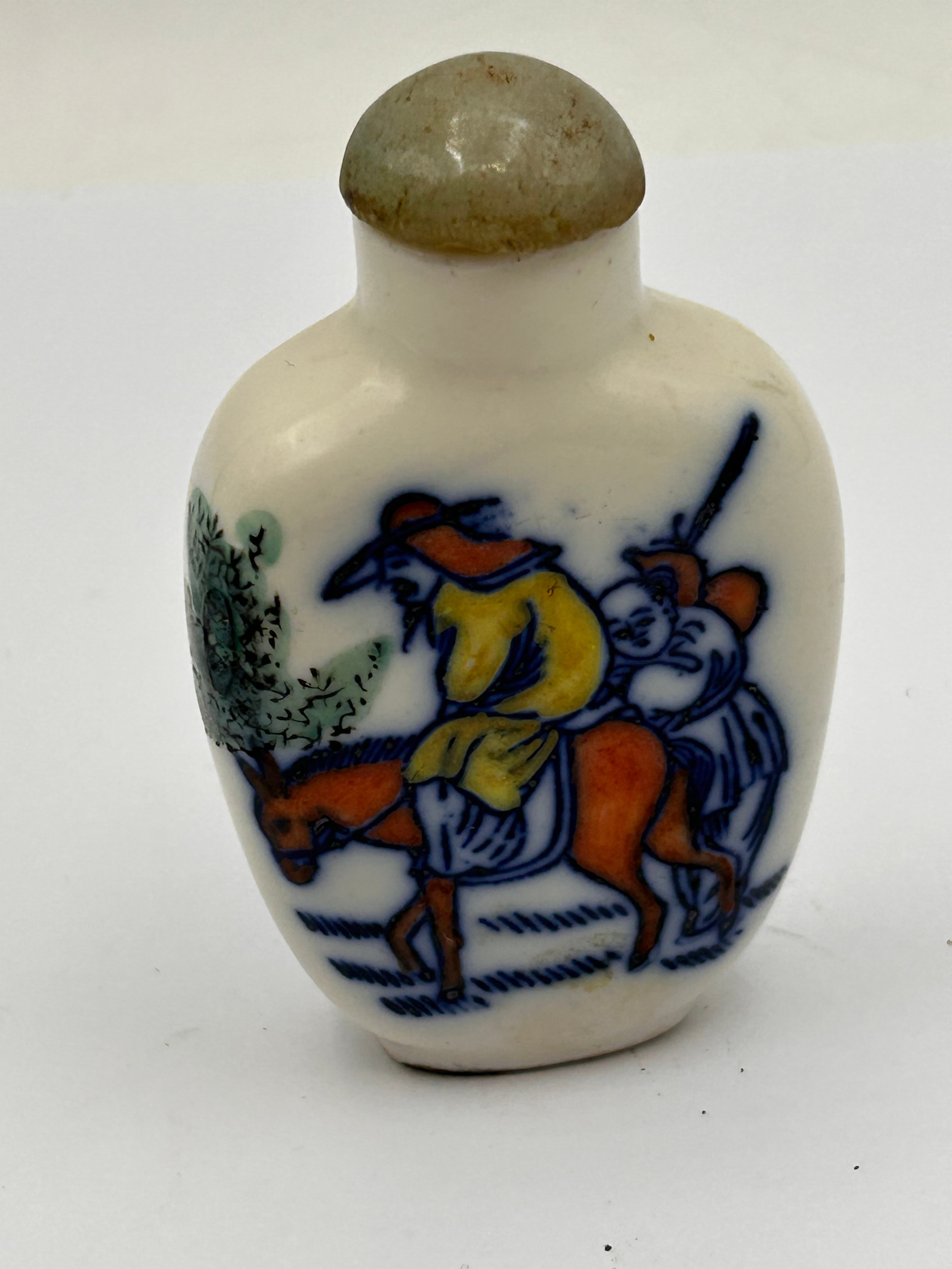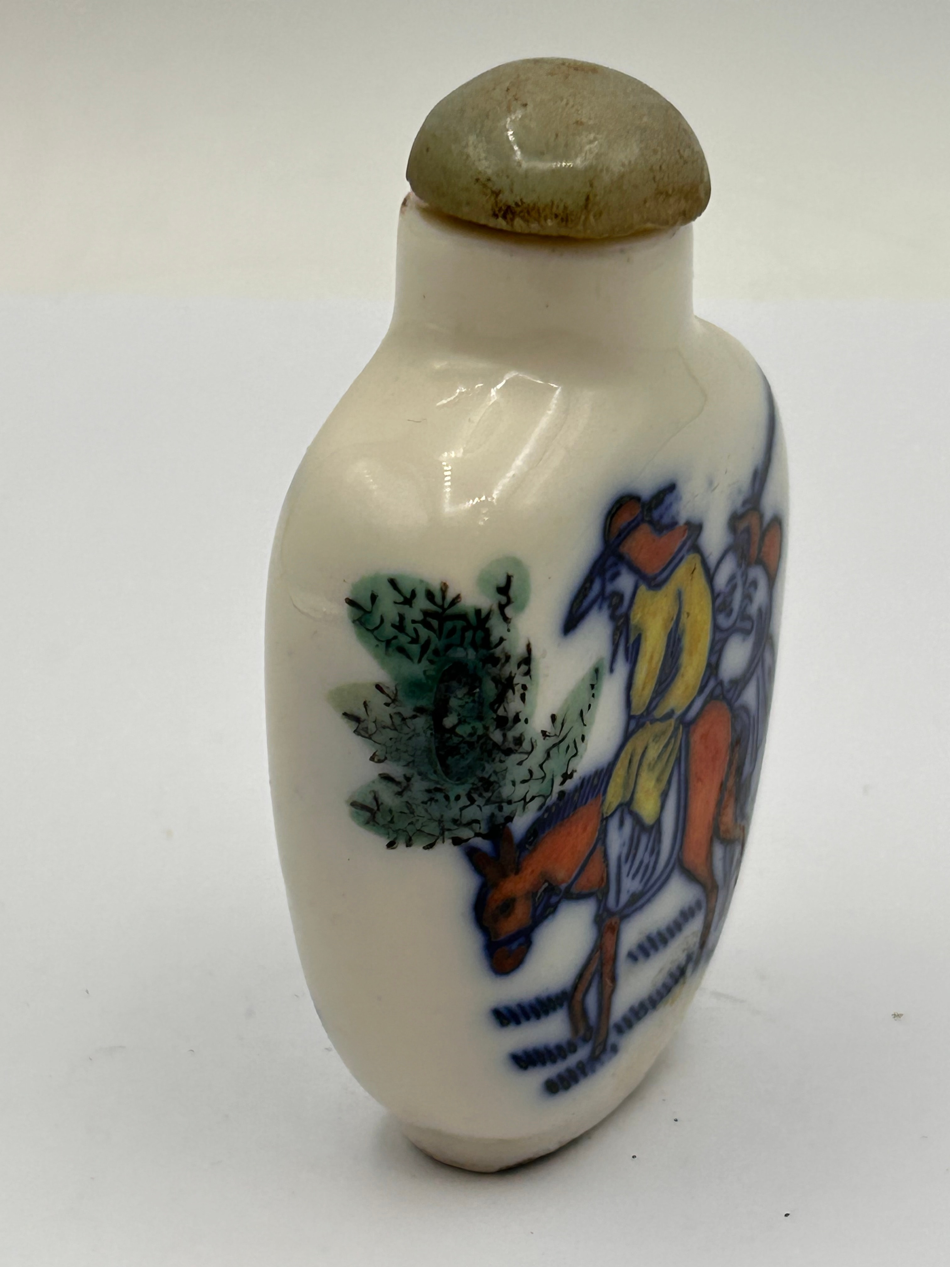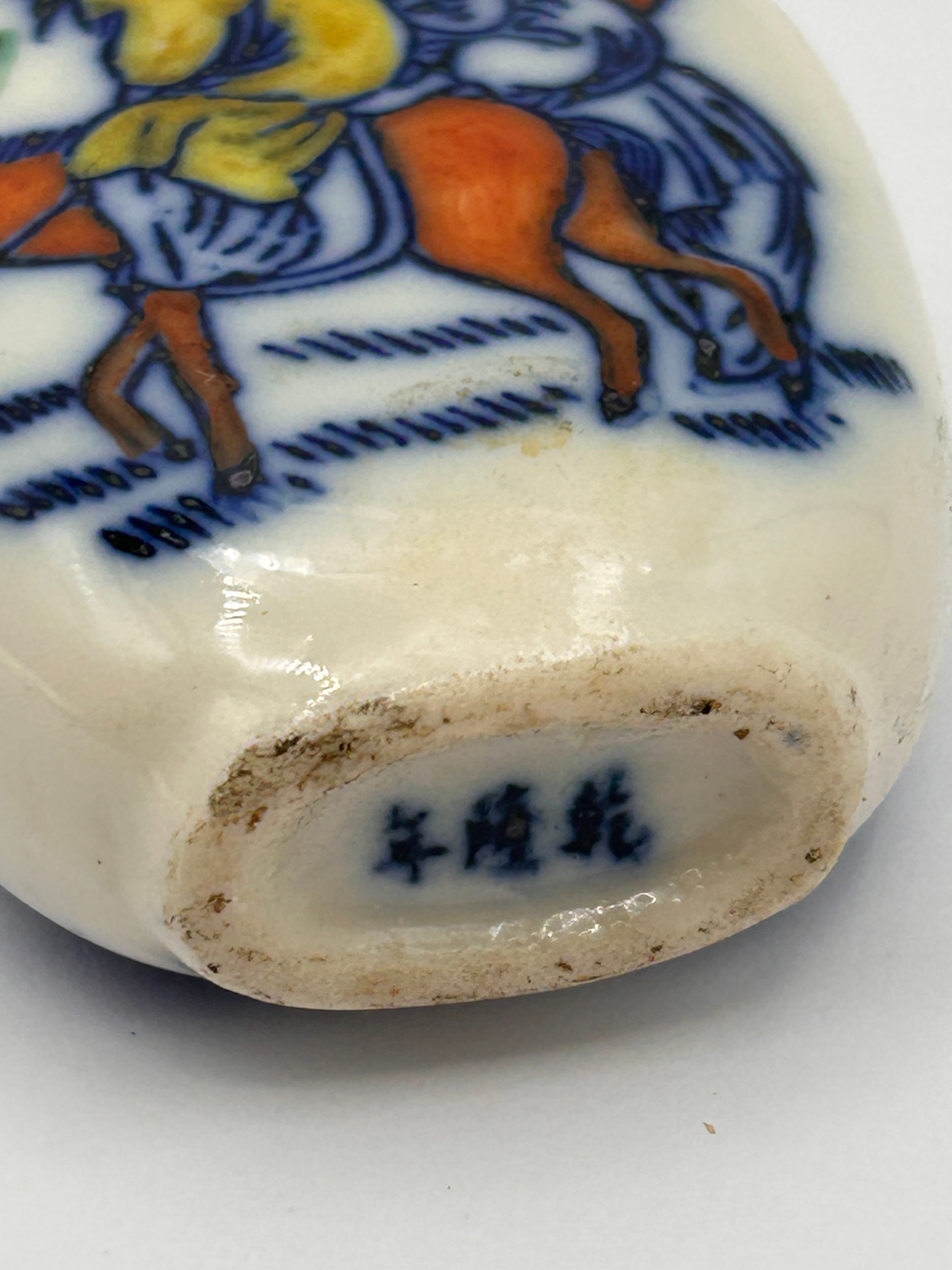 A Chinese porcelain snuff bottle of flattened ovoid form, featuring a white glazed body adorned with a polychrome overglaze hand-painted scene depicting two figures, one mounted on a donkey, within a landscape with green foliage. The bottle is fitted with a greenish-brown hardstone stopper. The base carries a four-character blue underglaze mark, 乾隆年製 (Qianlong Nian Zhi), translating to “Made in the Qianlong period.”