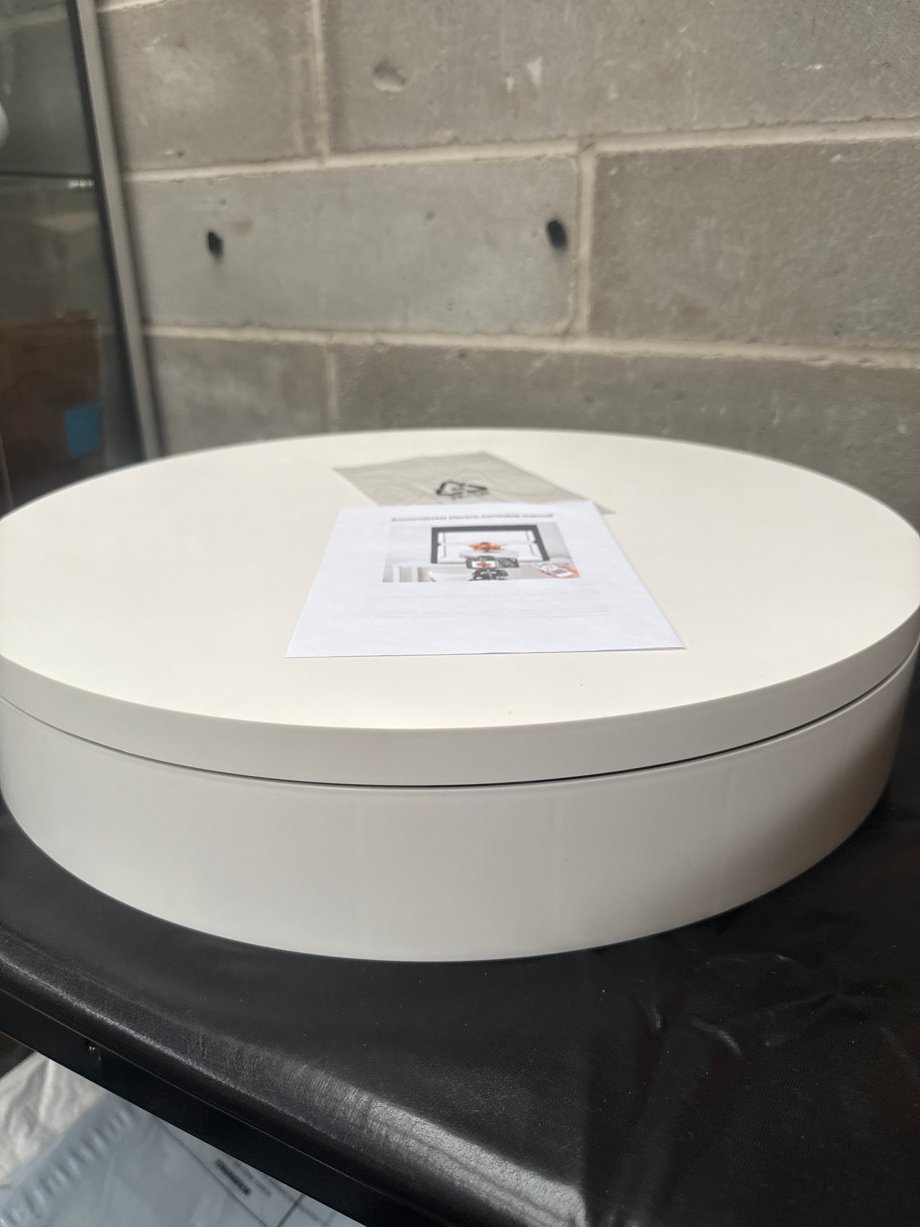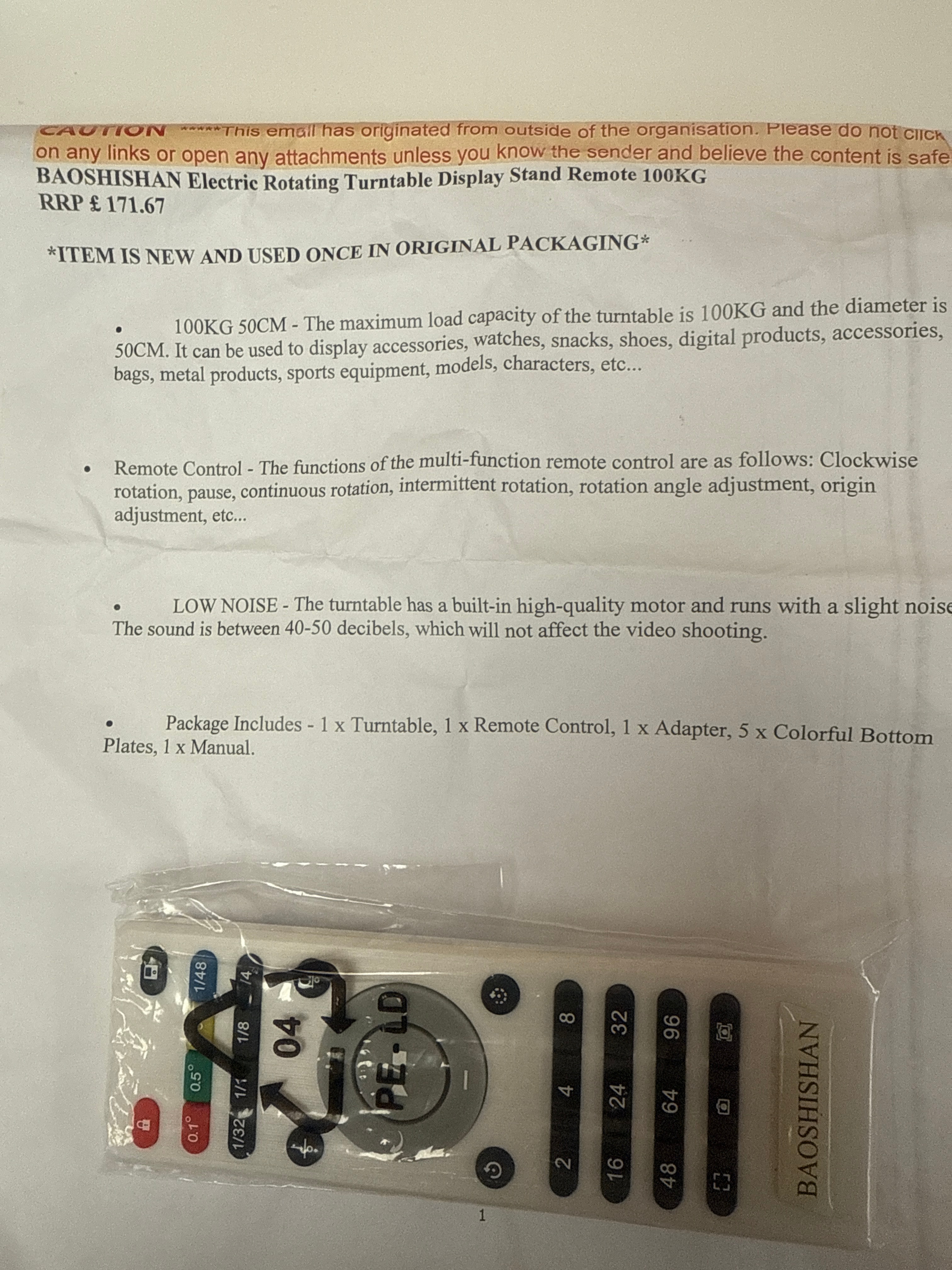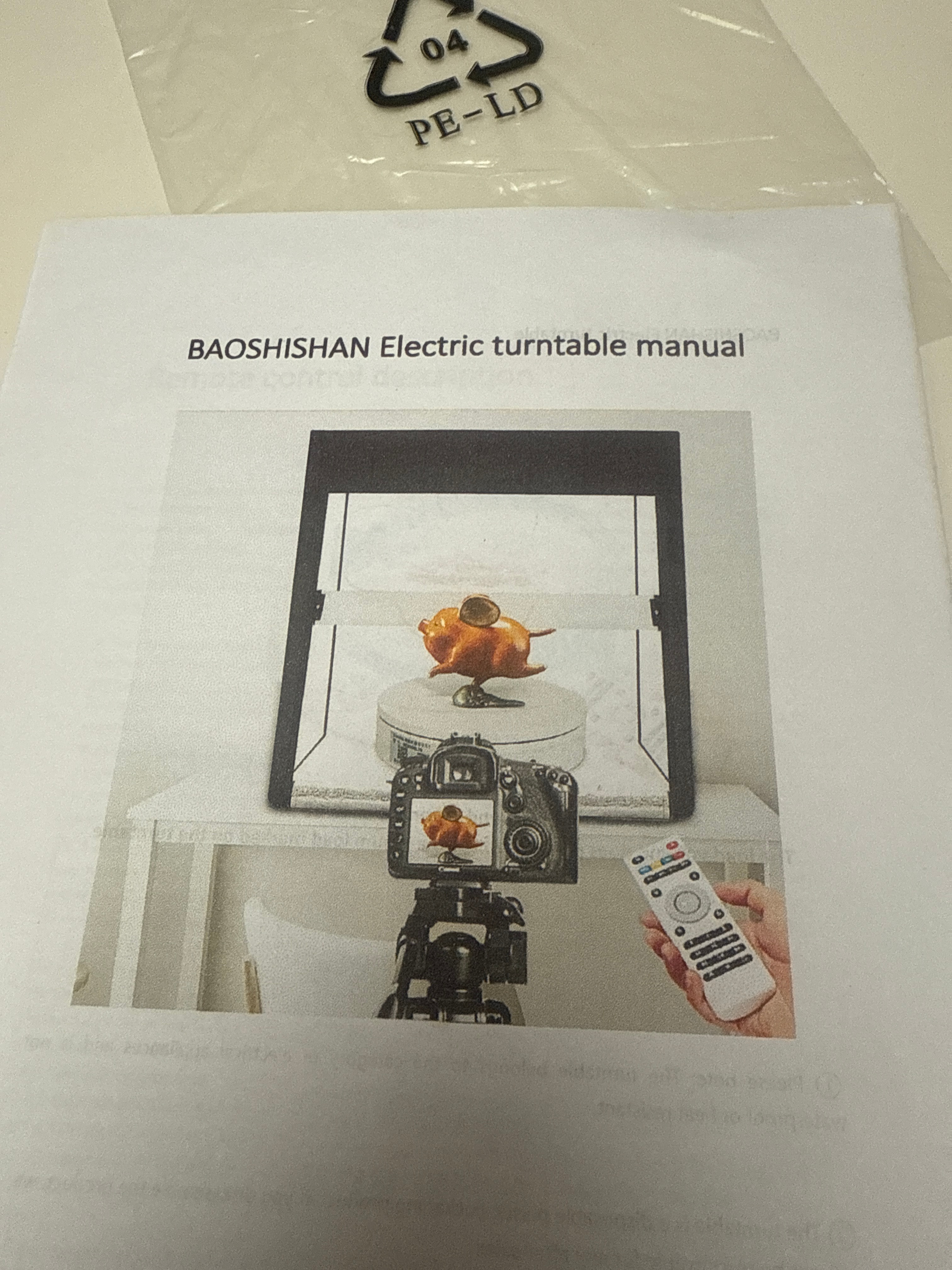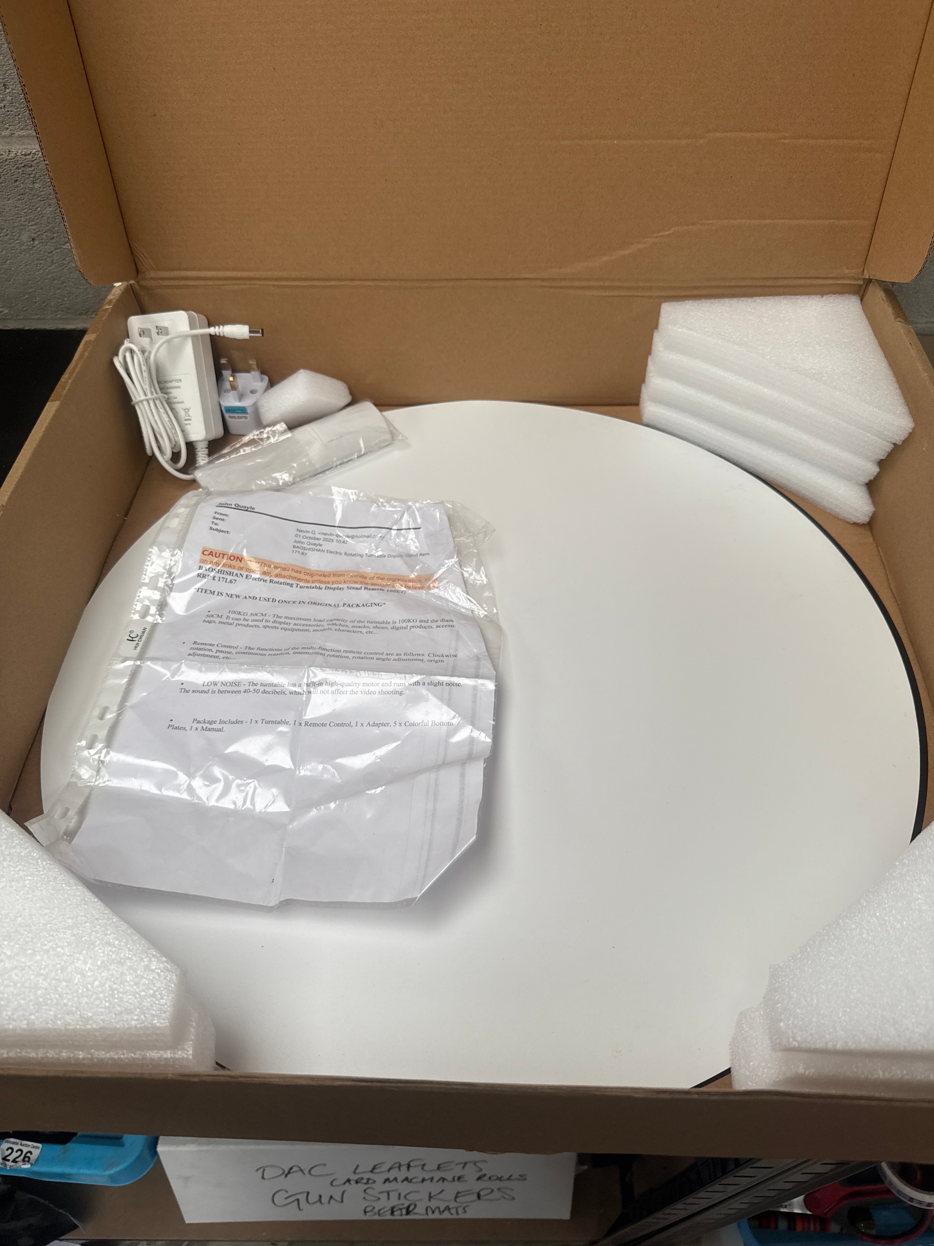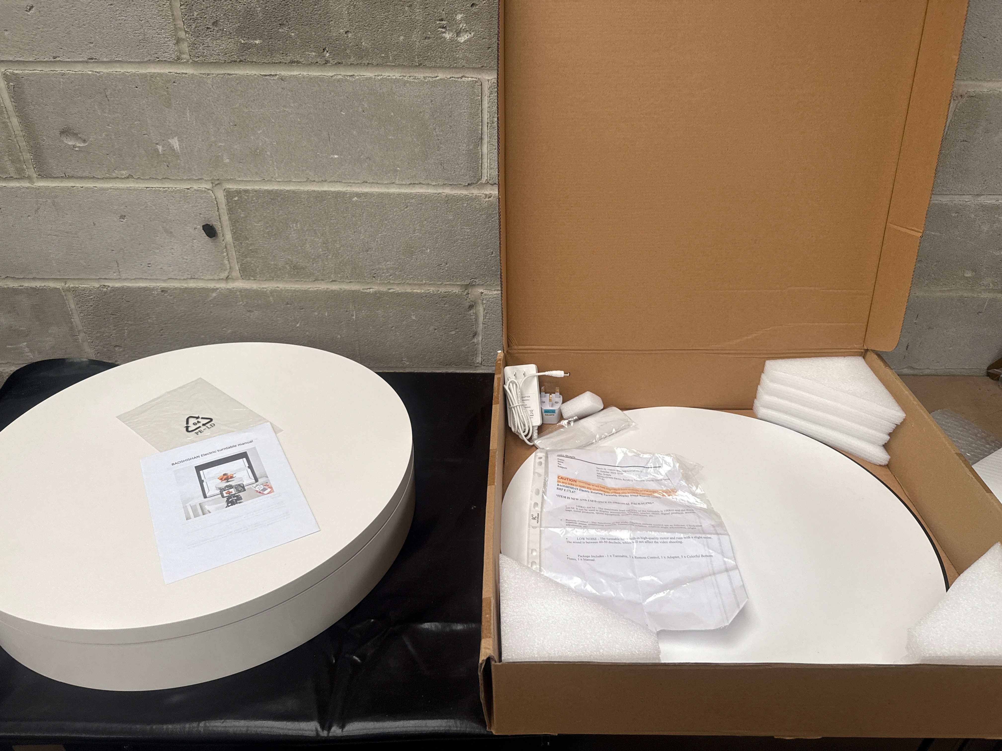 A BAOSHISHAN Electric Rotating Turntable Display Stand, contemporary. The unit comprises a round, white turntable base and a corresponding top plate, constructed from plastic or a composite material. It is designed to support items up to 100KG. Visible accessories include a power adapter, a BAOSHISHAN branded multi-function remote control, and an instruction manual. The object is identified for product display photography, offering functions such as clockwise, continuous, intermittent rotation, and angle adjustment. Documentation states the inclusion of five colorful bottom plates. The item is presented in its original cardboard packaging with foam inserts.