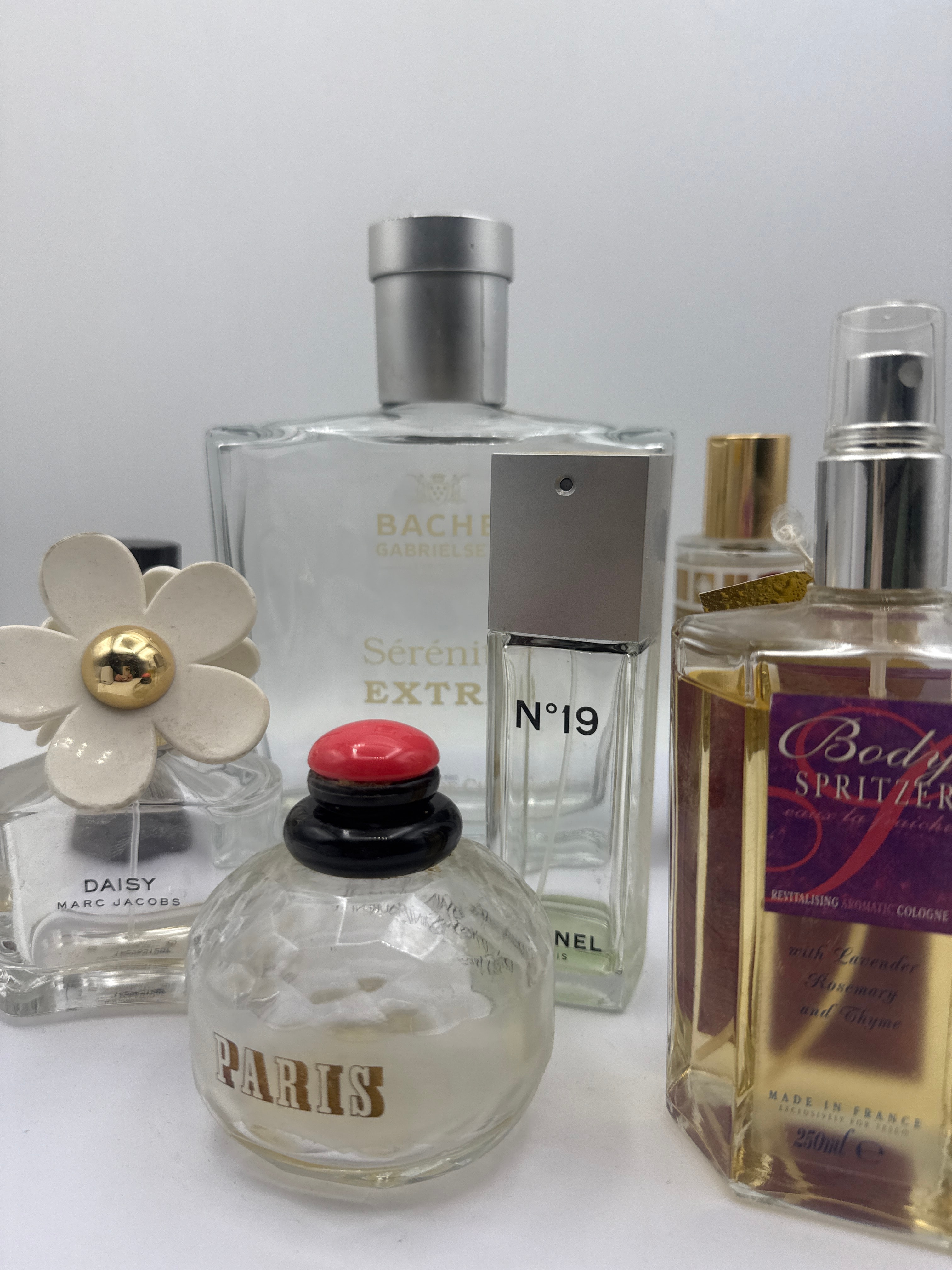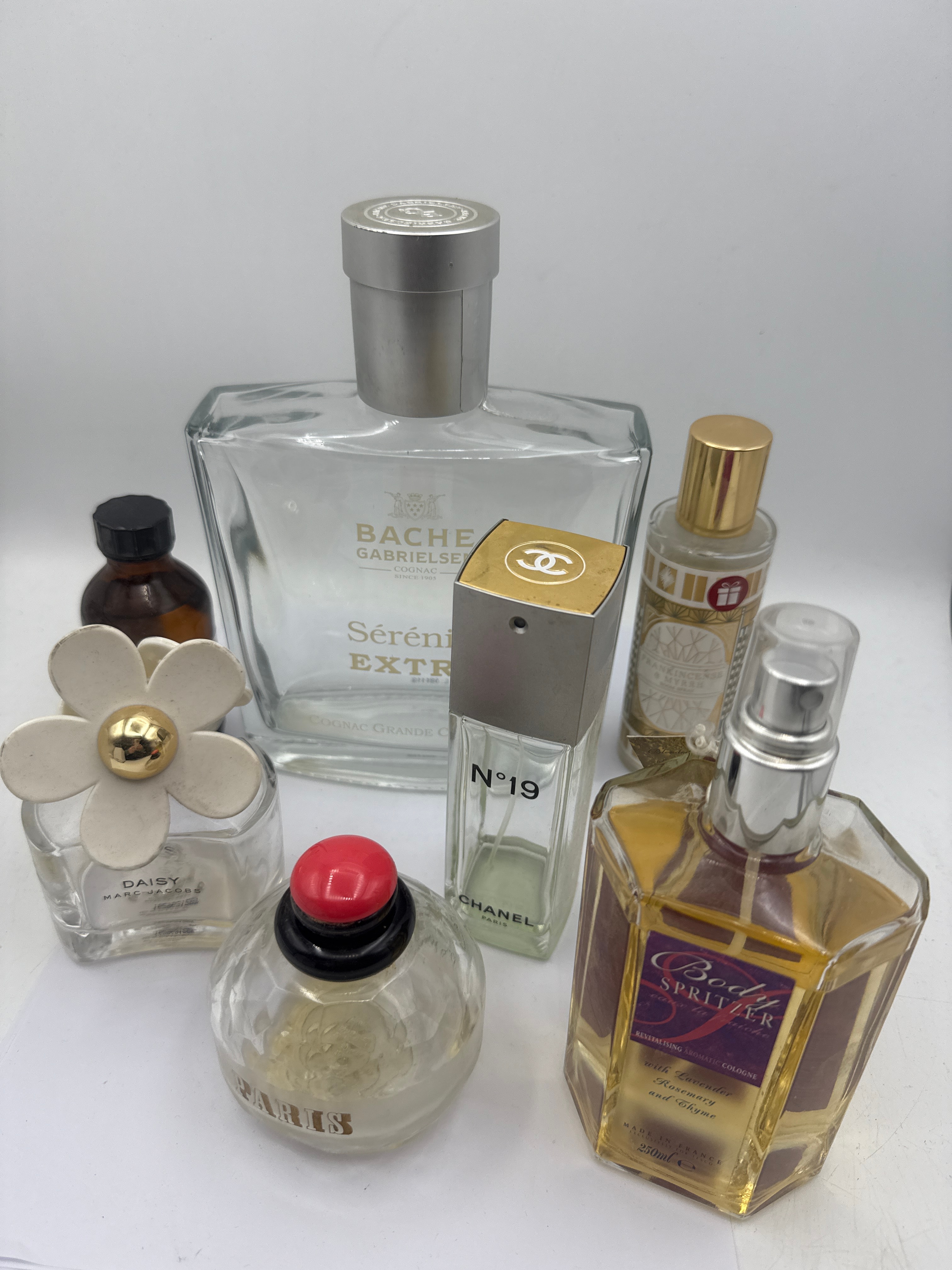 A collection of seven glass bottles, primarily for fragrance or spirits. The collection includes one large rectangular clear glass bottle, labeled “BACHE-GABRIELSEN SÉRÉNITÉ EXTRÊME COGNAC GRANDE CHAMPAGNE 250ml e” with a silver-tone cap, identified in web intelligence as a collector’s empty cognac bottle. Also present is one clear glass bottle with a distinctive white floral cap, labeled “DAISY MARC JACOBS”. Another rectangular clear glass bottle features a silver-tone cap and is labeled “N°19 CHANEL”. A round clear glass bottle with a red cap is labeled “PARIS”. One faceted clear glass bottle with a pump spray is labeled “Body SPRITZER eau de fraiche Lavender Rosemary and Thyme MADE IN FRANCE 250ml e.” The collection is completed by two smaller bottles: one dark brown glass bottle and one clear glass bottle with a gold-tone cap, both lacking clearly visible identifying text. The bottles are predominantly clear glass with various plastic or metal caps, and some feature paper labels.