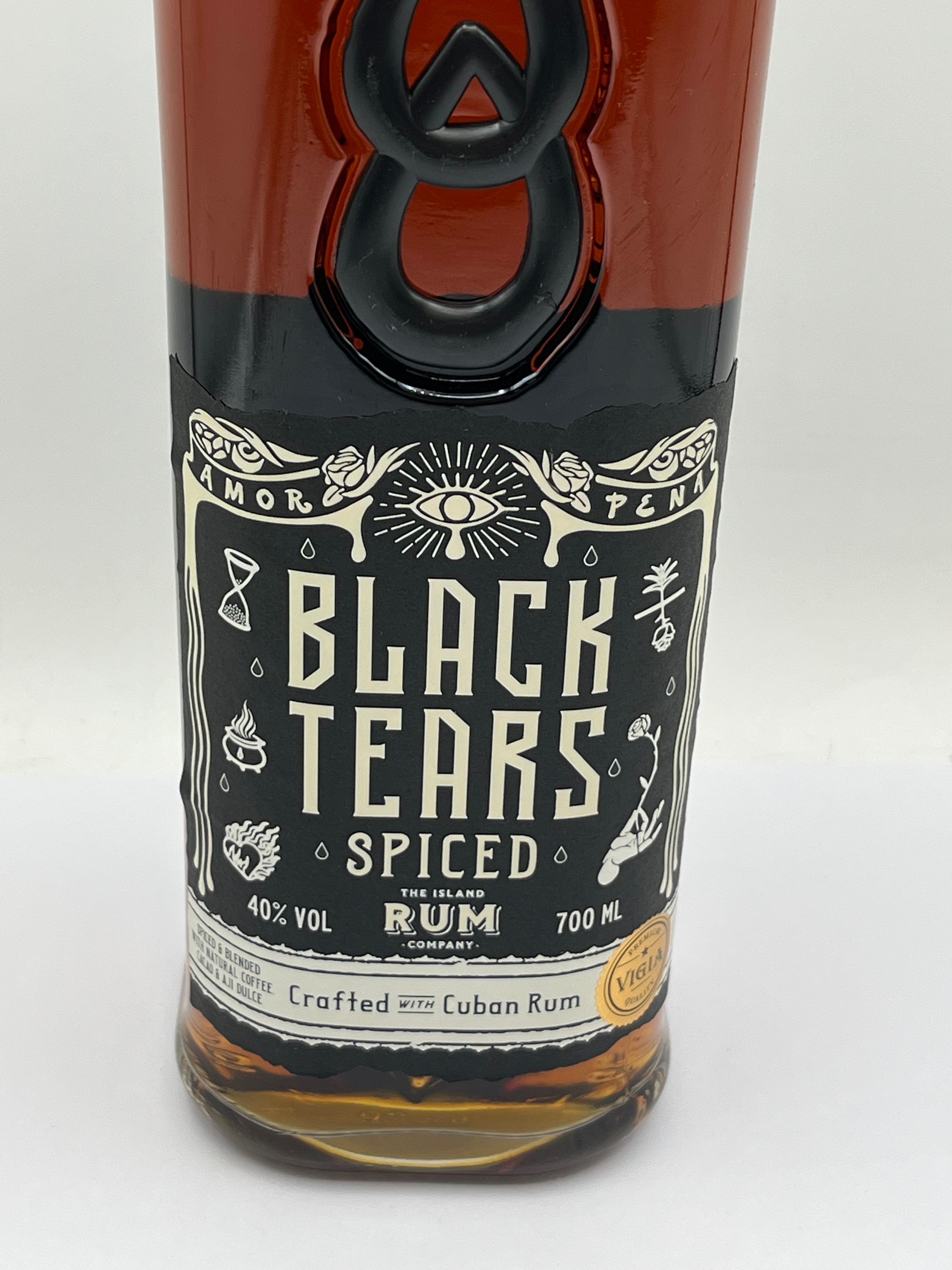 A bottle of Black Tears Spiced Rum. This contemporary glass bottle contains a dark amber liquid and features a modern, gothic-inspired aesthetic. The bottle is distinguished by an embossed ‘8’ or infinity symbol and is adorned with black and white labels depicting mystical imagery including an eye, tears, and an hourglass. Key text visible on the labels includes “BLACK TEARS SPICED RUM,” “THE ISLAND RUM COMPANY,” “40% VOL,” “700 ML,” and “Crafted With Cuban Rum.” The front label also bears the words “AMOR” (Love) and “PENA” (Sorrow/Pain). The back label provides further product information, company details for The Island Rum Company (Denmark), and a “FOR THE UK MARKET” sticker with a unique HM Revenue & Customs code.