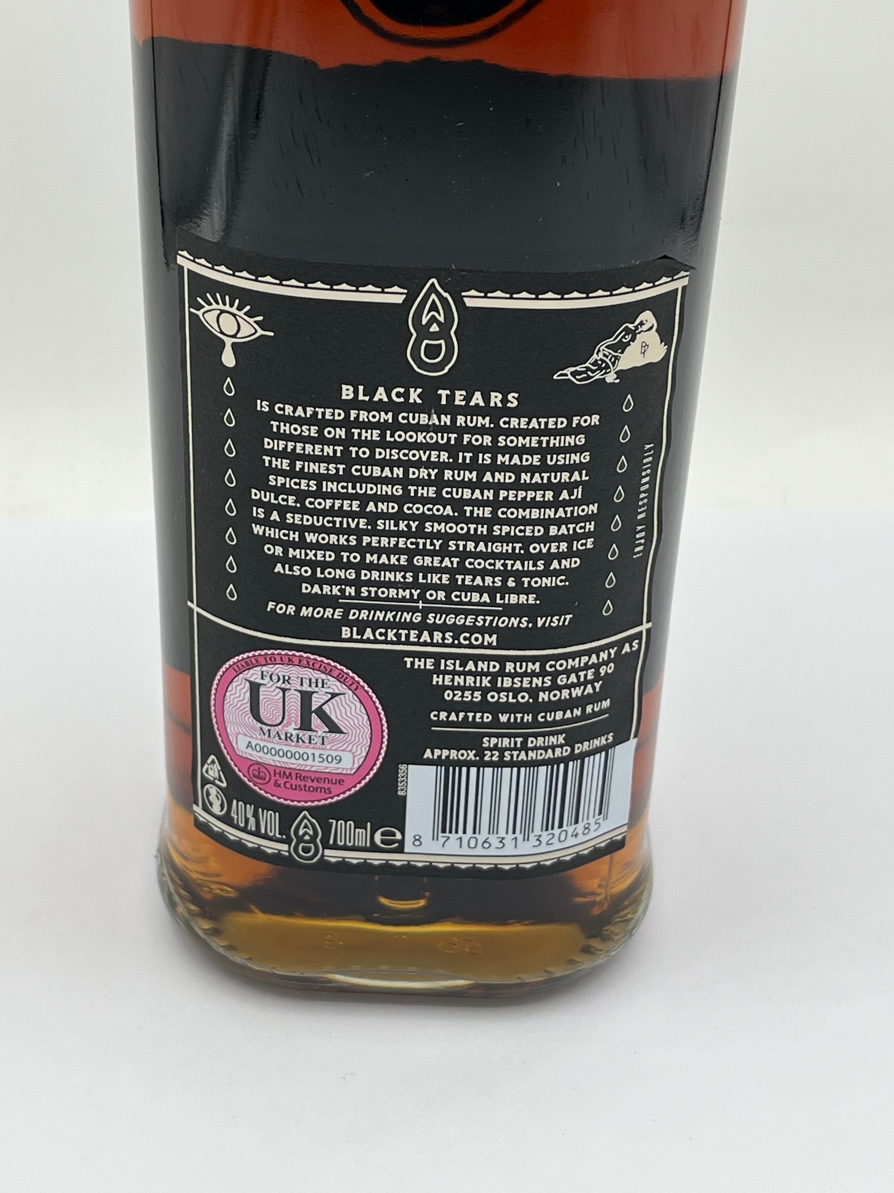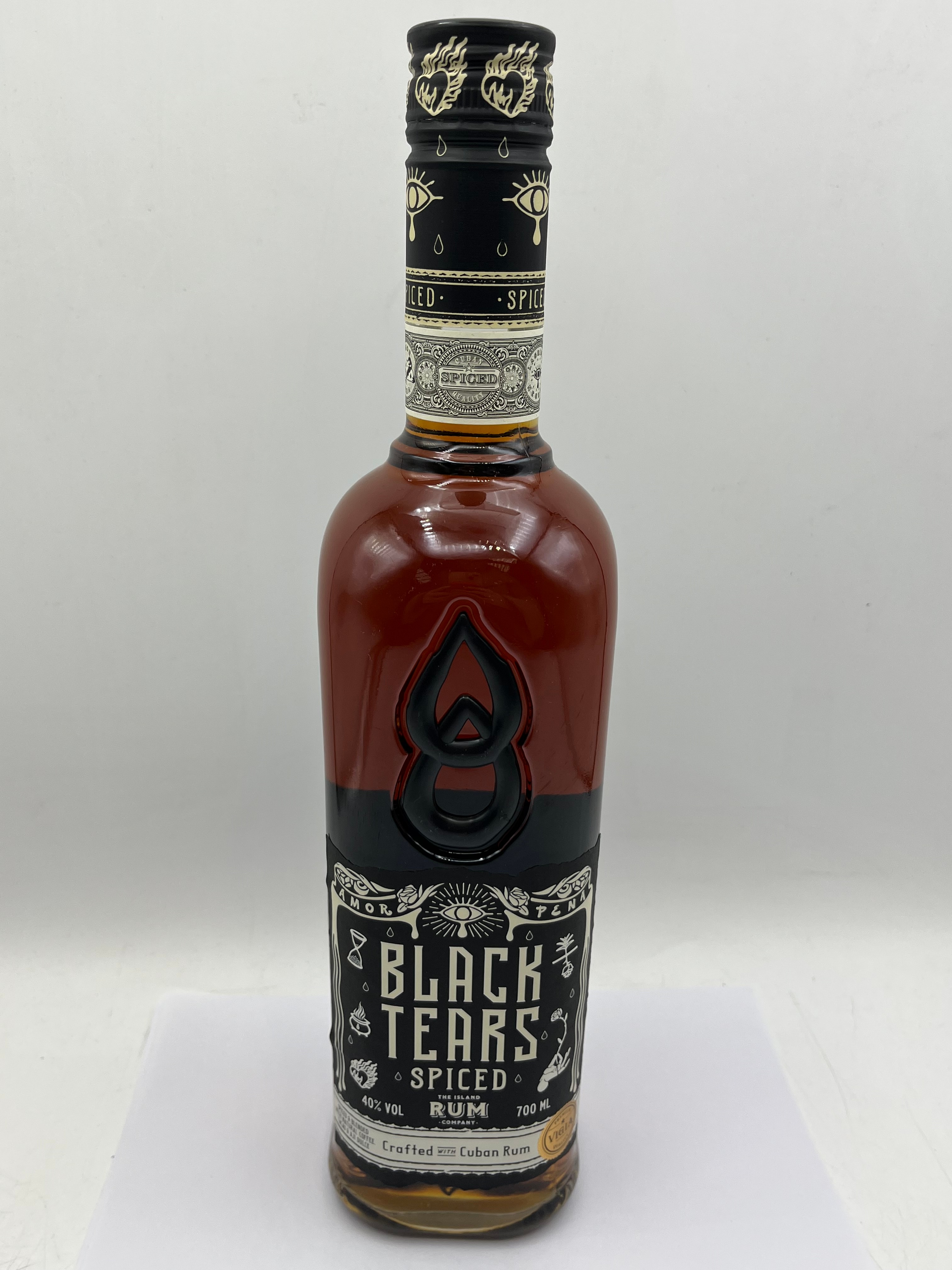 A modern, sealed glass bottle of Black Tears Spiced Rum, featuring dark reddish-brown liquid contents. The bottle’s contemporary design includes a prominent raised black ‘8’ or infinity symbol, complemented by black and white paper labels with gold accents. The main label displays “BLACK TEARS SPICED RUM” in a gothic-inspired font, adorned with mystical iconography such as an eye, teardrops, an hourglass, and a burning chalice, and includes the translated words “AMOR” (Love) and “PENA” (Sorrow/Grief) at the top corners. The black metal screw-cap also features eye and teardrop motifs. Visible text indicates “40% VOL”, “700 ML”, and that it is “Crafted WITH Cuban Rum”. The reverse label provides product information, company details (“THE ISLAND RUM COMPANY” in Oslo, Norway), and a “FOR THE UK MARKET” stamp from HM Revenue & Customs, along with a barcode.