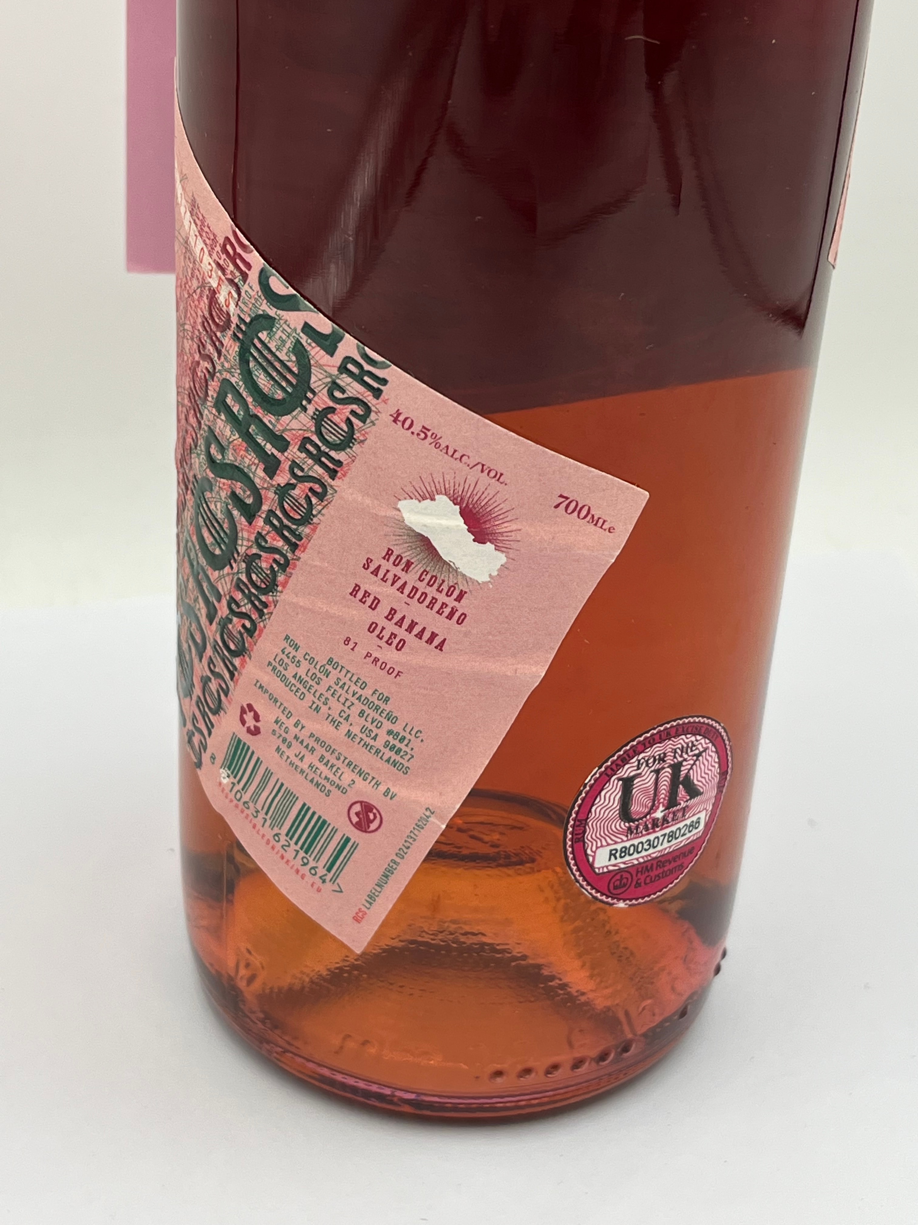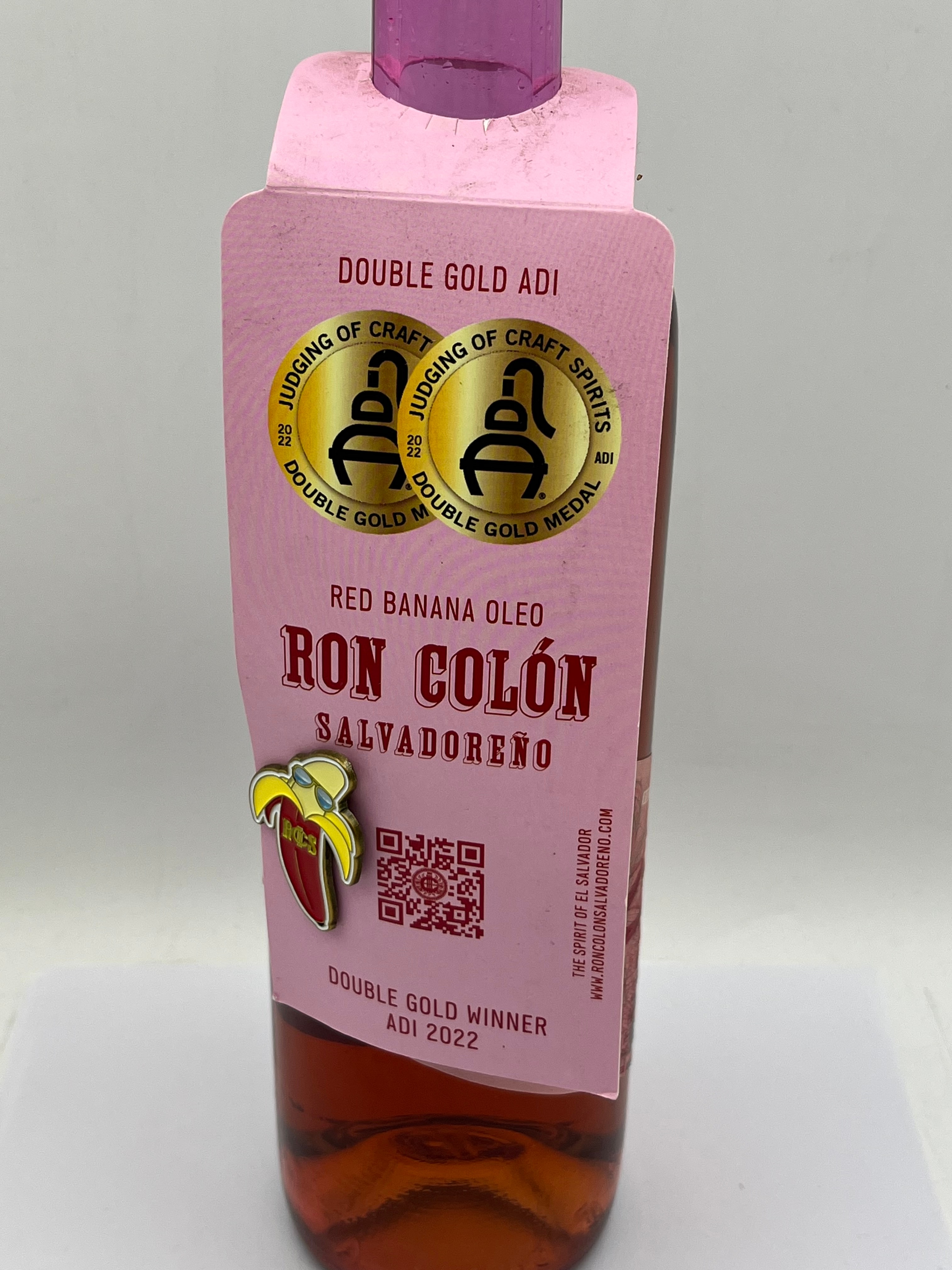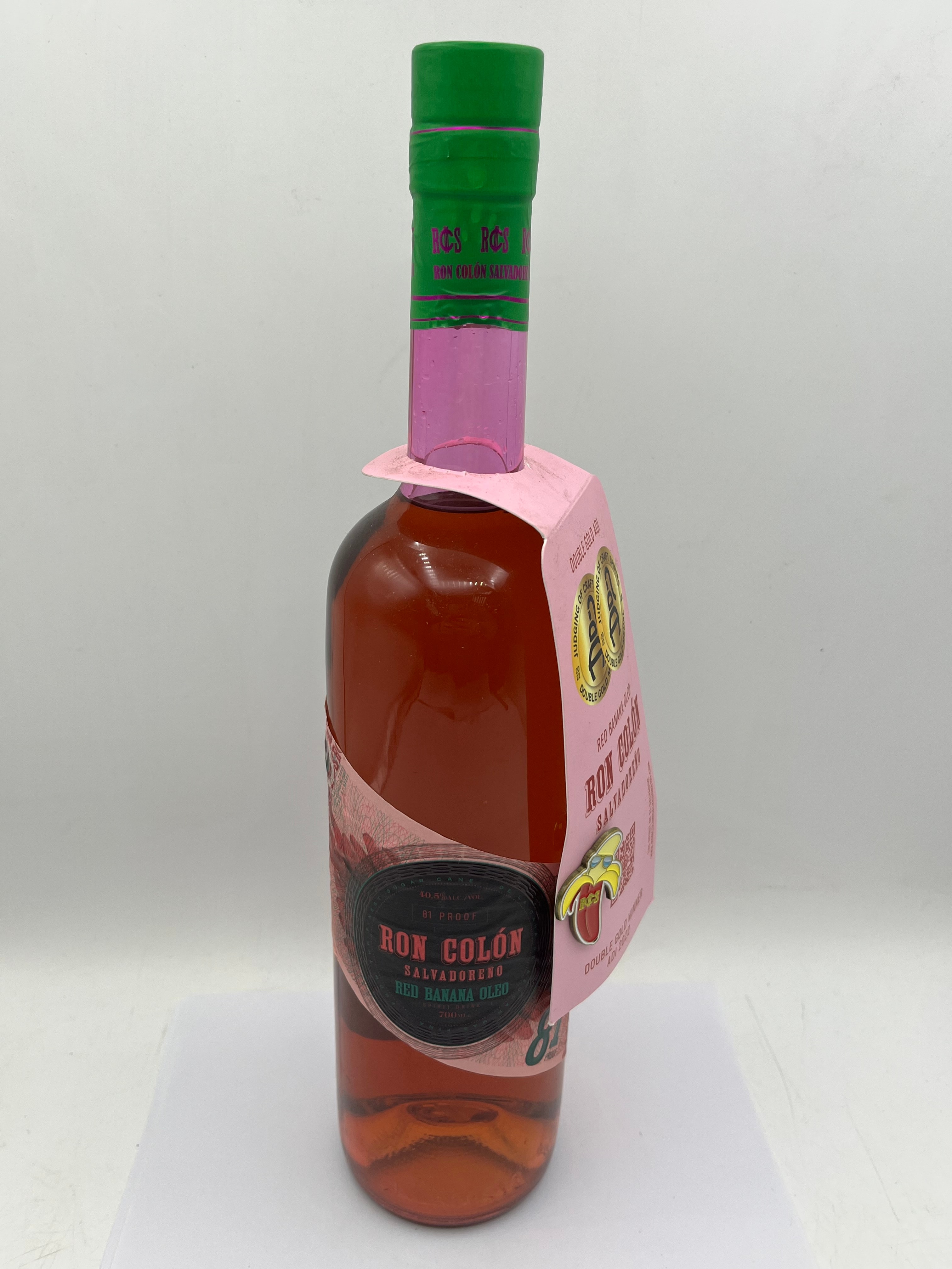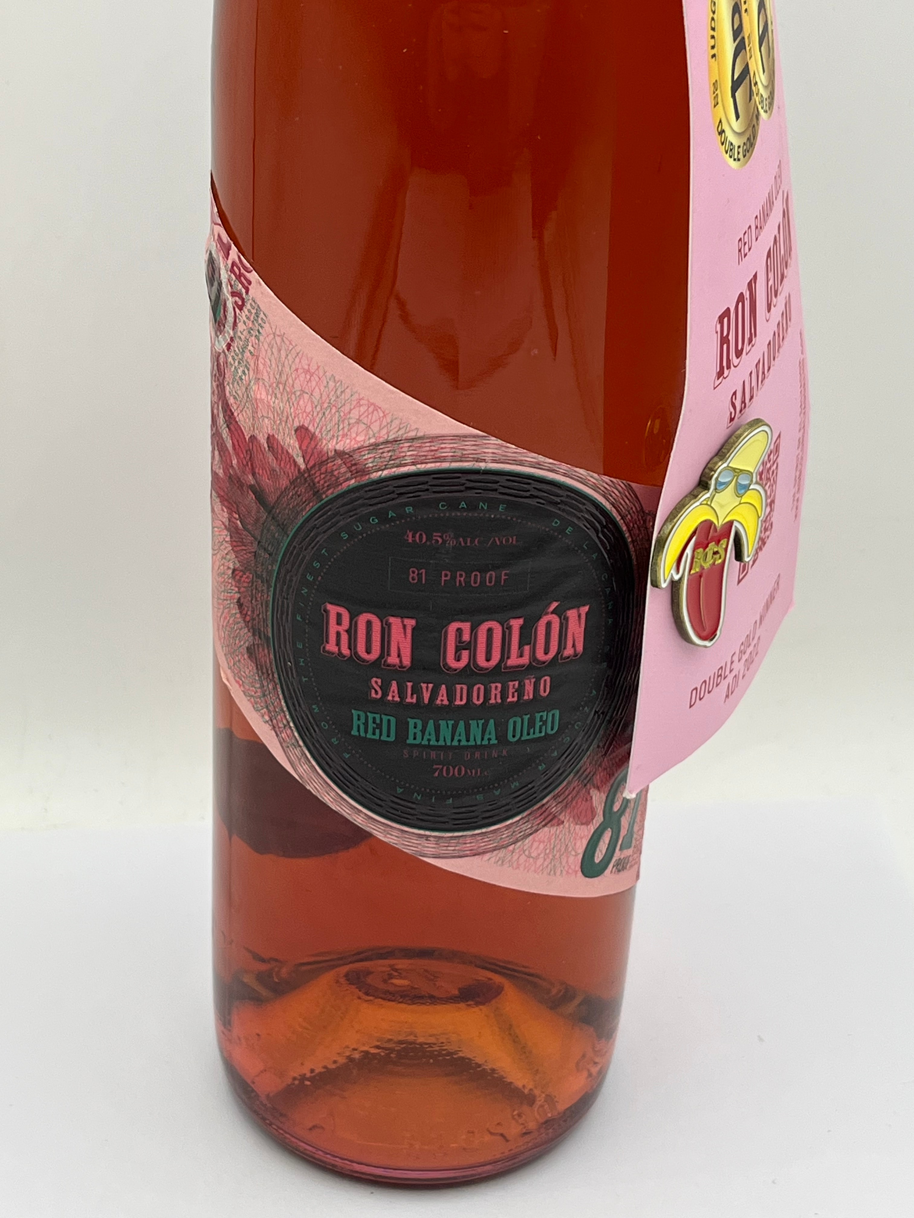 A contemporary, unopened 700ml glass bottle of Ron Colón Salvadoreño Red Banana Oleo Rum, bottled at 40.5% ALC/VOL (81 PROOF). The bottle features a vibrant green cap with pink “RCS RON COLÓN SALVADOREÑO” text. It is adorned with multiple paper labels on the neck and body, including a main label with a banana graphic. A prominent pink hanging tag highlights two “DOUBLE GOLD ADI 2022” awards from the “JUDGING OF CRAFT SPIRITS” and is embellished with a small banana-shaped pin. A back label specifies production in the Netherlands for Ron Colón Salvadoreño LLC, Los Angeles, CA, and an additional sticker indicates “FOR THE UK MARKET.”