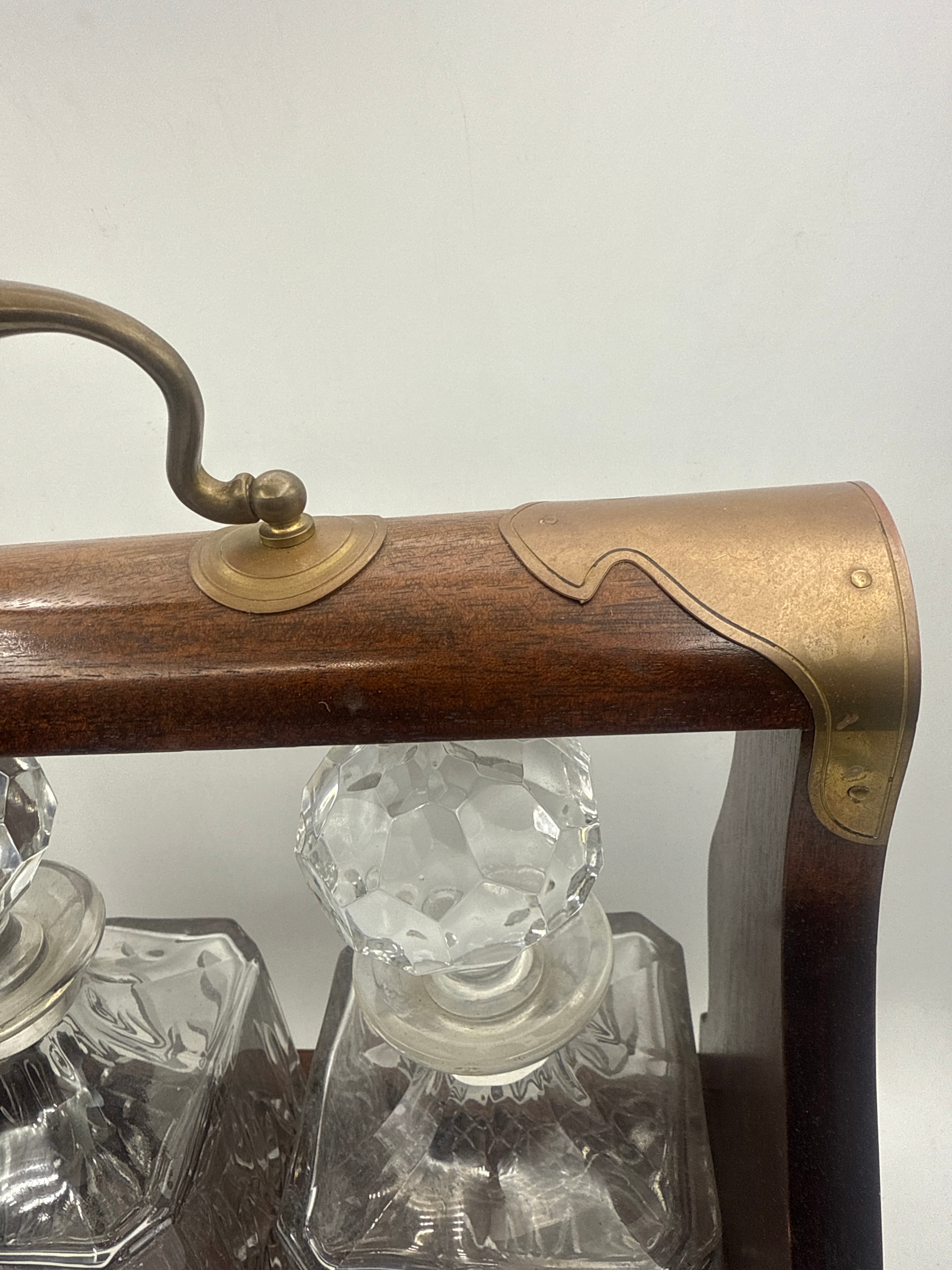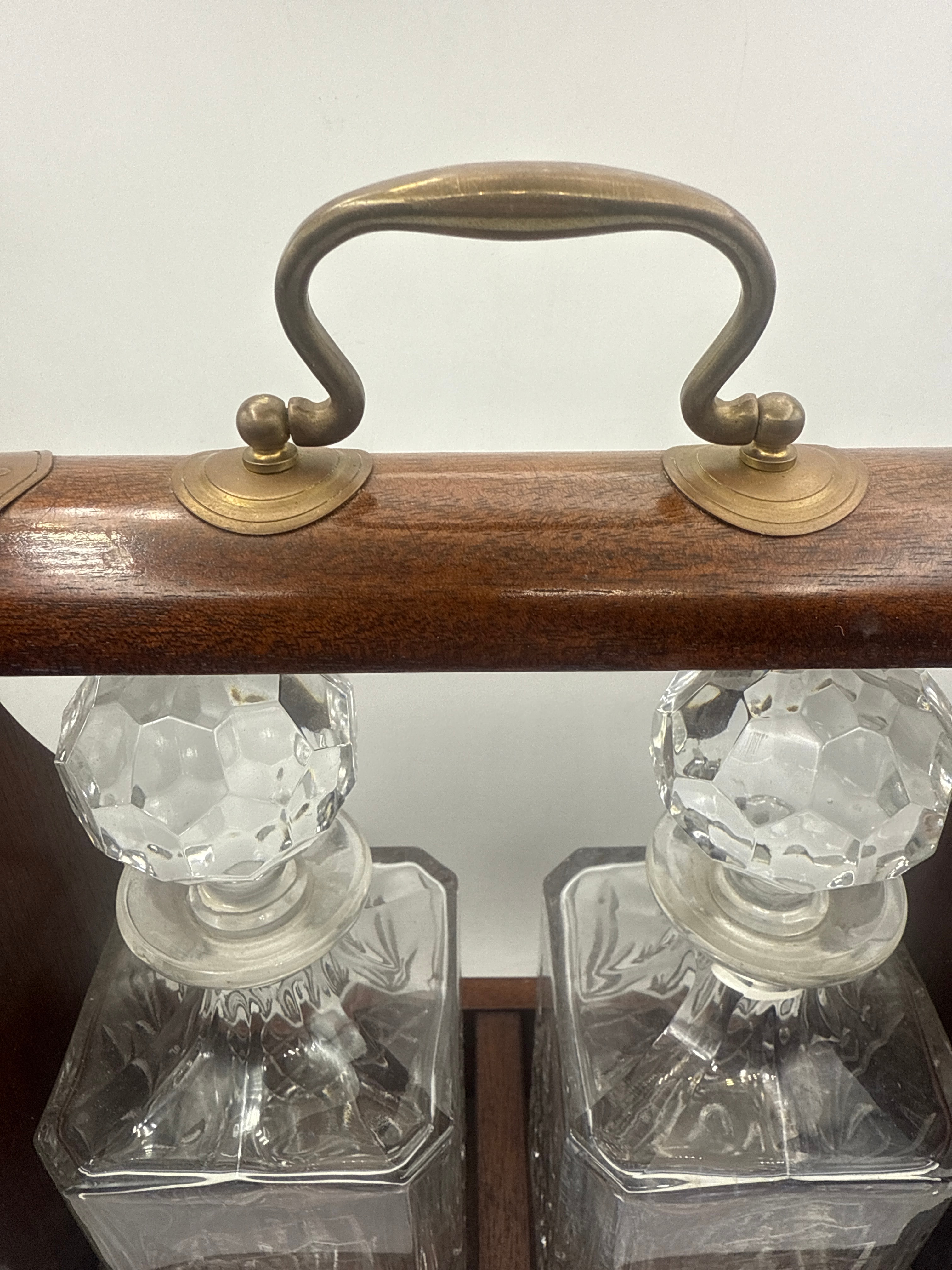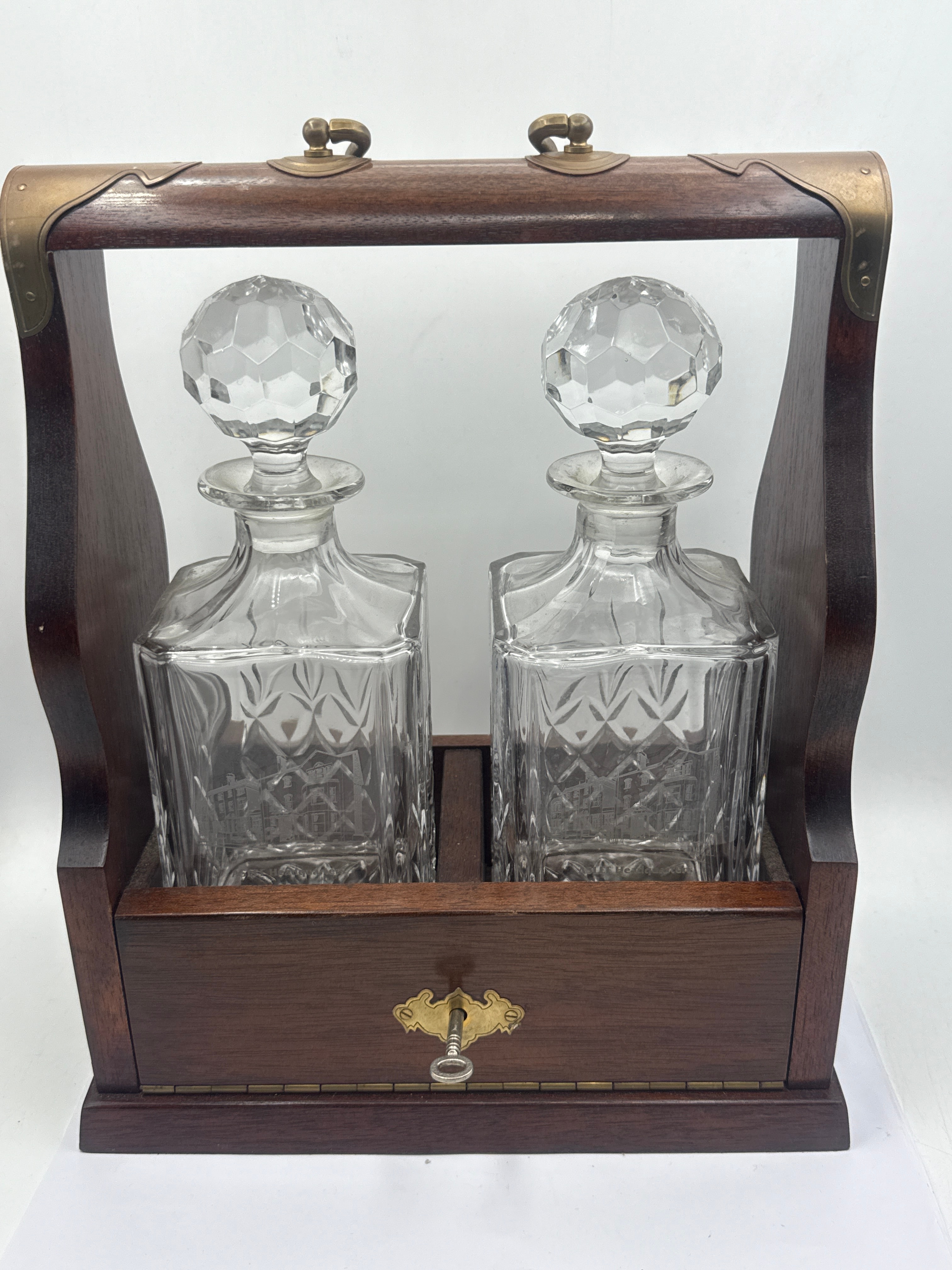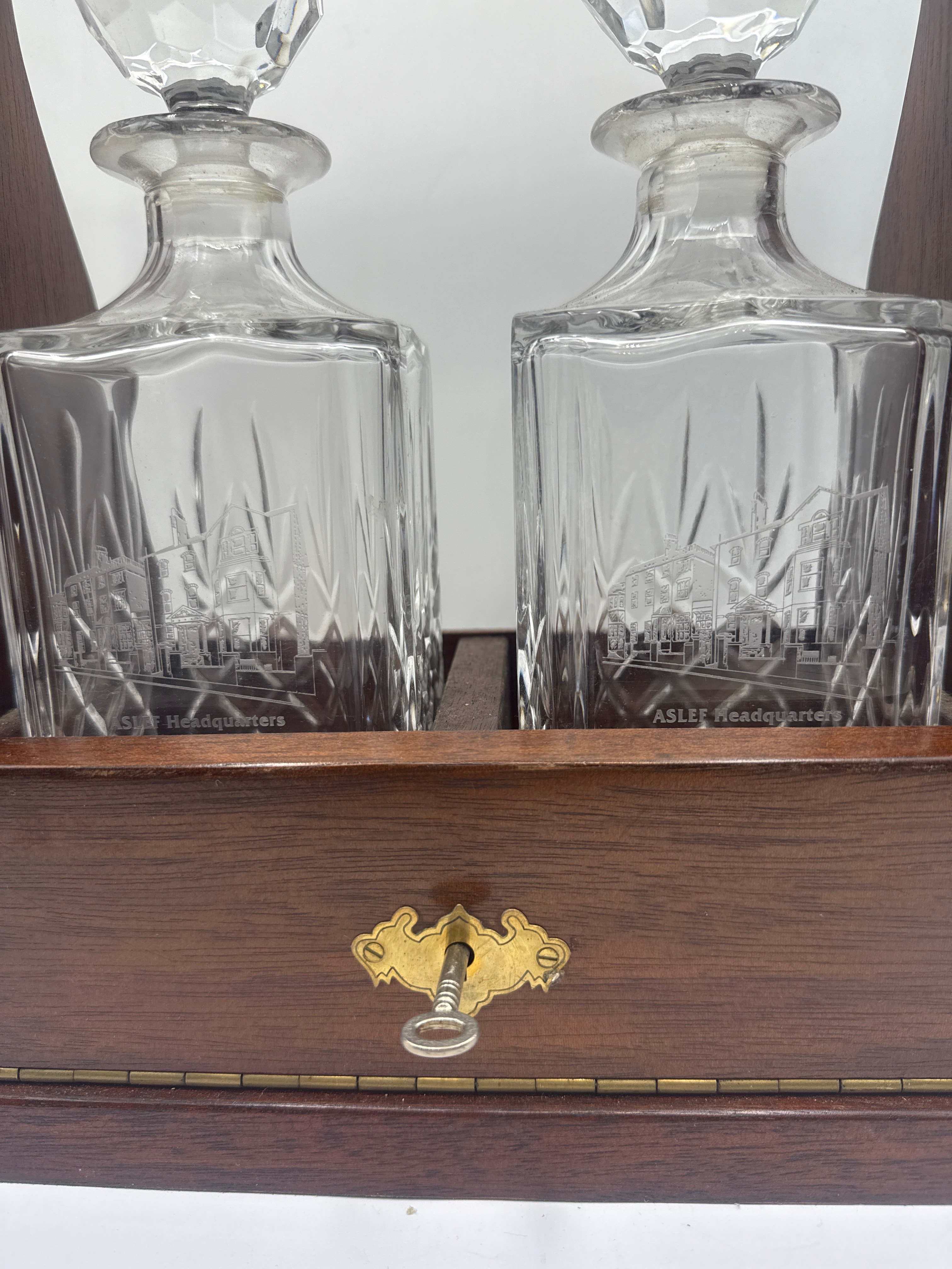 An Irish two bottle tantalus with crystal decanters. Crafted from dark polished wood with brass fittings, including corner reinforcements, a top carrying handle, and a decorative key escutcheon with a key. It houses two identical square-bodied clear cut glass decanters, each featuring a faceted geometric pattern on its lower half and a large faceted spherical stopper. Both decanters are etched with a building outline above the inscription ‘ASLEF Headquarters,’ suggesting a commemorative purpose.