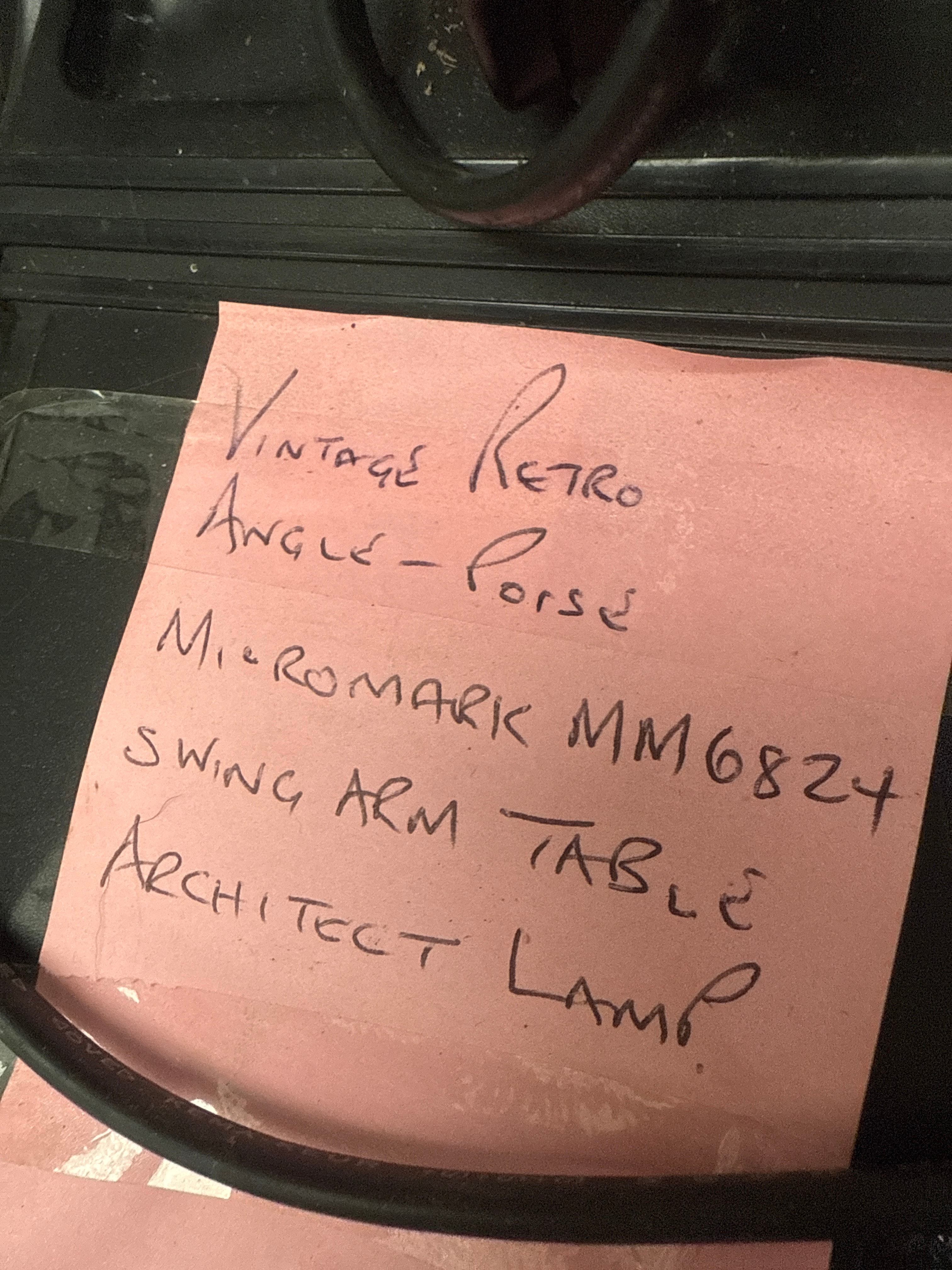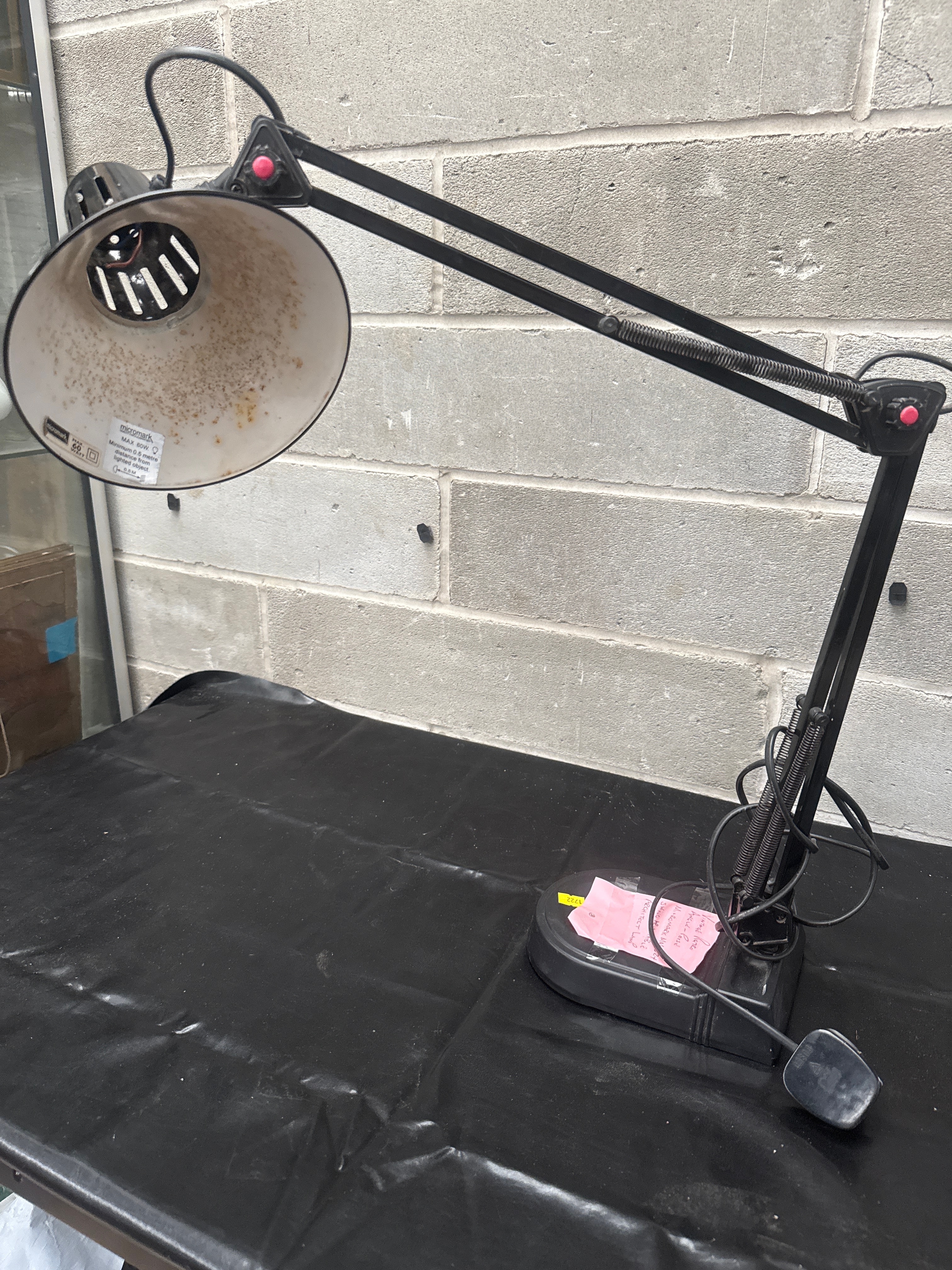 A Micromark MM6824 Anglepoise-style swing-arm desk lamp, described by the user as a “Vintage Retro Angle-Poise Micromark MM6824 Swing Arm Table Architect Lamp”. The lamp is primarily constructed of black-painted metal with plastic components, featuring a weighted base and a flared conical shade. A partially visible label on the shade confirms “micromark”. The design is characteristic of vintage architect or drafting lamps.