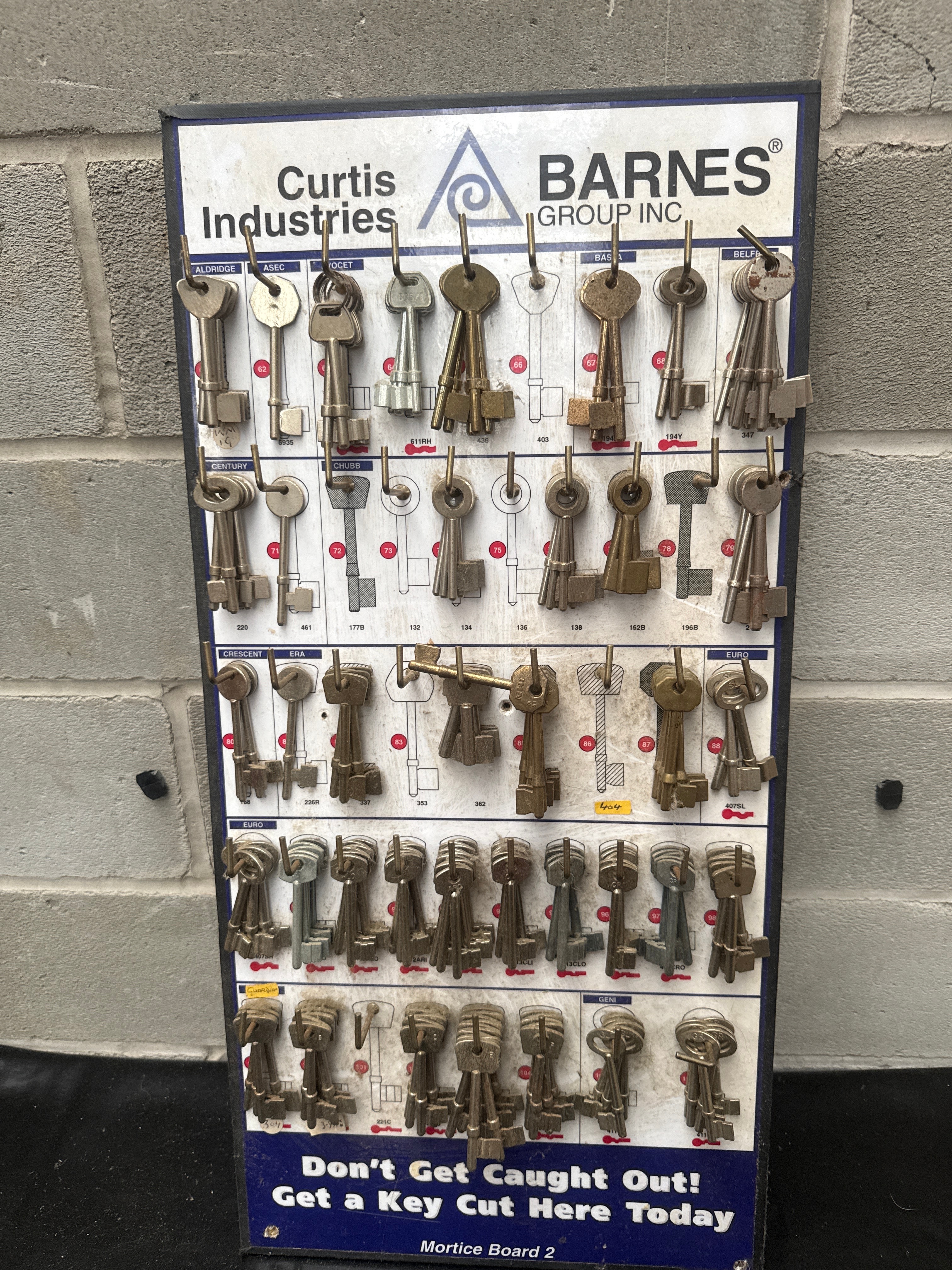 A modern Curtis Industries and Barnes Group Inc. multi-tiered laminated key cutting reference display board, designed for retail use. The board features numerous brass and steel keys of various styles and sizes, individually hung on metal hooks, serving as samples for different lock manufacturers. Key brands visible include ALDRIDGE, ASEC, AVOCET, BAST, BELFRY, CENTURY, CHUBB, CRESCENT, ERA, and EURO, each associated with numerical identifiers. The top of the board displays “Curtis Industries” and “BARNES GROUP INC,” while the bottom has promotional text stating, “Don’t Get Caught Out! Get a Key Cut Here Today Mortice Board 2.”