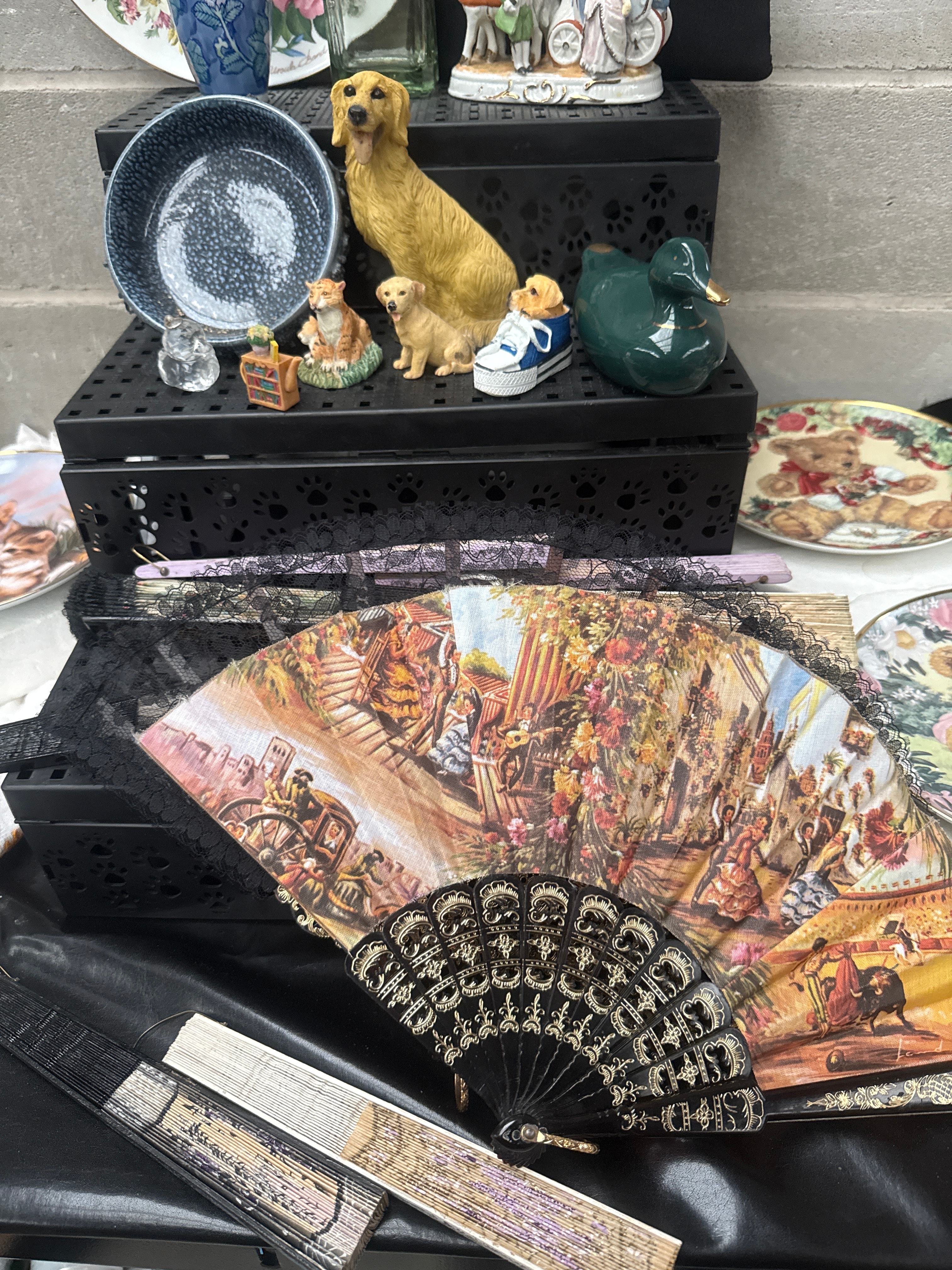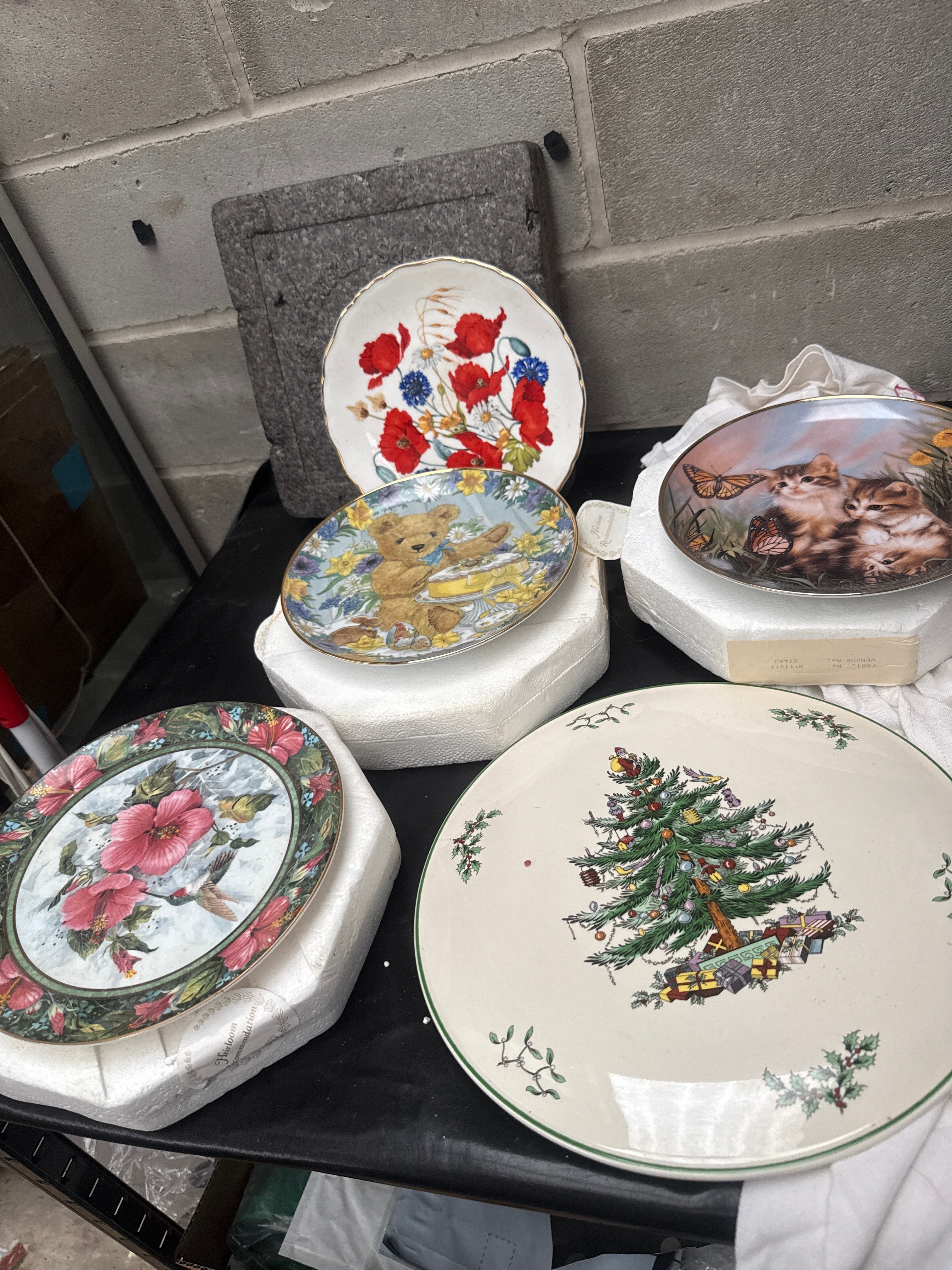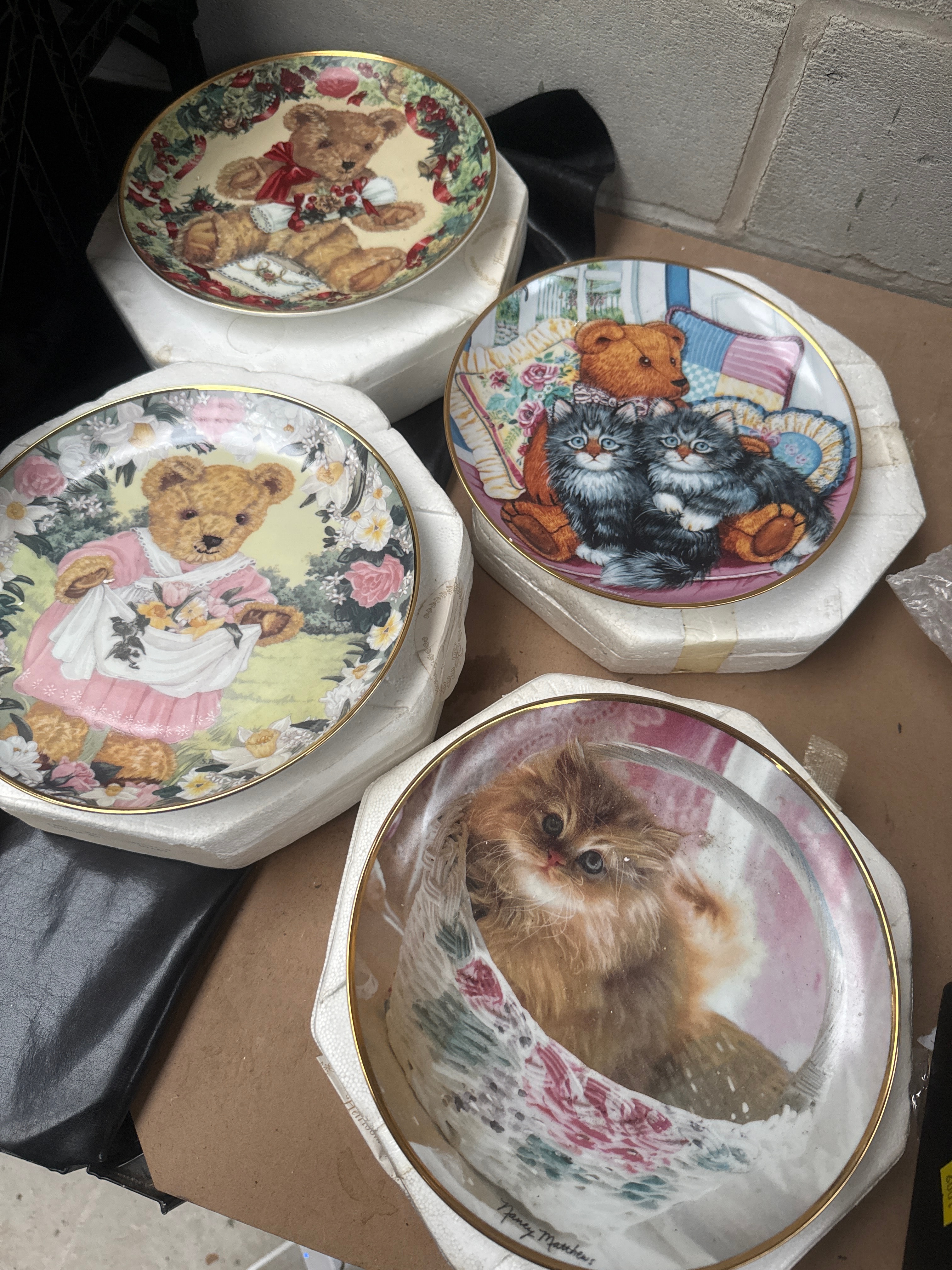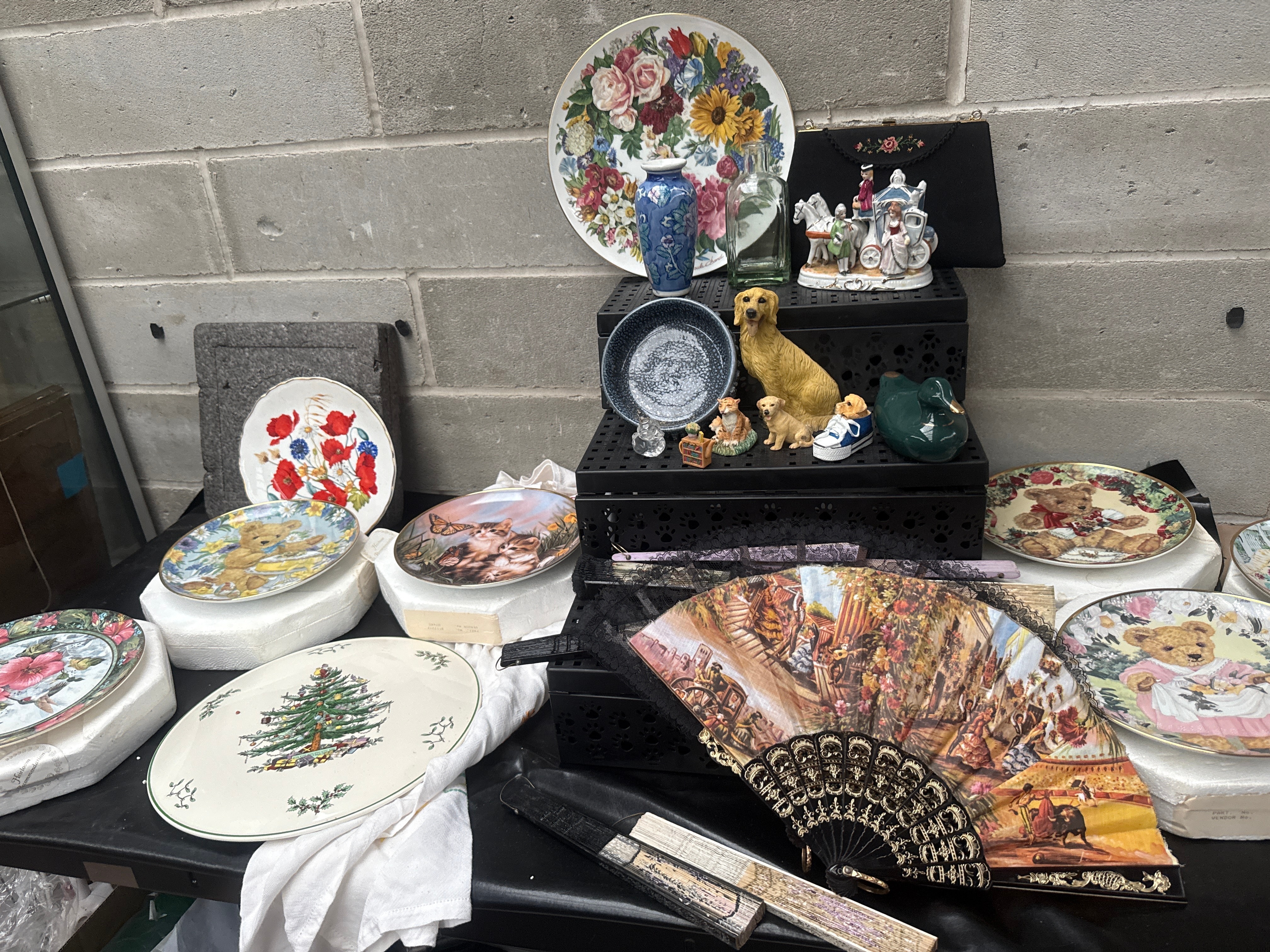 A diverse collection of modern decorative items, prominently featuring collectible ceramic and porcelain plates by Franklin Mint, Spode, and Royal Albert. These plates typically feature gilded rims and sentimental themes including teddy bears, kittens, butterflies, floral motifs, and a Christmas tree design. One plate is signed ‘Nancy Marzons’. Also included are a group of ceramic and resin figurines, such as a Rococo-style horse-drawn carriage, dogs, cats, and a duck. Complementing these are a blue ceramic vase, a group of clear glass bottles and bowls, and a group of folding hand fans, one depicting a detailed Rococo-style printed scene and another crafted from black lace. A black embroidered fabric clutch is also present. Many plates are presented on display stands.