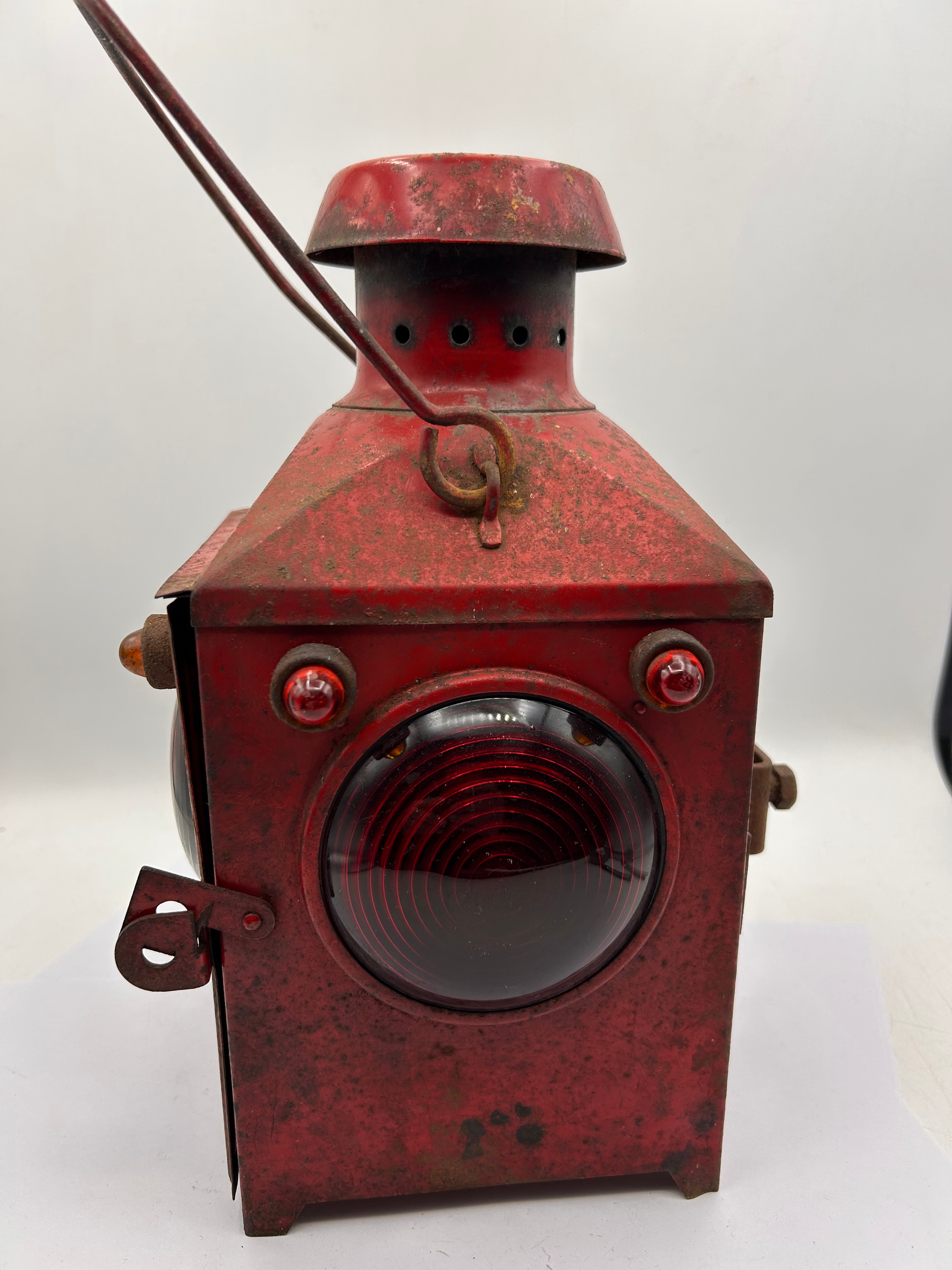 A vintage railway signal lantern, featuring a red-painted metal square body with a conical ventilation cap and a metal carrying handle. It is equipped with multiple glass lenses, including two large, round, ribbed Fresnel-style lenses—one clear and one red—on adjacent sides, complemented by smaller amber “jewel” lenses positioned above them. No visible manufacturer markings or text are discernible.