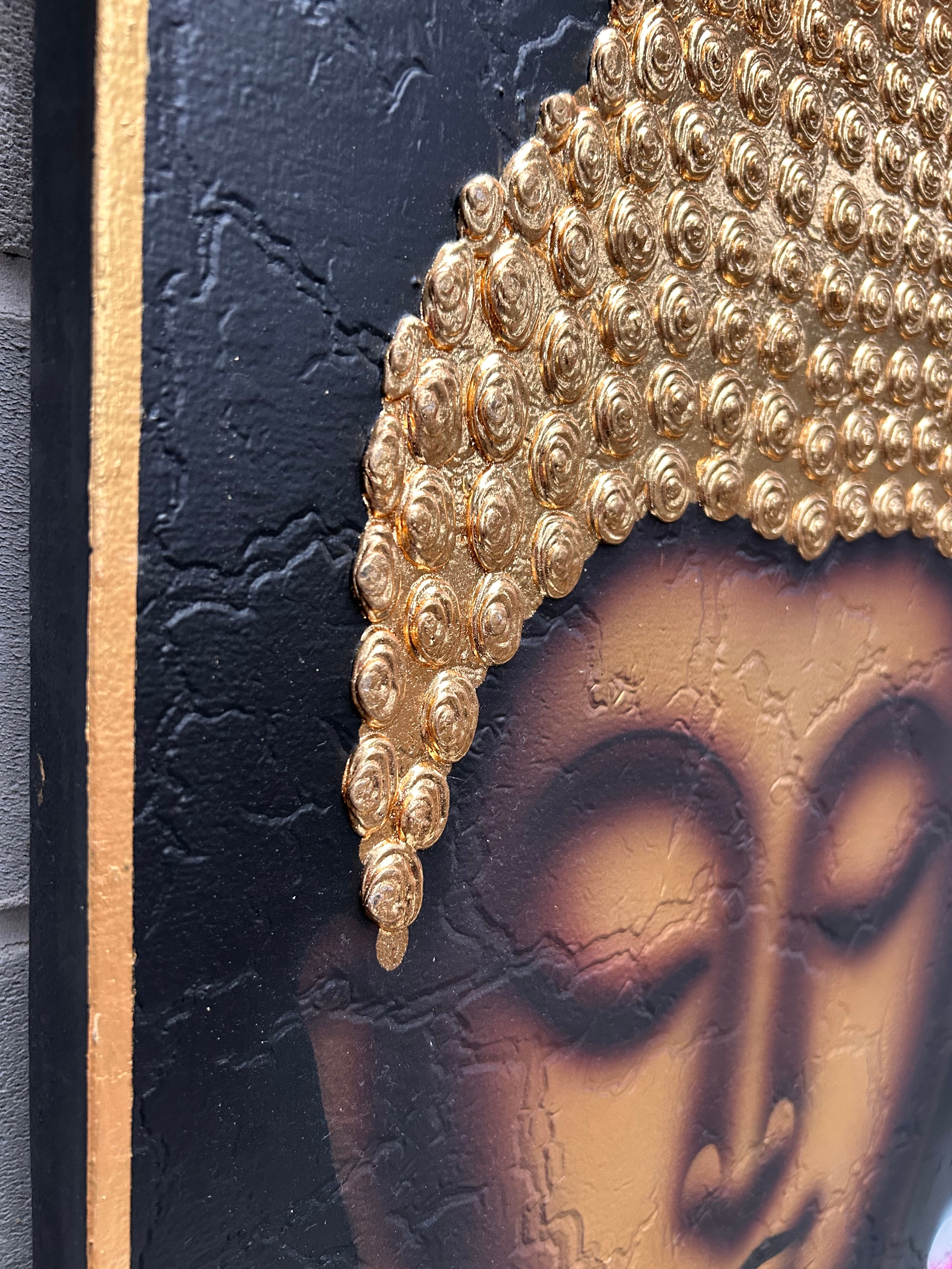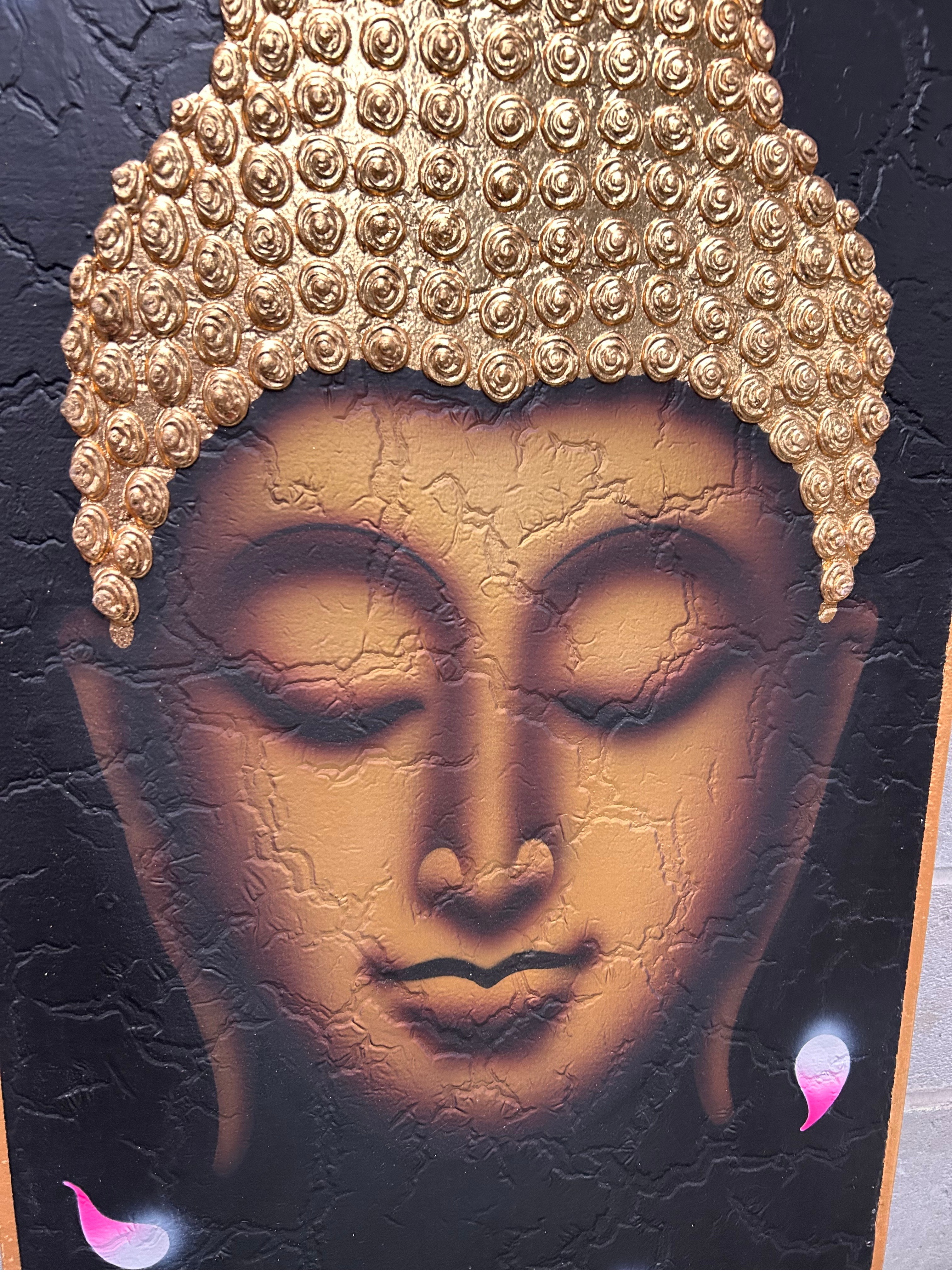 A modern mixed-media canvas wall art piece depicting the head of Buddha with closed eyes in a meditative pose. The artwork features a painted Buddha face with relief-textured, metallic gold embellishments for the ushnisha and hair curls, as well as an emanating flame and lotus leaf motifs, all set against a textured black background. Scattered abstract pink and white petal-like forms are also visible. The piece is framed with a simple gold-colored border.