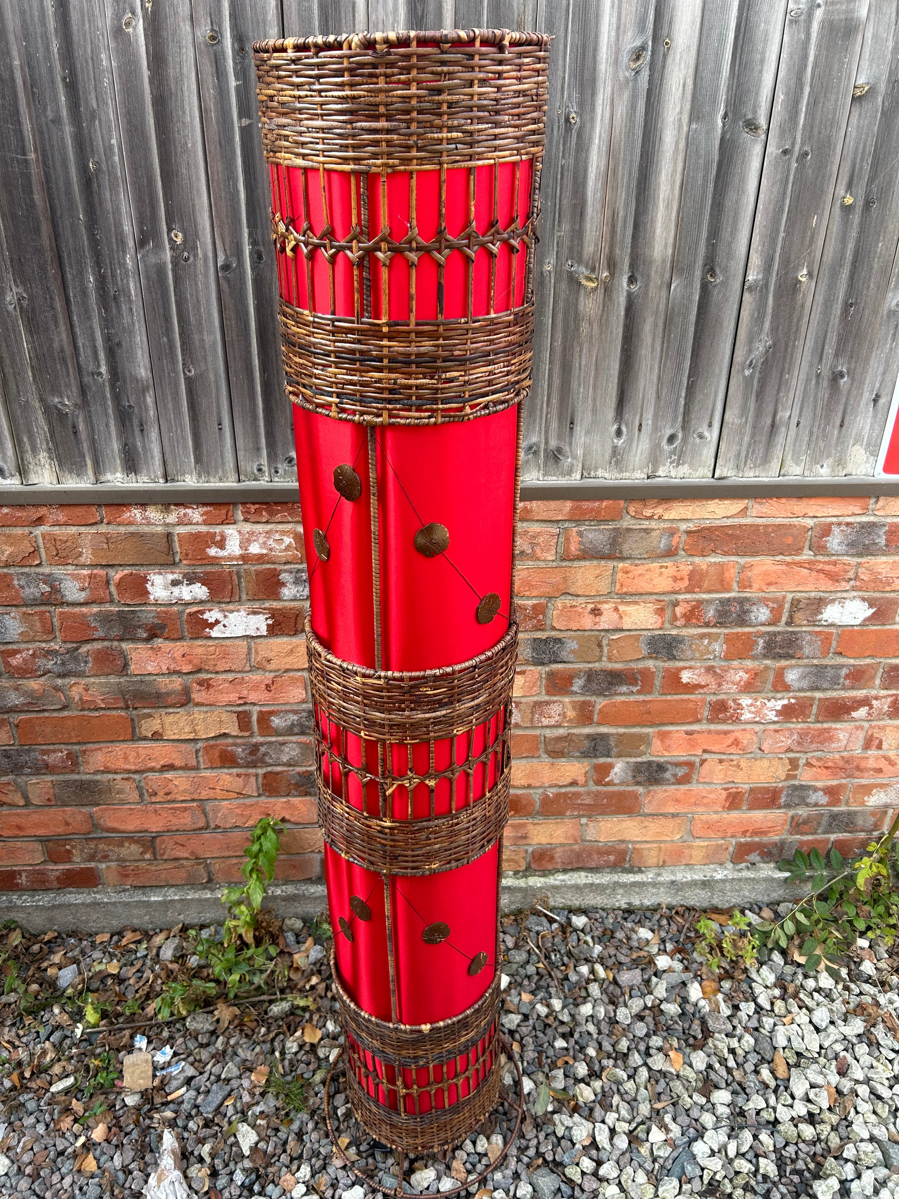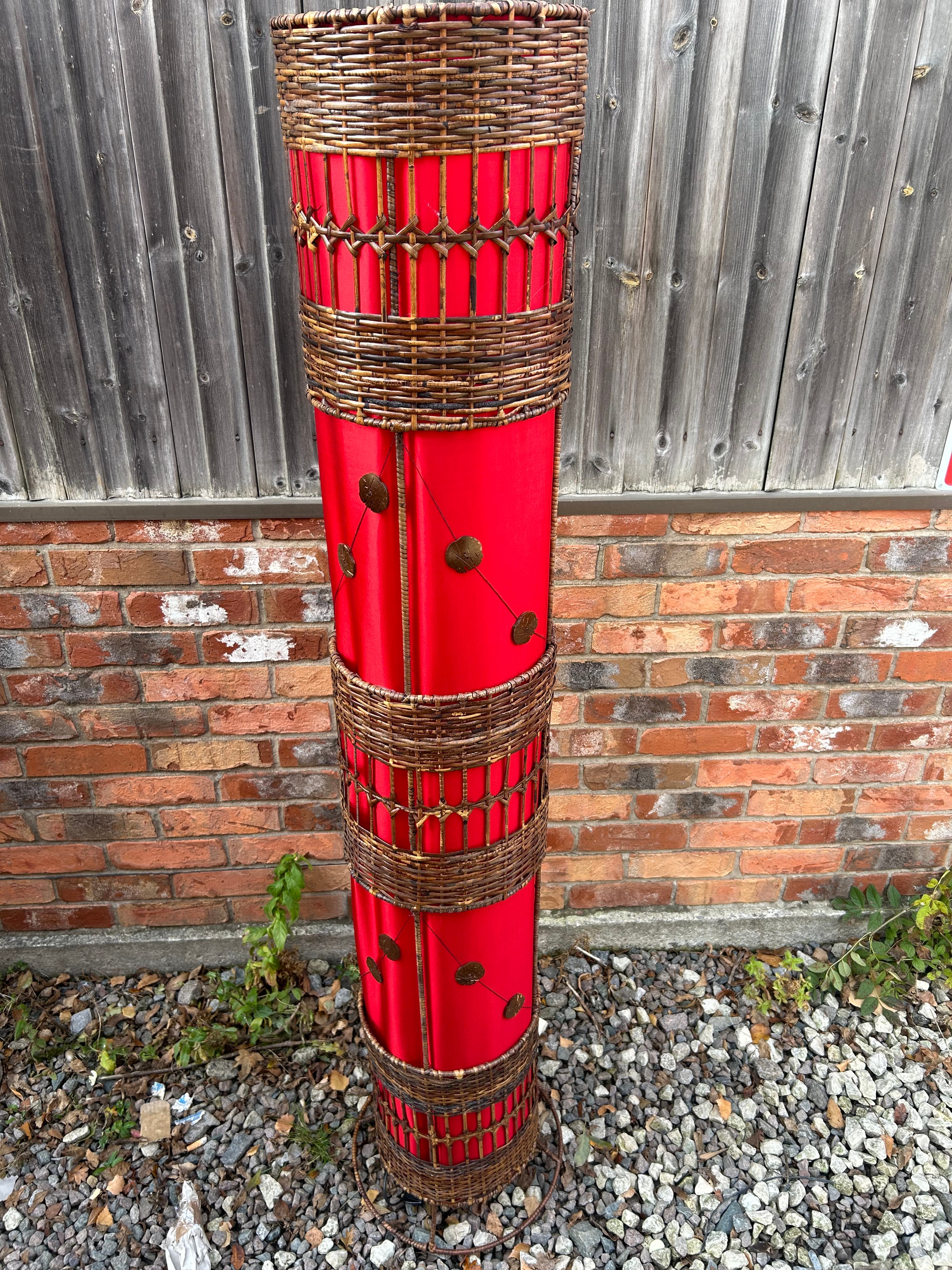 This tall, cylindrical decorative object, identified as a floor lamp, is constructed from Thai material. It features a segmented design with dark brown woven sections alternating with bright red fabric bands. The fabric sections are further embellished with clusters of dark, circular decorative elements. The style appears modern with an ethnic inspiration.